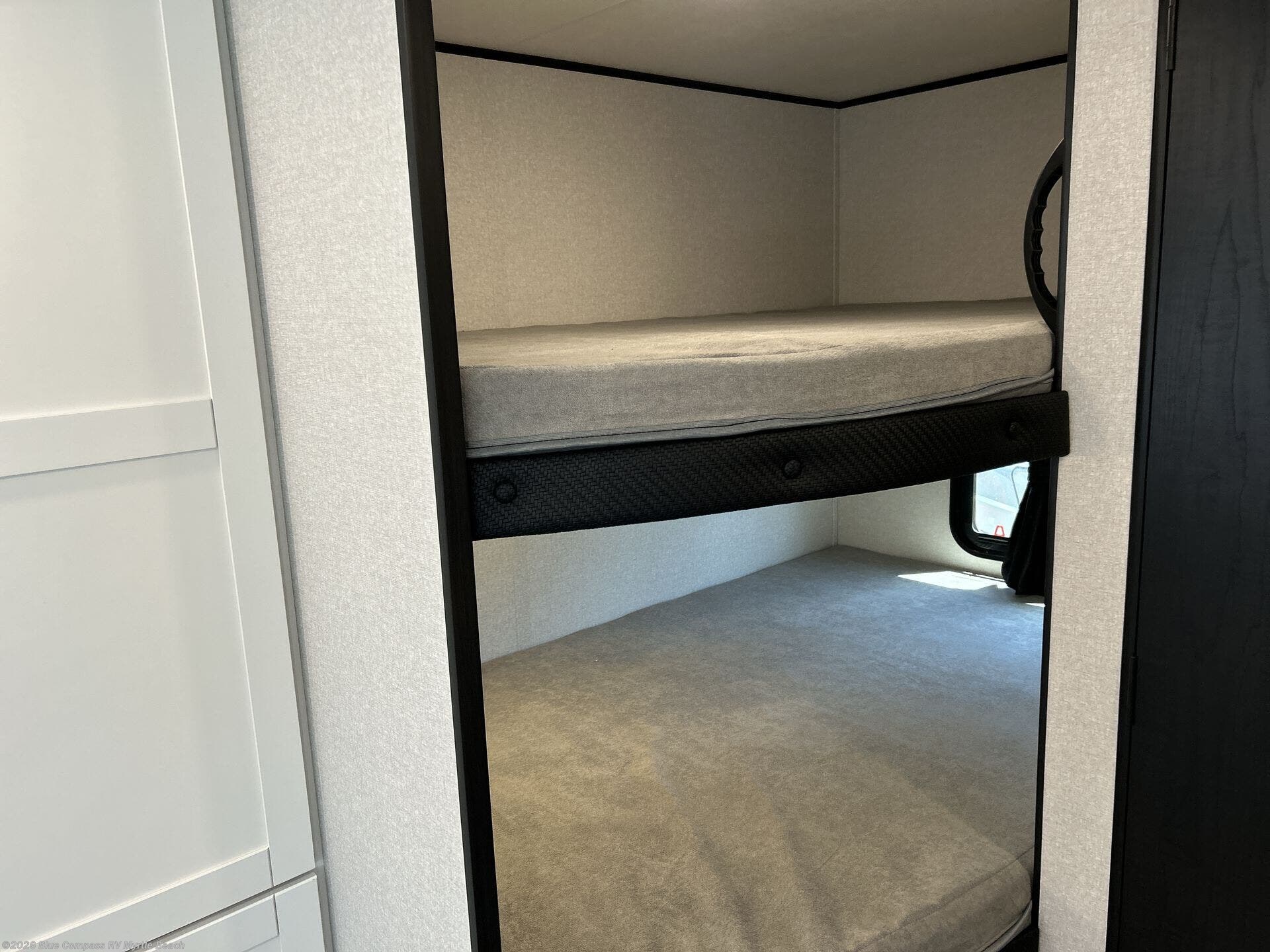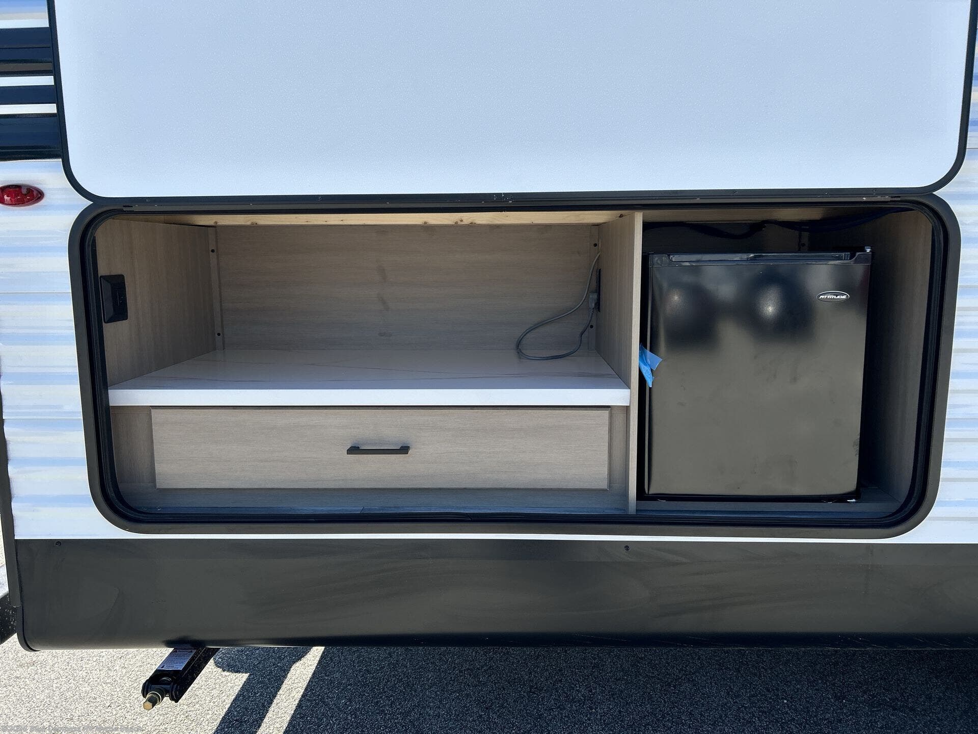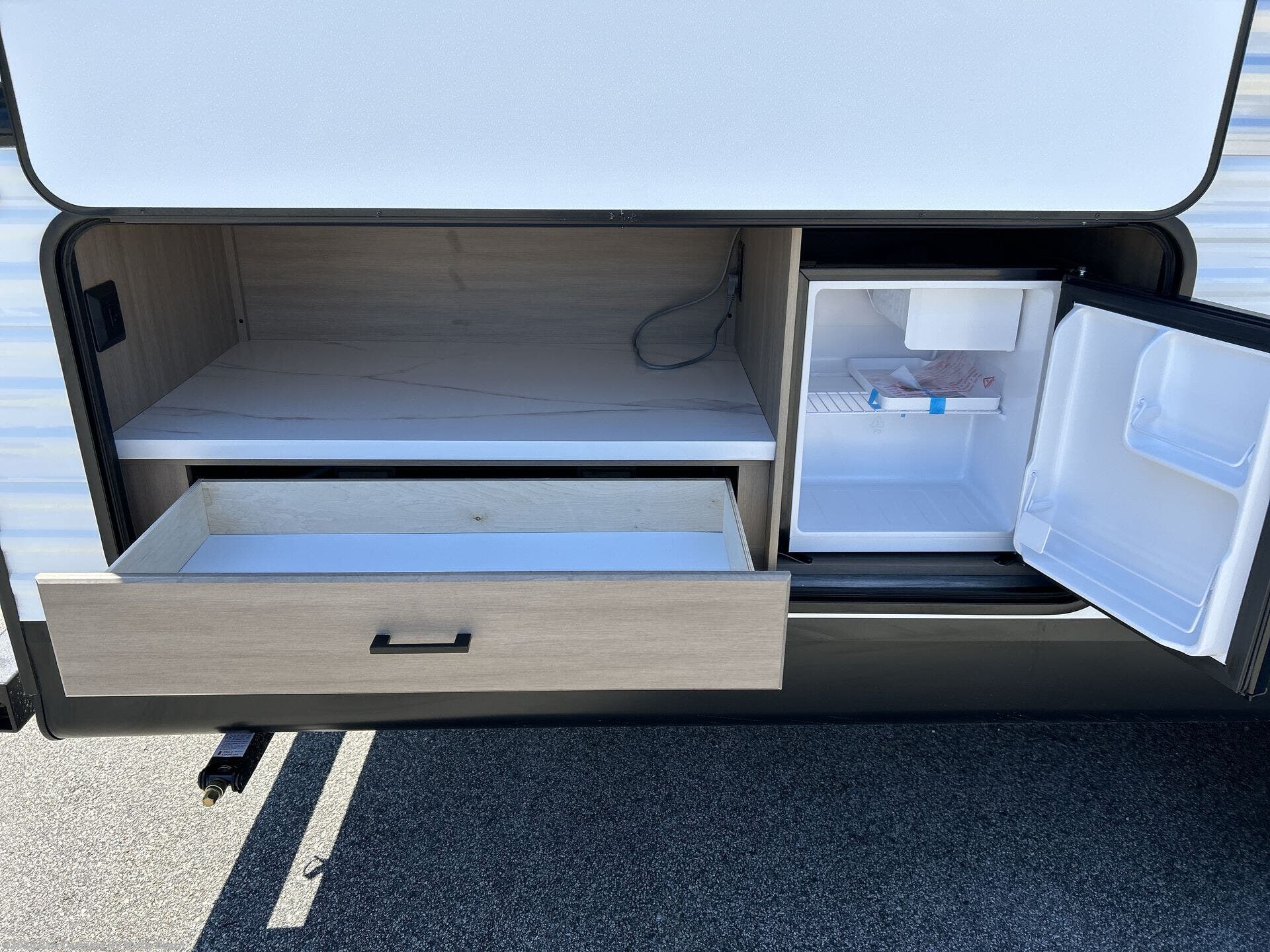 You can comfortably sleep up to ten people in this trailer thanks to the double-size bunks in back, the RV queen bed in the front bedroom, plus the booth dinette and jack-knife sofa in the main living area! The chef of your crew will have a three burner cooktop and microwave oven to prepare meals, and everyone can store their favorite drinks in the 8 cu. ft. 12V refrigerator inside, or in the outdoor refrigerator for convenience. The rear corner bathroom includes a shower and a toilet, with the sink just outside of this room so others can brush their teeth if one is taking a shower before bed. The outside storage is accessible on both sides of the unit and will easily allow you bring along camp chairs, yard games and more. A 16' powered awning with LED lights will create a nice place to gather in the evenings with family and friends!
