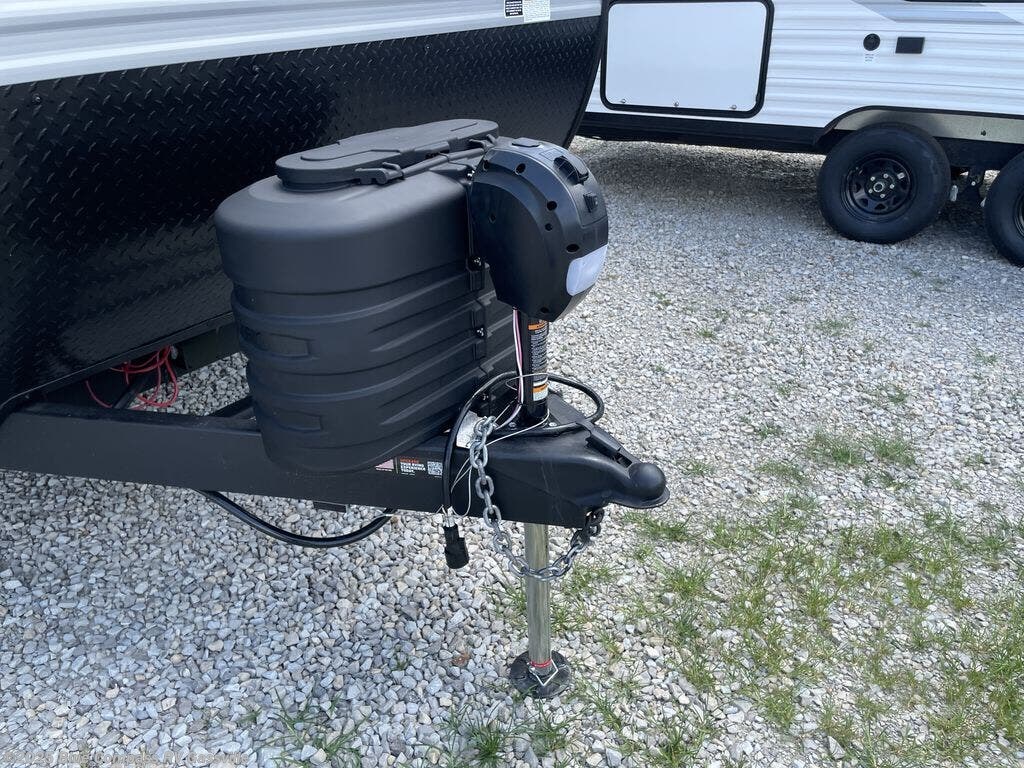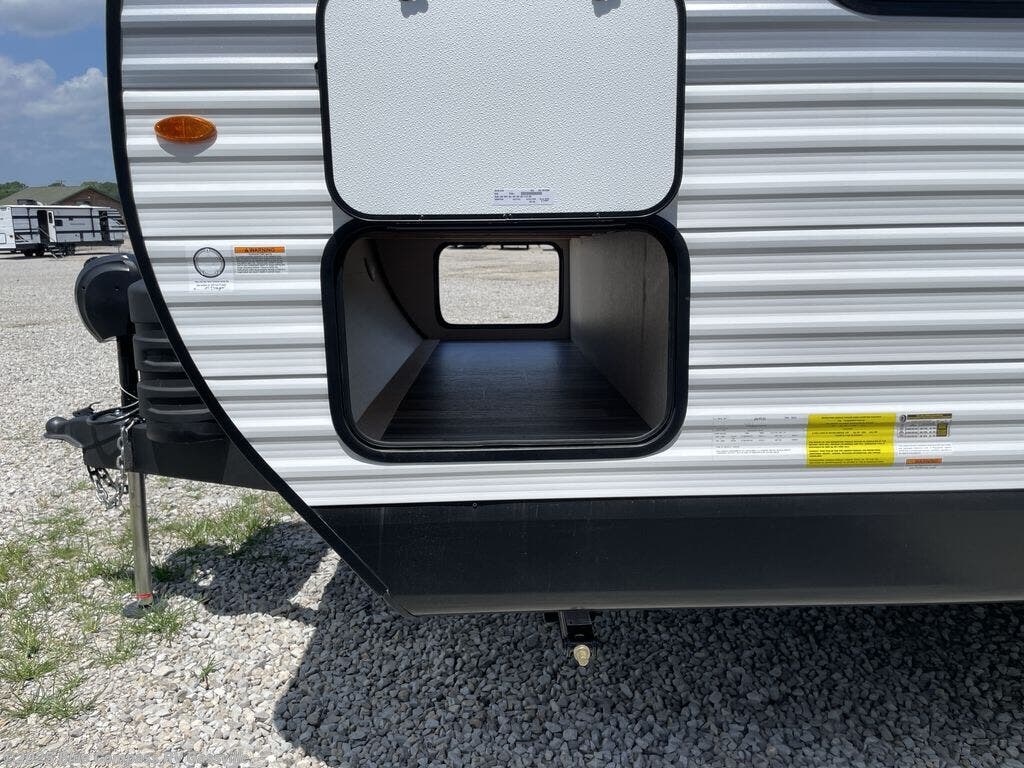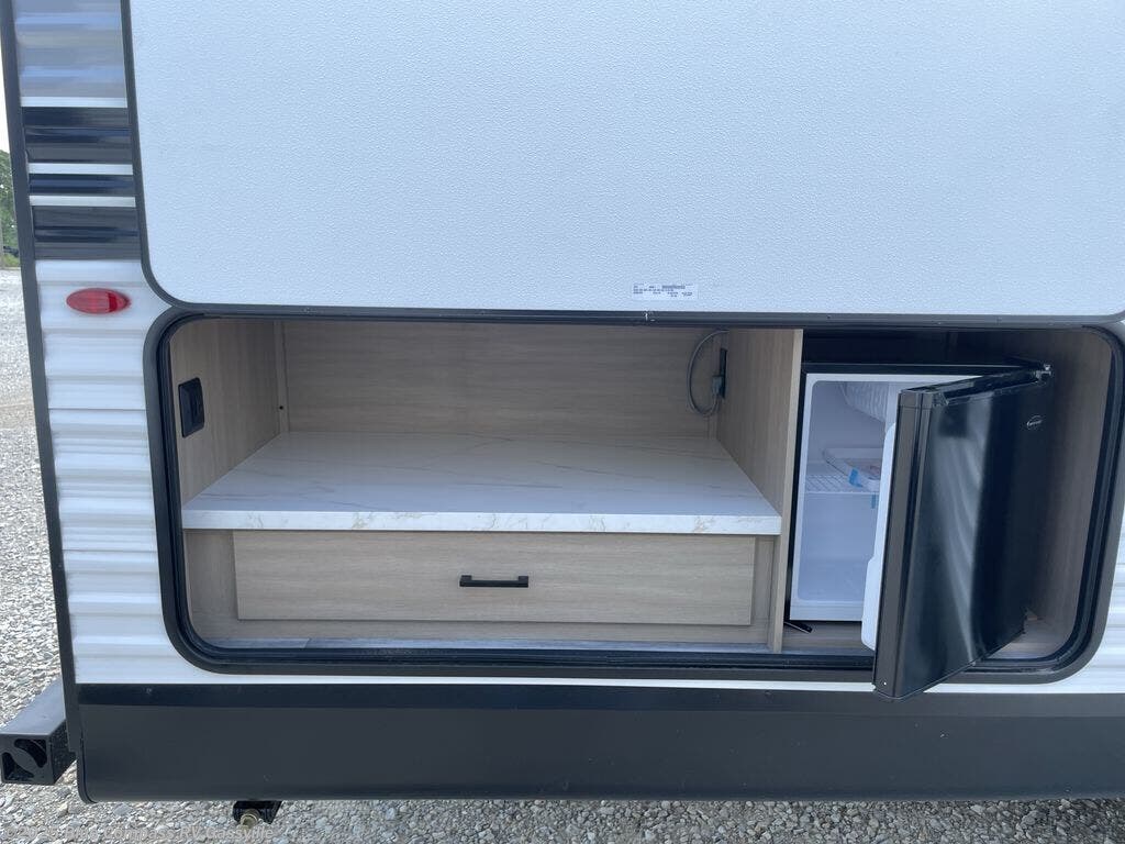 You can comfortably sleep up to ten people in this trailer thanks to the double-size bunks in back, the RV queen bed in the front bedroom, plus the booth dinette and jack-knife sofa in the main living area! The chef of your crew will have a three burner cooktop and microwave oven to prepare meals, and everyone can store their favorite drinks in the 8 cu. ft. 12V refrigerator inside, or in the outdoor refrigerator for convenience. The rear corner bathroom includes a tub/shower and a toilet, with the sink just outside of this room so others can brush their teeth if one is taking a shower before bed. The outside storage is accessible on both sides of the unit and will easily allow you bring along camp chairs, yard games and more. A 16' powered awning with LED lights will create a nice place to gather in the evenings with family and friends!