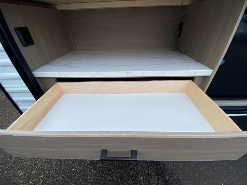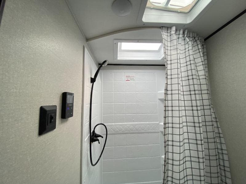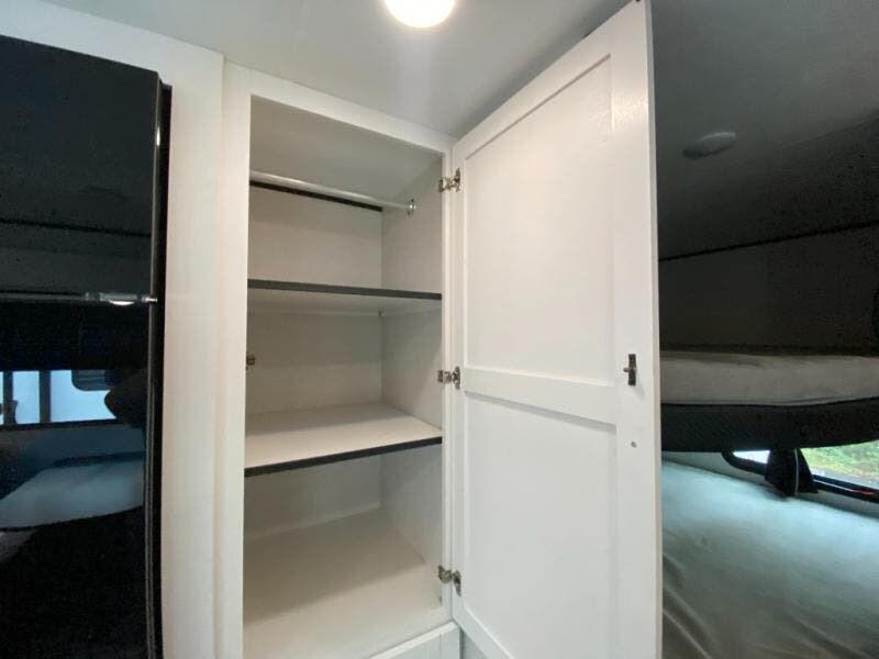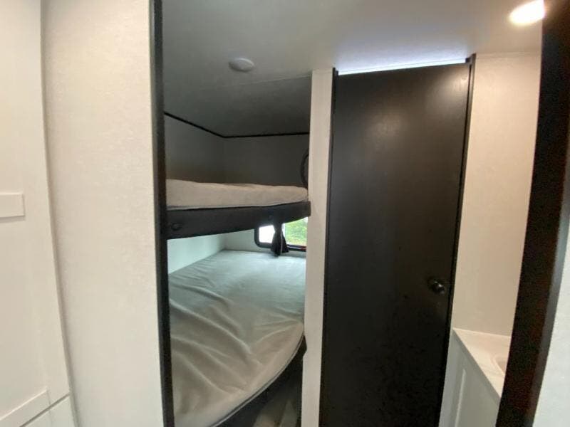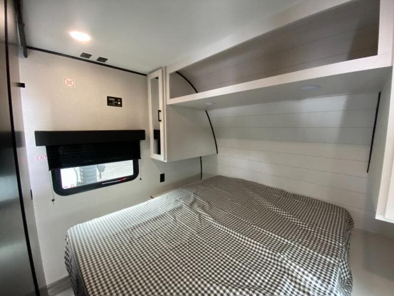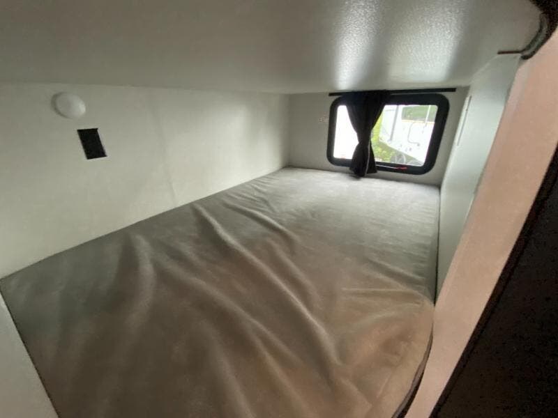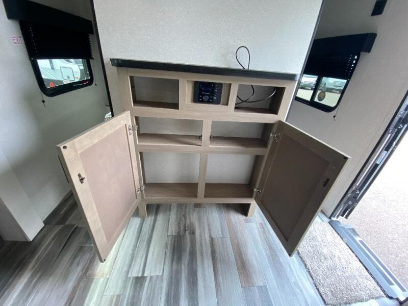 You can comfortably sleep up to ten people in this trailer thanks to the double-size bunks in back, the RV queen bed in the front bedroom, plus the booth dinette and jack-knife sofa in the main living area! The chef of your crew will have a three burner cooktop and microwave oven to prepare meals, and everyone can store their favorite drinks in the 8 cu. ft. 12V refrigerator inside, or in the outdoor refrigerator for convenience. The rear corner bathroom includes a shower and a toilet, with the sink just outside of this room so others can brush their teeth if one is taking a shower before bed. The outside storage is accessible on both sides of the unit and will easily allow you bring along camp chairs, yard games and more. A 16' powered awning with LED lights will create a nice place to gather in the evenings with family and friends!