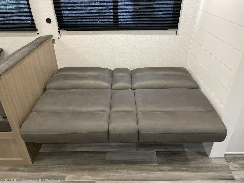 You can comfortably sleep up to ten people in this trailer thanks to the double-size bunks in back, the RV queen bed in the front bedroom, plus the booth dinette and jack-knife sofa in the main living area! The chef of your crew will have a three burner cooktop and microwave oven to prepare meals, and everyone can store their favorite drinks in the 8 cu. ft. 12V refrigerator inside, or in the outdoor refrigerator for convenience. The rear corner bathroom includes a shower and a toilet, with the sink just outside of this room so others can brush their teeth if one is taking a shower before bed. The outside storage is accessible on both sides of the unit and will easily allow you bring along camp chairs, yard games and more. A 16' powered awning with LED lights will create a nice place to gather in the evenings with family and friends!