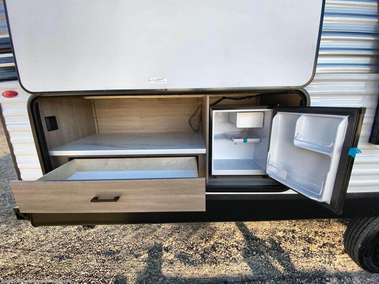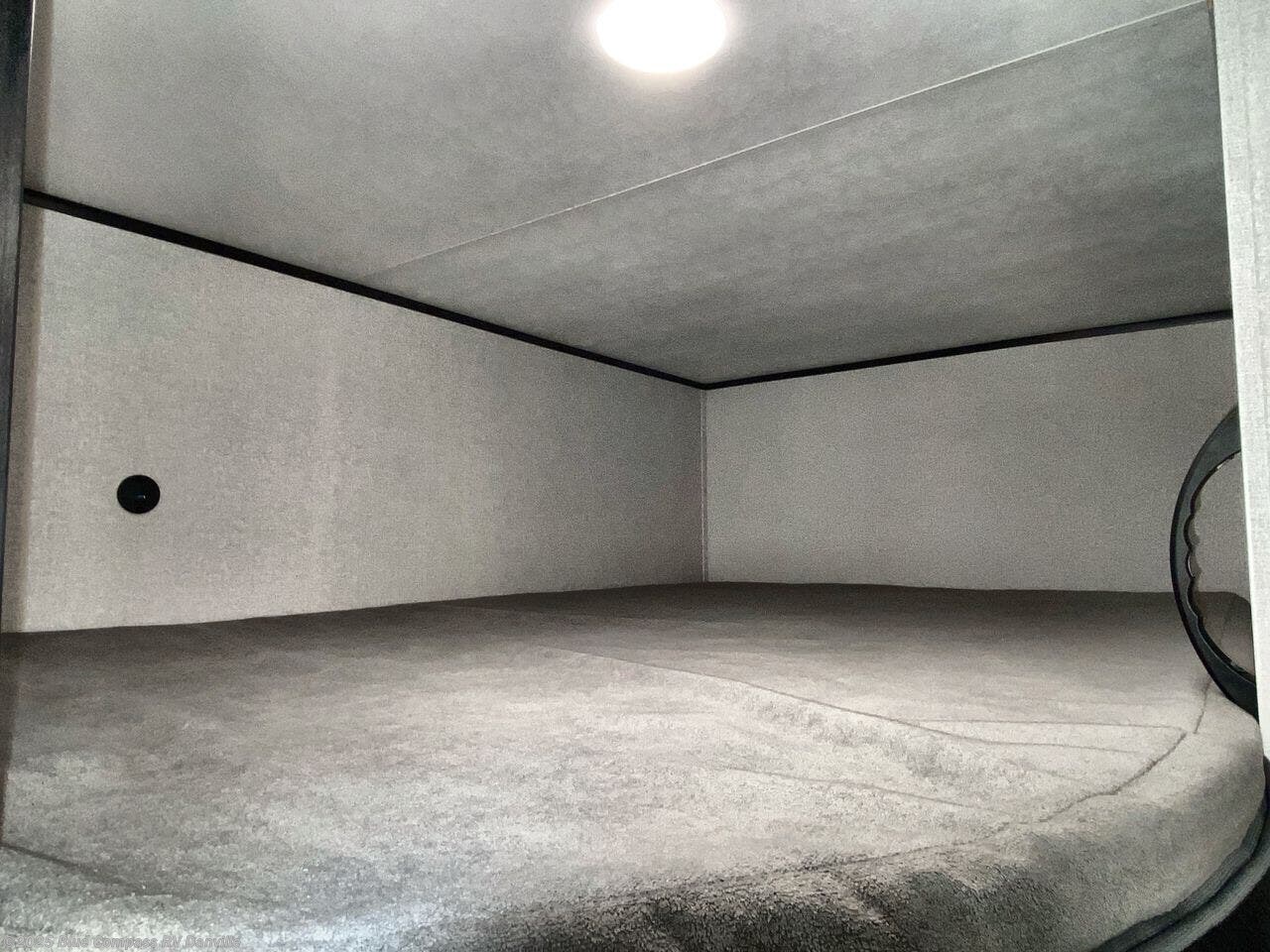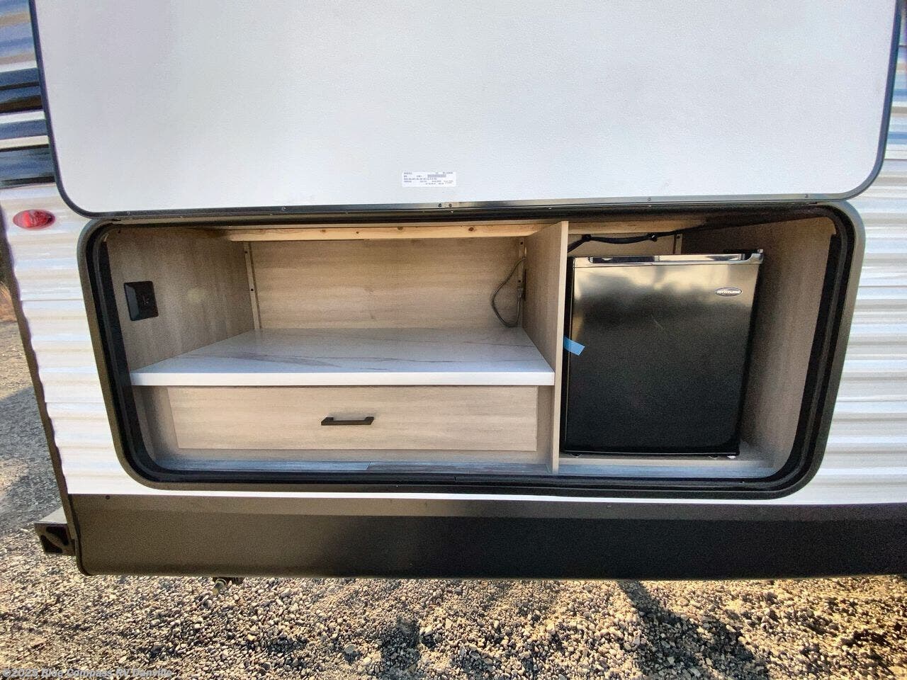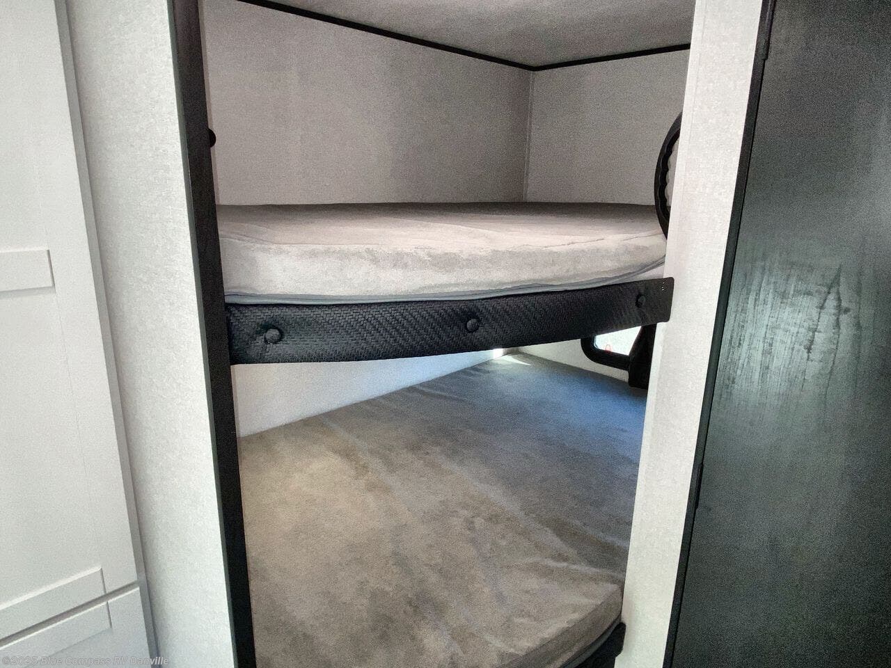 You can comfortably sleep up to ten people in this trailer thanks to the double-size bunks in back, the RV queen bed in the front bedroom, plus the booth dinette and jack-knife sofa in the main living area! The chef of your crew will have a three burner cooktop and microwave oven to prepare meals, and everyone can store their favorite drinks in the 8 cu. ft. 12V refrigerator inside, or in the outdoor refrigerator for convenience. The rear corner bathroom includes a shower and a toilet, with the sink just outside of this room so others can brush their teeth if one is taking a shower before bed. The outside storage is accessible on both sides of the unit and will easily allow you bring along camp chairs, yard games and more. A 16' powered awning with LED lights will create a nice place to gather in the evenings with family and friends!
