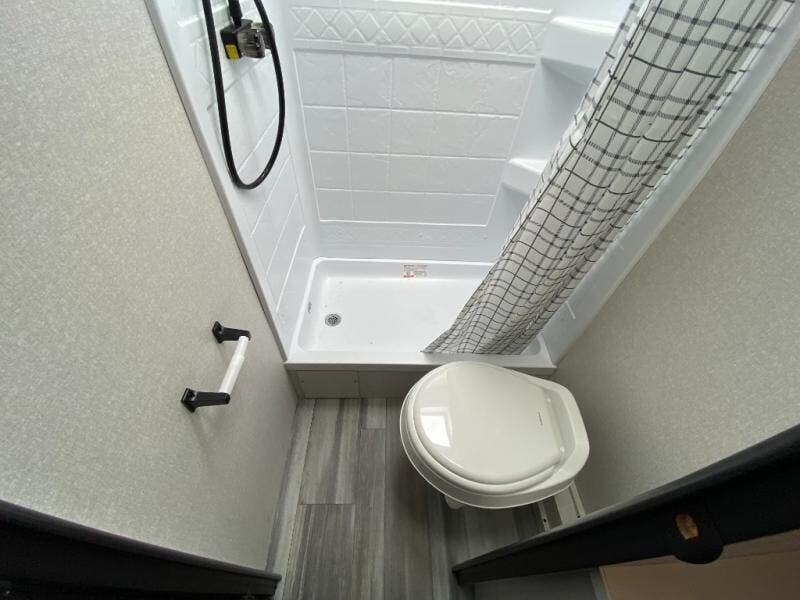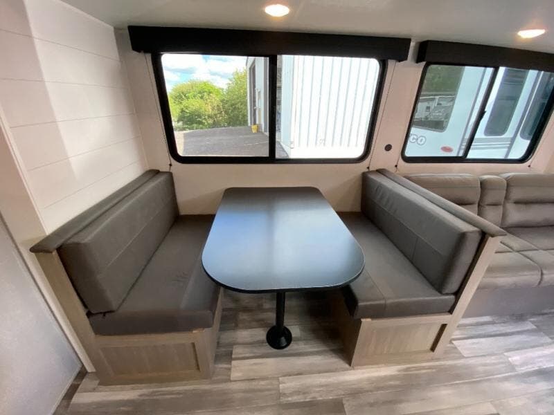 You can comfortably sleep up to ten people in this trailer thanks to the double-size bunks in back, the RV queen bed in the front bedroom, plus the booth dinette and jack-knife sofa in the main living area! The chef of your crew will have a three burner cooktop and microwave oven to prepare meals, and everyone can store their favorite drinks in the 8 cu. ft. 12V refrigerator inside, or in the outdoor refrigerator for convenience. The rear corner bathroom includes a shower and a toilet, with the sink just outside of this room so others can brush their teeth if one is taking a shower before bed. The outside storage is accessible on both sides of the unit and will easily allow you bring along camp chairs, yard games and more. A 16' powered awning with LED lights will create a nice place to gather in the evenings with family and friends!