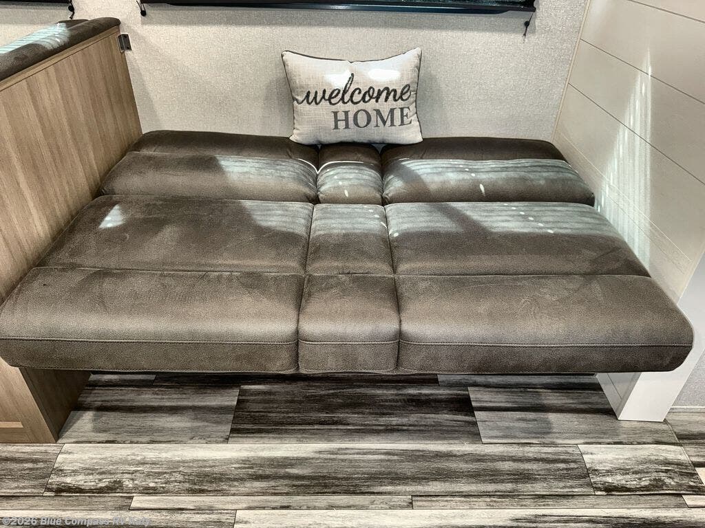 You can comfortably sleep up to ten people in this trailer thanks to the double-size bunks in back, the RV queen bed in the front bedroom, plus the booth dinette and jack-knife sofa in the main living area! The chef of your crew will have a three burner cooktop and microwave oven to prepare meals, and everyone can store their favorite drinks in the 8 cu. ft. 12V refrigerator inside, or in the outdoor refrigerator for convenience. The rear corner bathroom includes a shower and a toilet, with the sink just outside of this room so others can brush their teeth if one is taking a shower before bed. The outside storage is accessible on both sides of the unit and will easily allow you bring along camp chairs, yard games and more. A 16' powered awning with LED lights will create a nice place to gather in the evenings with family and friends!