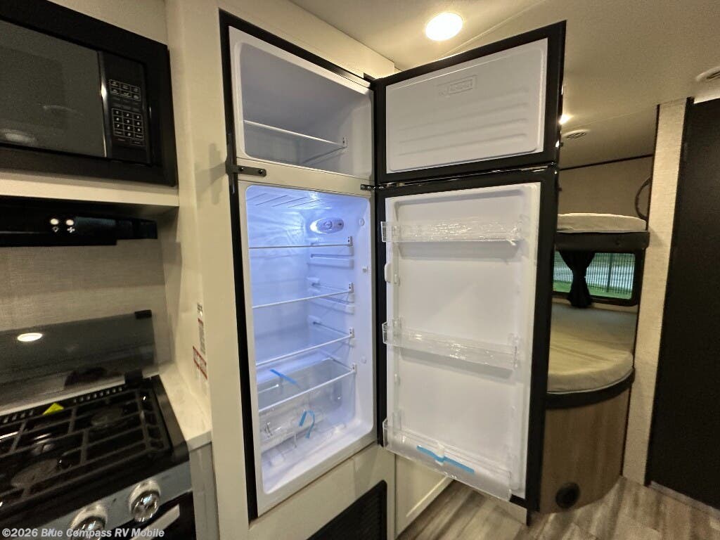 You can comfortably sleep up to ten people in this trailer thanks to the double-size bunks in back, the RV queen bed in the front bedroom, plus the booth dinette and jack-knife sofa in the main living area! The chef of your crew will have a three burner cooktop and microwave oven to prepare meals, and everyone can store their favorite drinks in the 8 cu. ft. 12V refrigerator inside, or in the outdoor refrigerator for convenience. The rear corner bathroom includes a tub/shower and a toilet, with the sink just outside of this room so others can brush their teeth if one is taking a shower before bed. The outside storage is accessible on both sides of the unit and will easily allow you bring along camp chairs, yard games and more. A 16' powered awning with LED lights will create a nice place to gather in the evenings with family and friends!