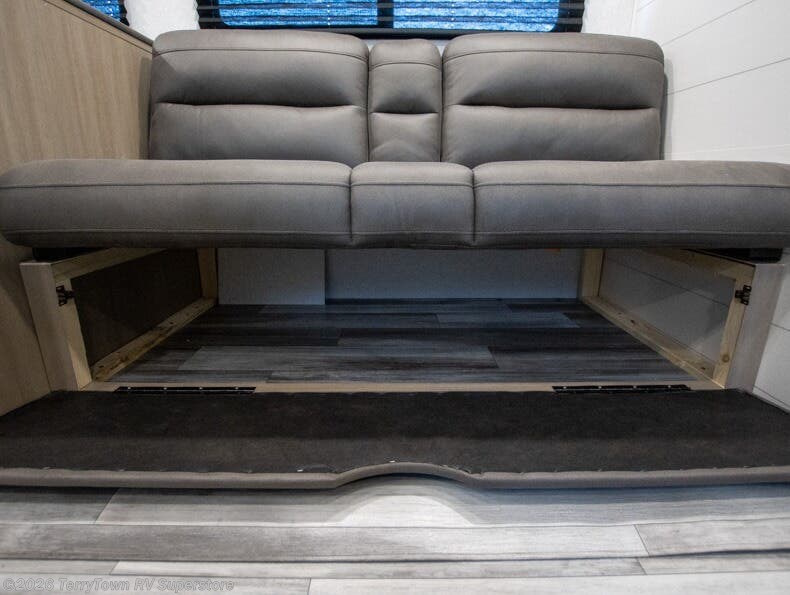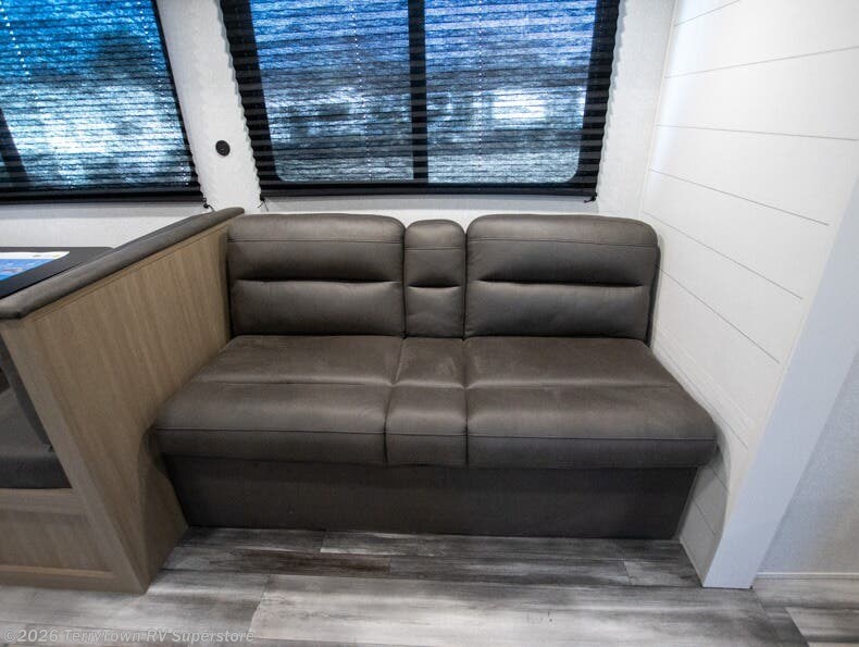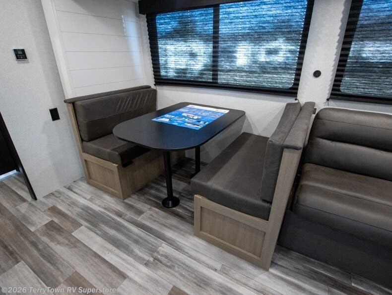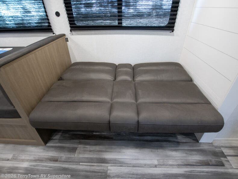You can comfortably sleep up to ten people in this trailer thanks to the double-size bunks in back, the RV queen bed in the front bedroom, plus the booth dinette and jack-knife sofa in the main living area! The chef of your crew will have a three burner cooktop and microwave oven to prepare meals, and everyone can store their favorite drinks in the 8 cu. ft. 12V refrigerator inside, or in the outdoor refrigerator for convenience. The rear corner bathroom includes a shower and a toilet, with the sink just outside of this room so others can brush their teeth if one is taking a shower before bed. The outside storage is accessible on both sides of the unit and will easily allow you bring along camp chairs, yard games and more. A 16' powered awning with LED lights will create a nice place to gather in the evenings with family and friends!