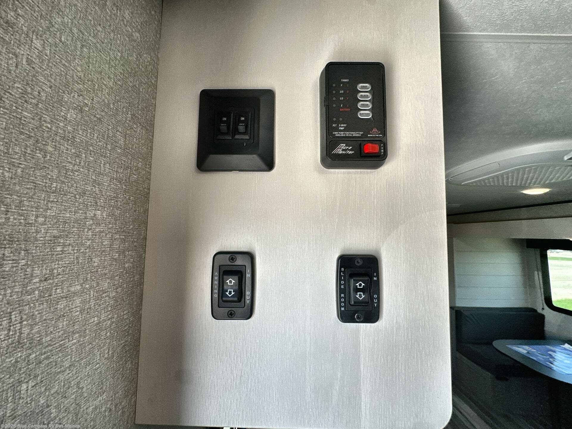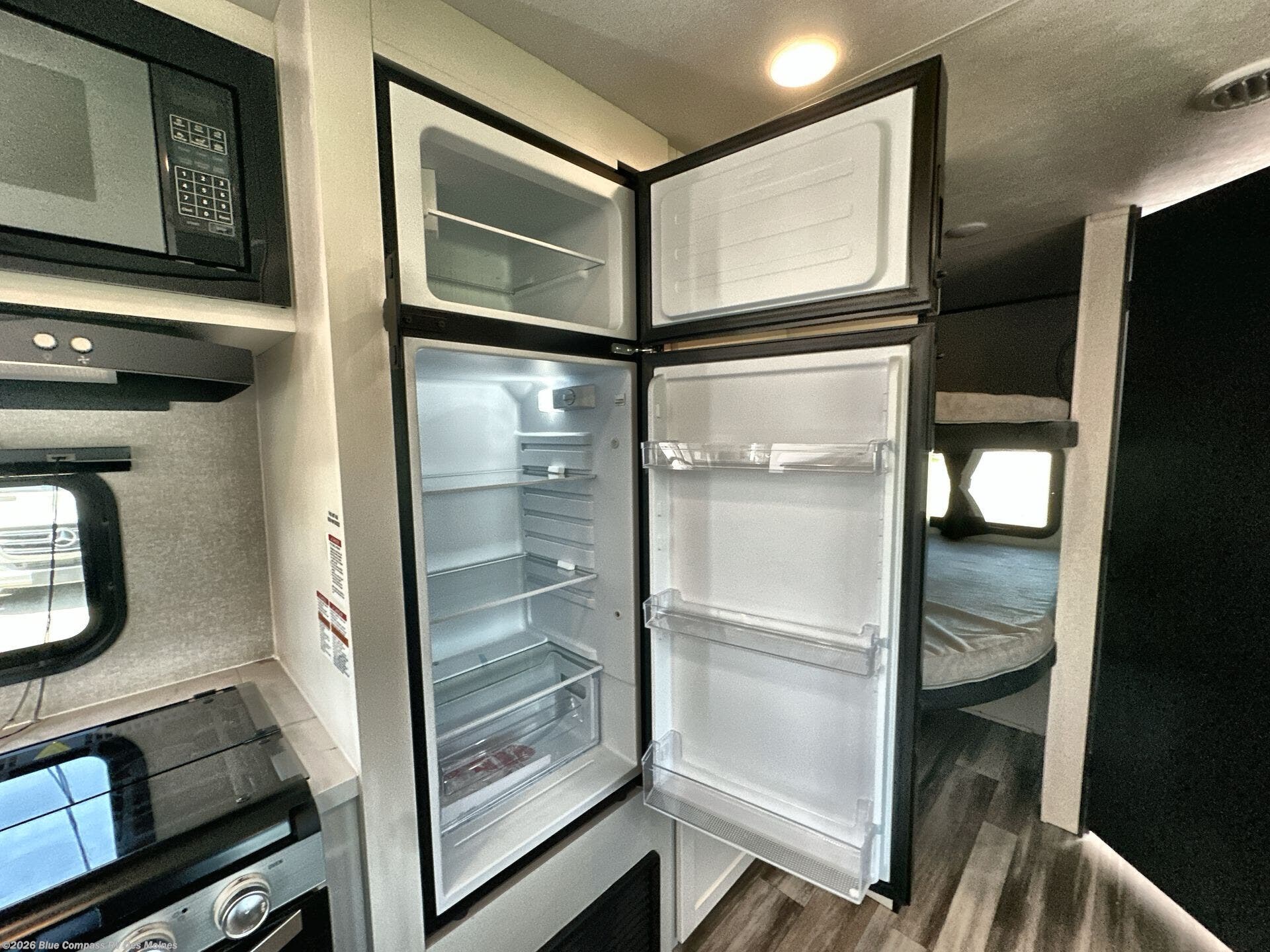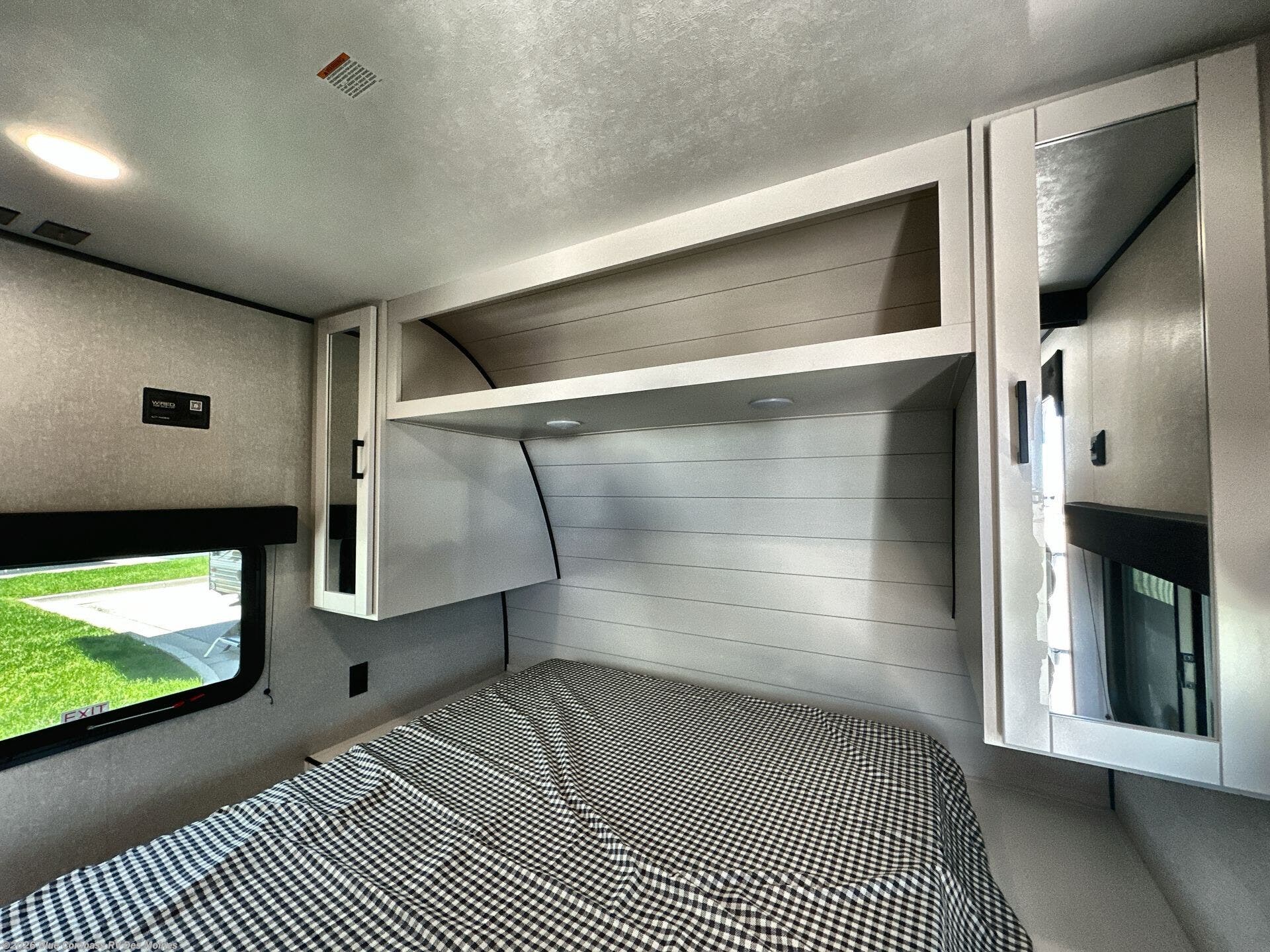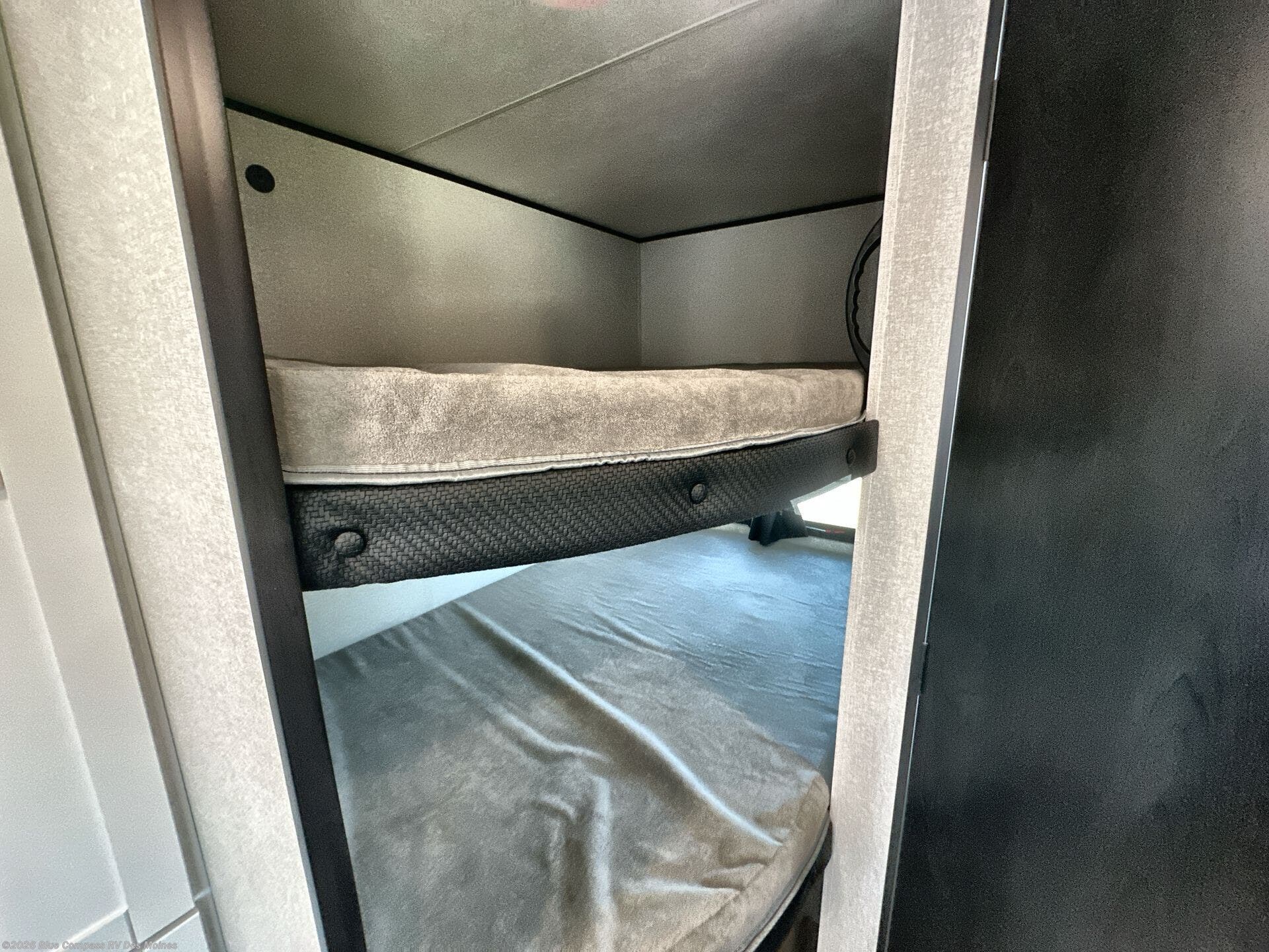 You can comfortably sleep up to ten people in this trailer thanks to the double-size bunks in back, the RV queen bed in the front bedroom, plus the booth dinette and jack-knife sofa in the main living area! The chef of your crew will have a three burner cooktop and microwave oven to prepare meals, and everyone can store their favorite drinks in the 8 cu. ft. 12V refrigerator inside, or in the outdoor refrigerator for convenience. The rear corner bathroom includes a shower and a toilet, with the sink just outside of this room so others can brush their teeth if one is taking a shower before bed. The outside storage is accessible on both sides of the unit and will easily allow you bring along camp chairs, yard games and more. A 16' powered awning with LED lights will create a nice place to gather in the evenings with family and friends!