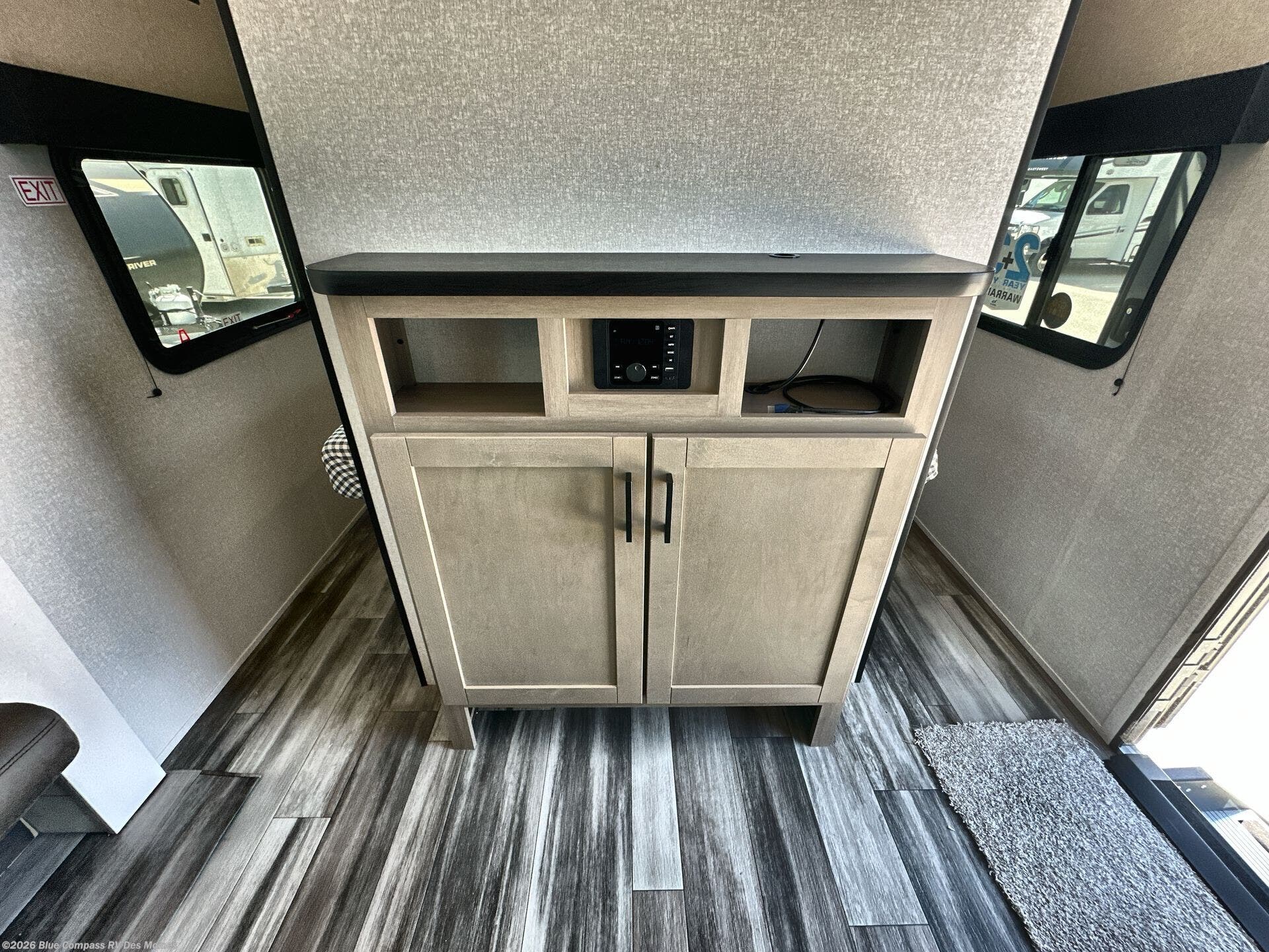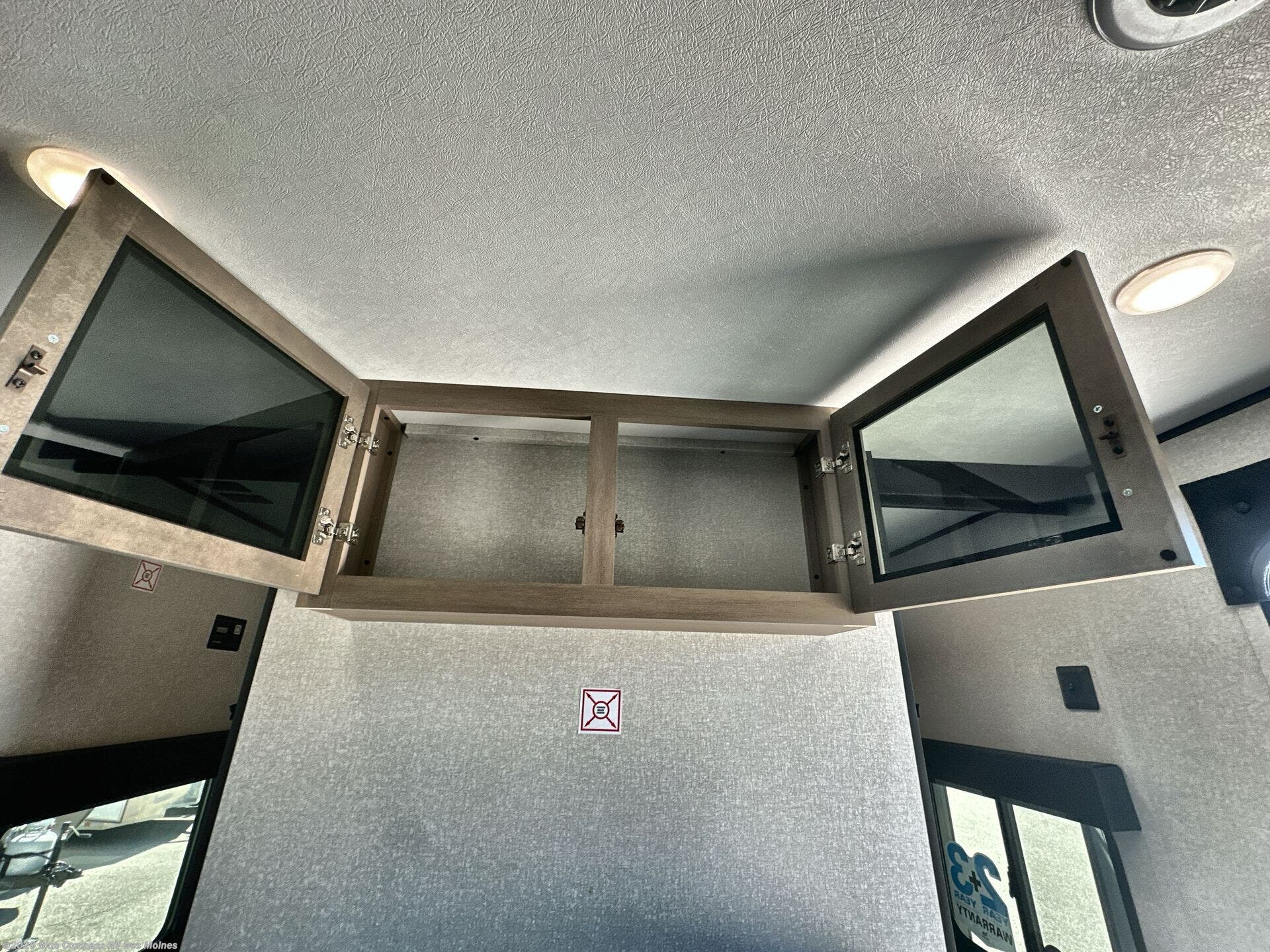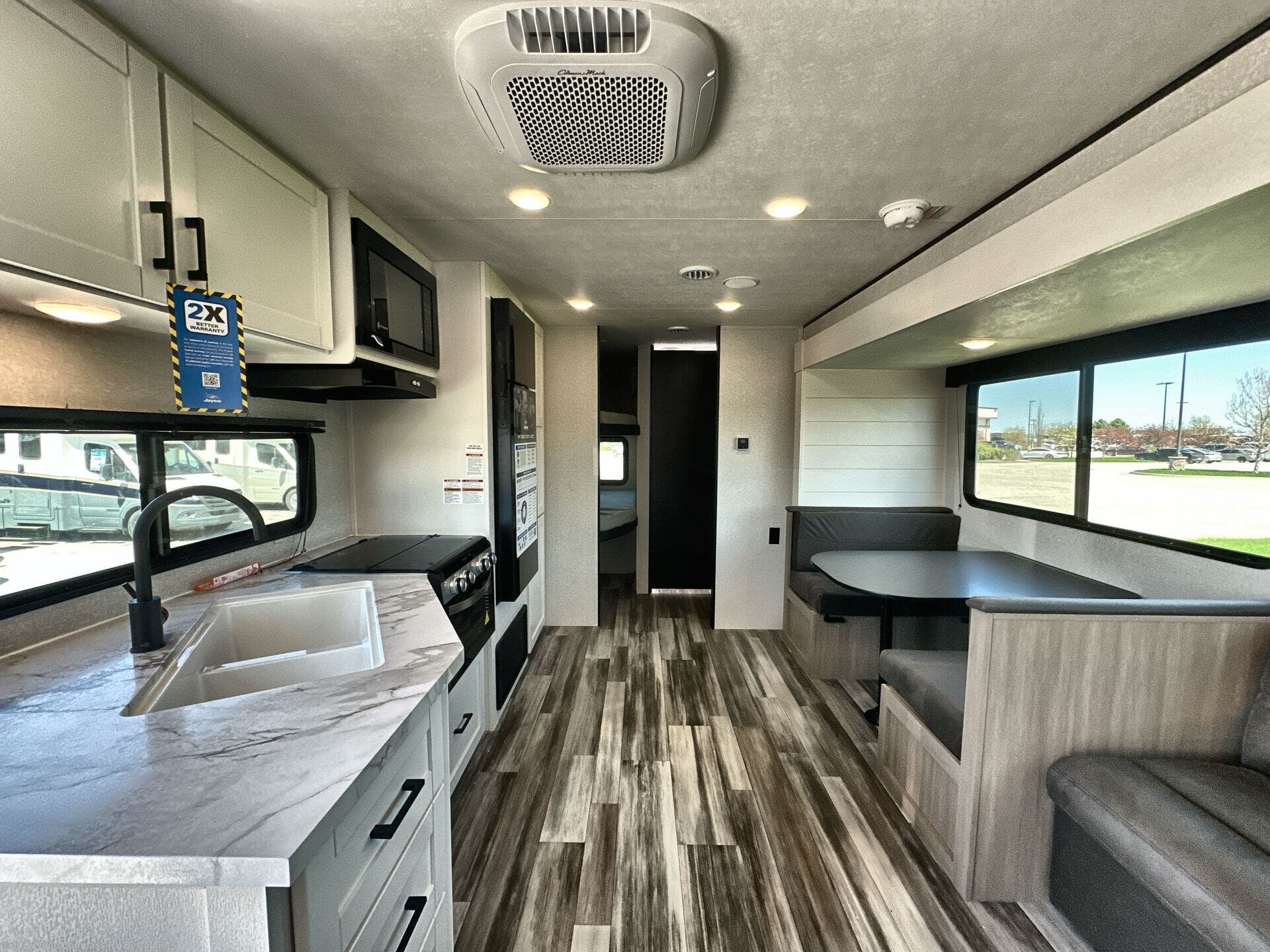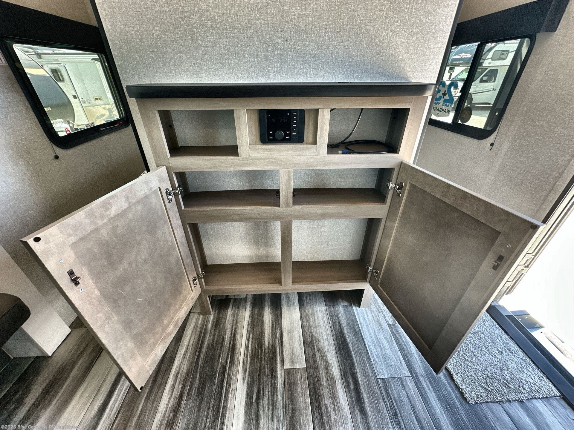 You can comfortably sleep up to ten people in this trailer thanks to the double-size bunks in back, the RV queen bed in the front bedroom, plus the booth dinette and jack-knife sofa in the main living area! The chef of your crew will have a three burner cooktop and microwave oven to prepare meals, and everyone can store their favorite drinks in the 8 cu. ft. 12V refrigerator inside, or in the outdoor refrigerator for convenience. The rear corner bathroom includes a shower and a toilet, with the sink just outside of this room so others can brush their teeth if one is taking a shower before bed. The outside storage is accessible on both sides of the unit and will easily allow you bring along camp chairs, yard games and more. A 16' powered awning with LED lights will create a nice place to gather in the evenings with family and friends!