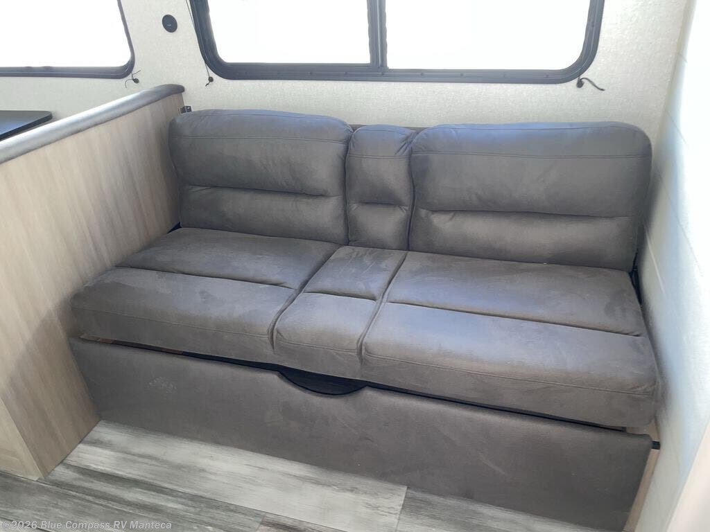 You can comfortably sleep up to ten people in this trailer thanks to the double-size bunks, the RV queen bed in the front bedroom, plus the booth dinette and jack-knife sofa in the main living area! The chef of your crew will have a three burner cooktop and microwave oven to prepare meals, and everyone can store their favorite drinks in the 8 cu. ft. 12V refrigerator inside, or in the outdoor refrigerator for convenience. The rear corner bathroom includes a shower and a toilet, with the sink just outside of this room so others can brush their teeth if one is taking a shower before bed. The outside storage is accessible on both sides of the unit and will easily allow you bring along camp chairs, yard games and more. A 16' powered awning with LED lights will create a nice place to gather in the evenings with family and friends!