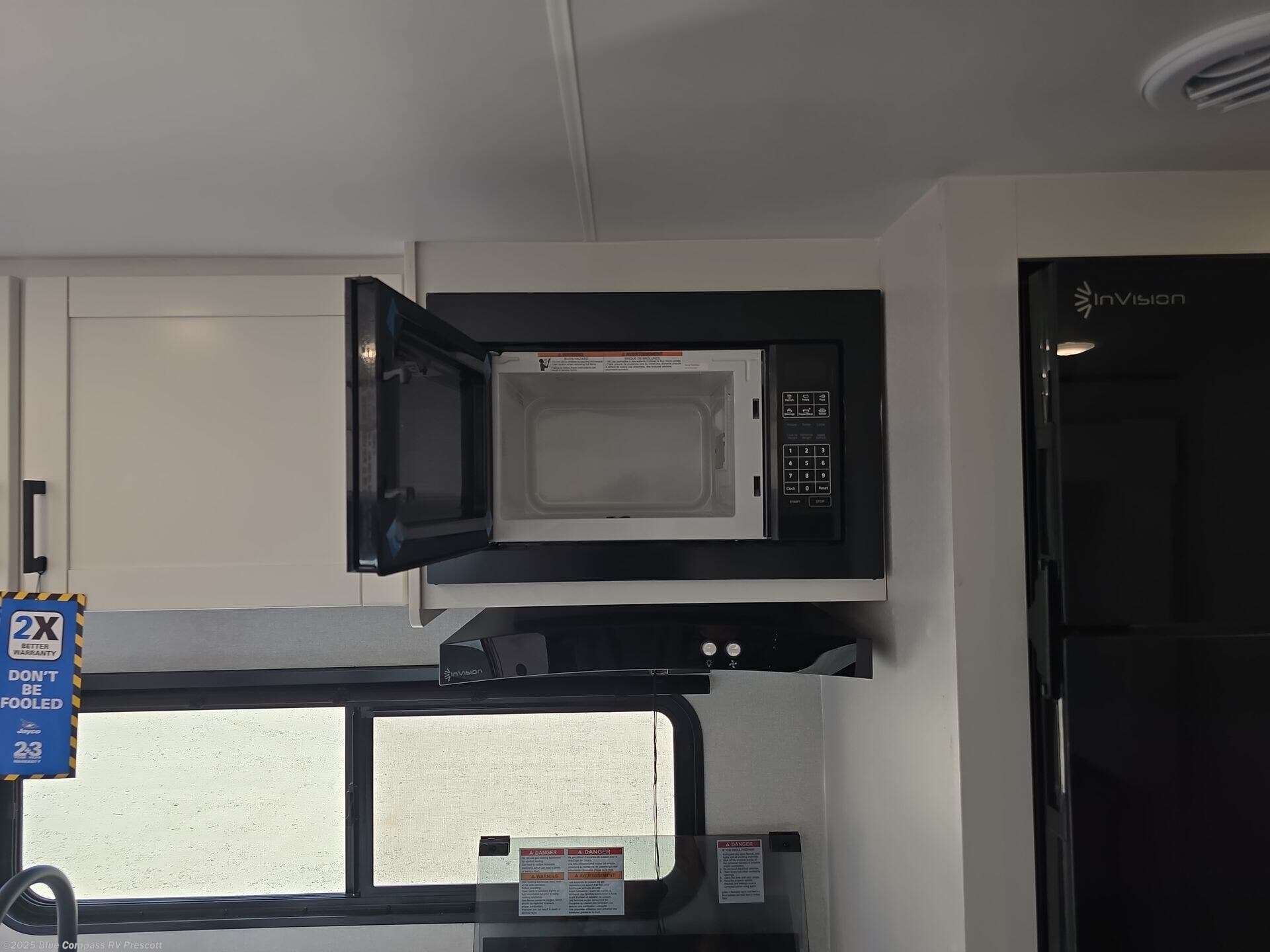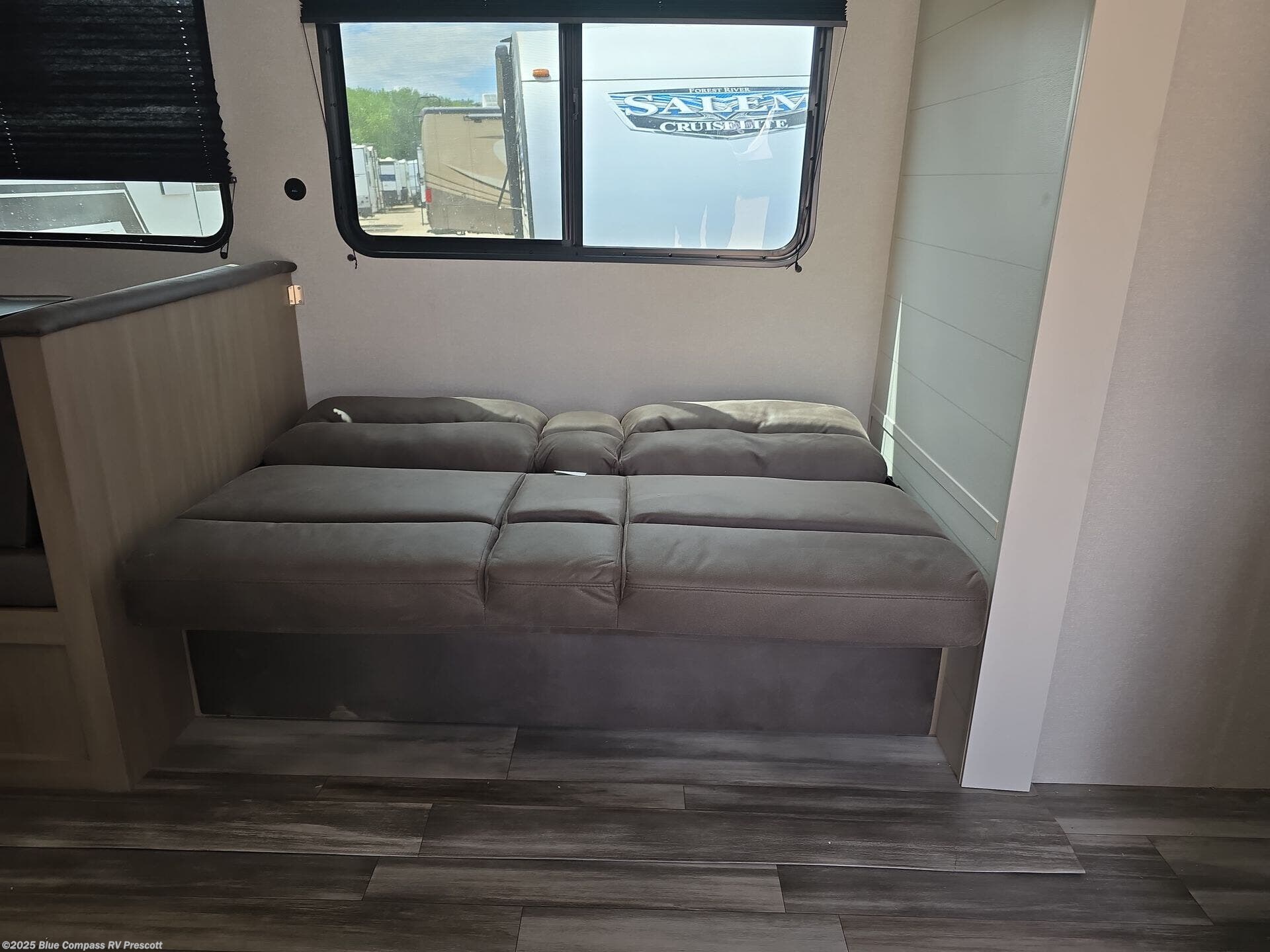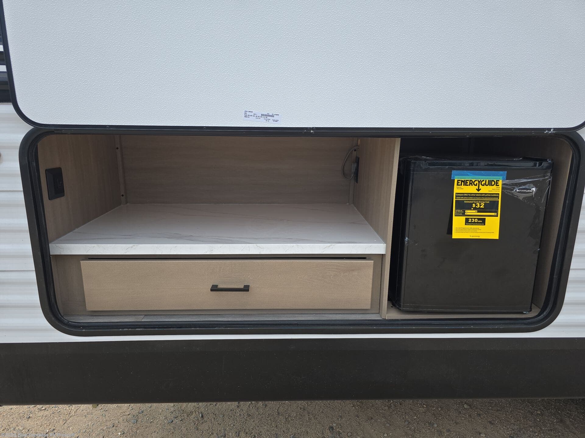 You can comfortably sleep up to ten people in this trailer thanks to the double-size bunks, the RV queen bed in the front bedroom, plus the booth dinette and jack-knife sofa in the main living area! The chef of your crew will have a three burner cooktop and microwave oven to prepare meals, and everyone can store their favorite drinks in the 8 cu. ft. 12V refrigerator inside, or in the outdoor refrigerator for convenience. The rear corner bathroom includes a shower and a toilet, with the sink just outside of this room so others can brush their teeth if one is taking a shower before bed. The outside storage is accessible on both sides of the unit and will easily allow you bring along camp chairs, yard games and more. A 16' powered awning with LED lights will create a nice place to gather in the evenings with family and friends!
