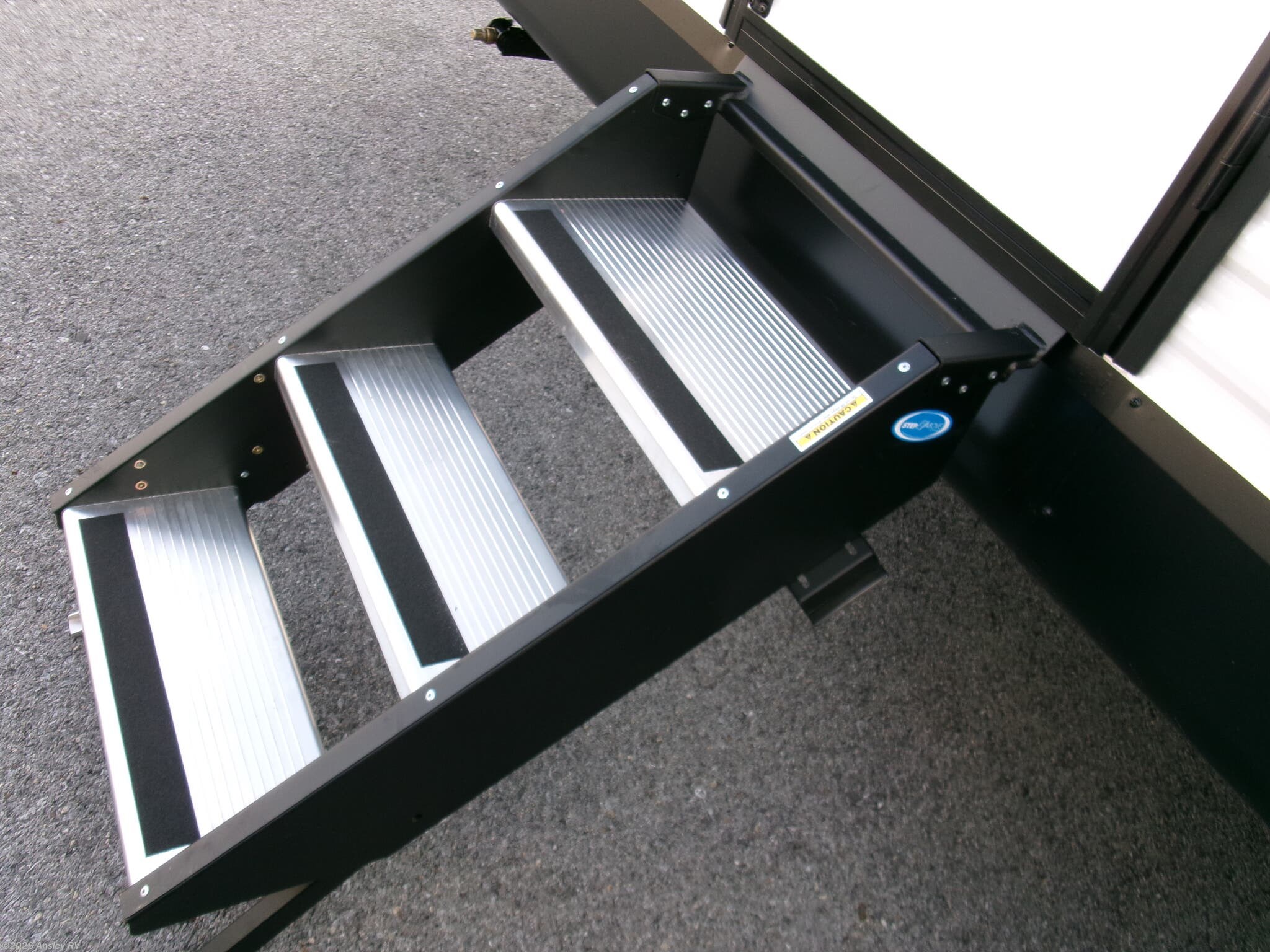 - Convenient exterior features including awning, exterior speakers, and leveling jacks