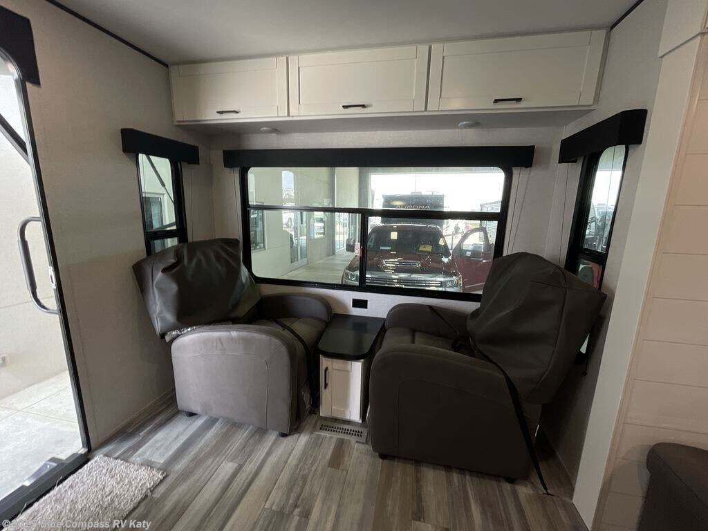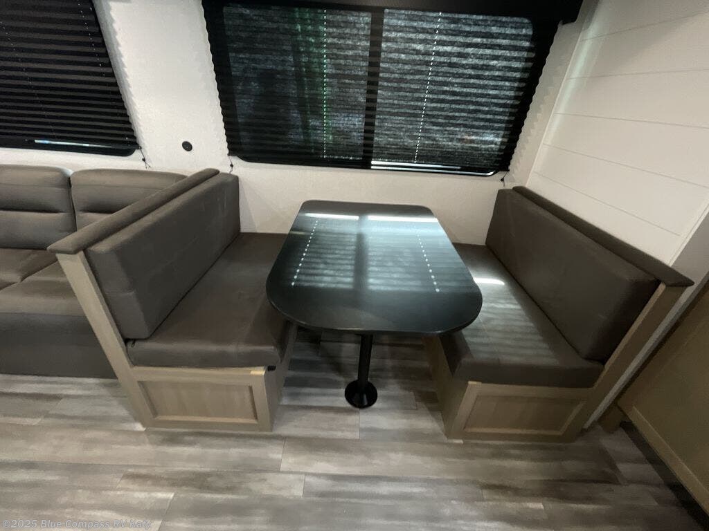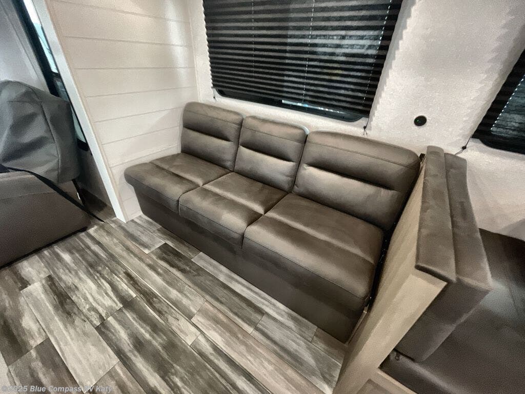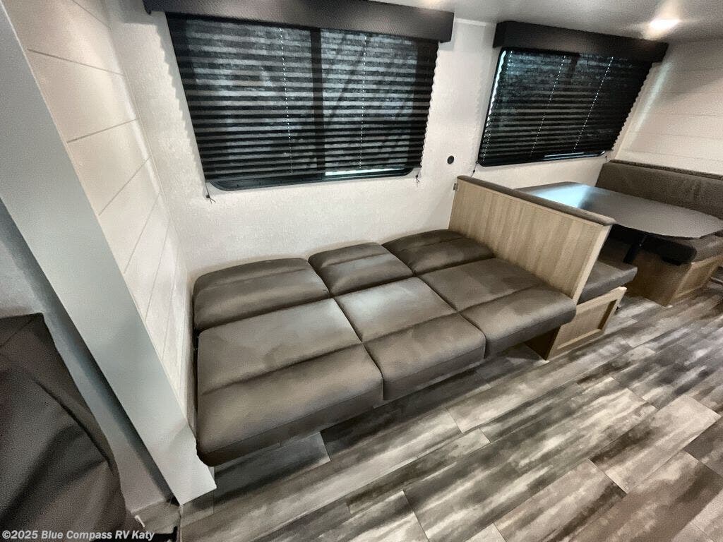 You can comfortably sleep up to six people in this trailer thanks to the RV queen bed in the front bedroom, plus the booth dinette and jack-knife sofa in the main living area! The chef of your crew will have a three burner cooktop and microwave oven to prepare meals, and everyone can store their favorite drinks in the 8 cu. ft. 12V refrigerator. The walk-through bath is spacious and includes a radius shower, toilet, a sink, and linen closet and is the full width of the unit. The outside storage will let you bring along camp chairs and games, fishing poles and more, plus the 18' 3" power awning with LED lights will create a nice place to gather in the evenings!