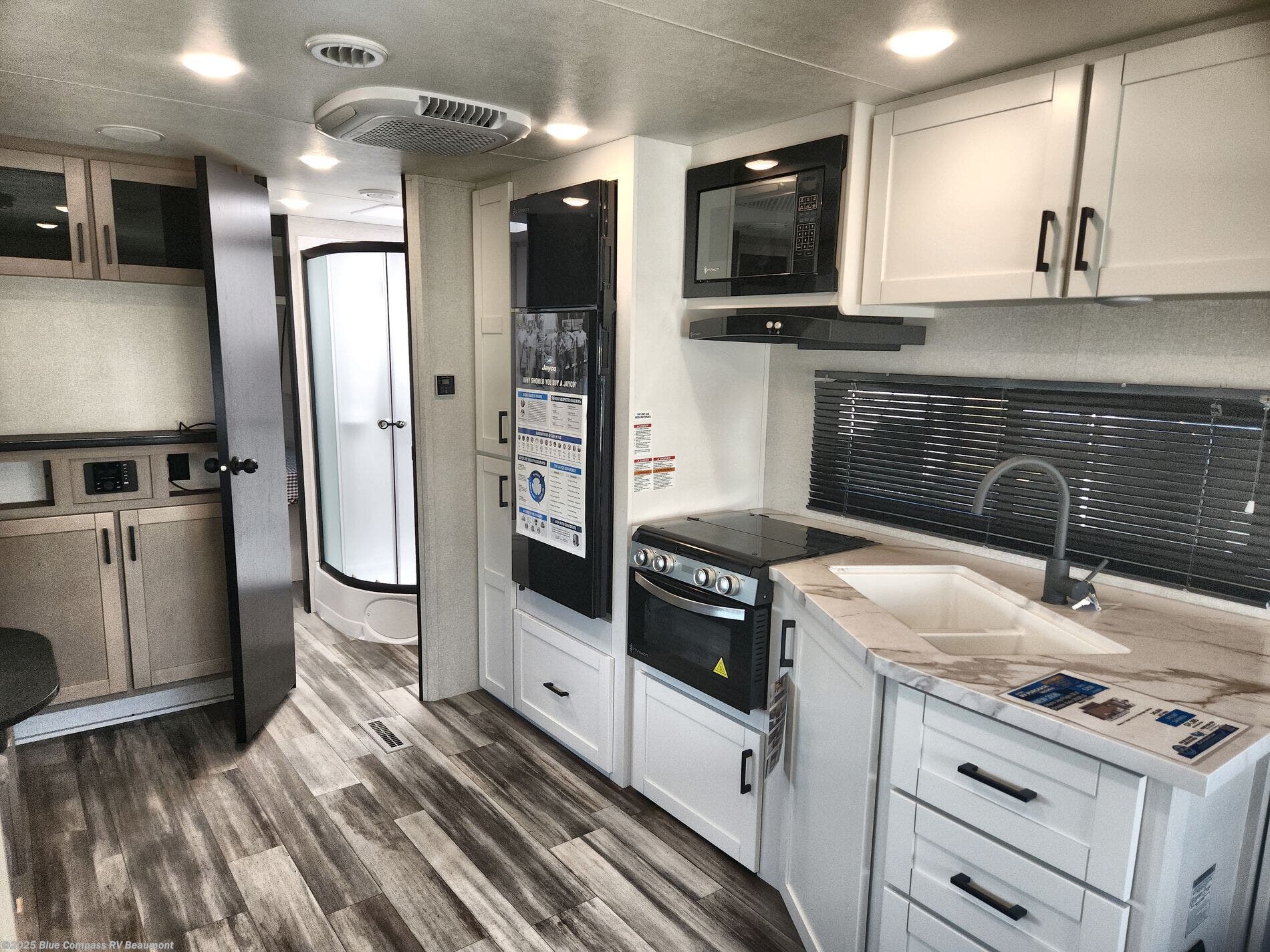 You can comfortably sleep up to six people in this trailer thanks to the RV queen bed in the front bedroom, plus the booth dinette and jack-knife sofa in the main living area! The chef of your crew will have a three burner cooktop and microwave oven to prepare meals, and everyone can store their favorite drinks in the 8 cu. ft. 12V refrigerator. The walk-through bath is spacious and includes a radius shower, toilet, a sink, and linen closet and is the full width of the unit. The outside storage will let you bring along camp chairs and games, fishing poles and more, plus the 18' 3" power awning with LED lights will create a nice place to gather in the evenings!
