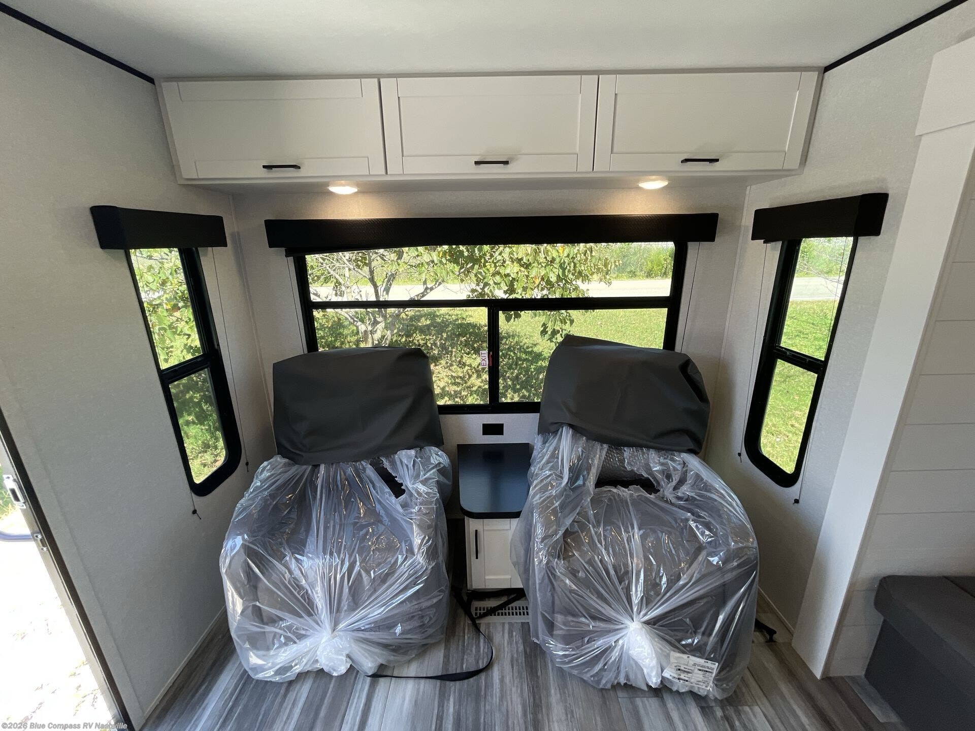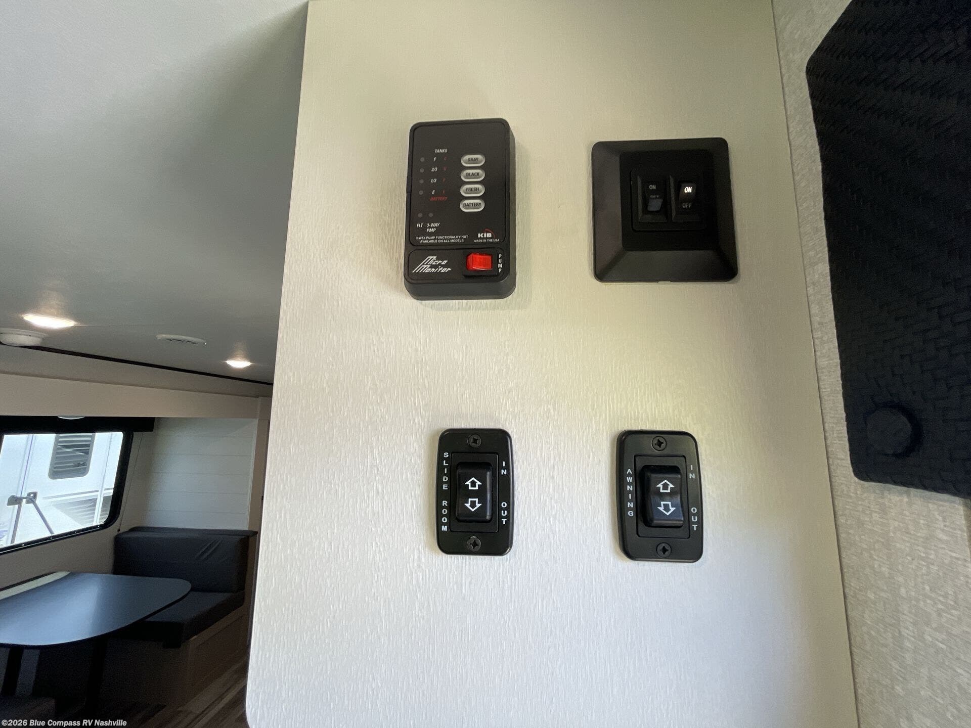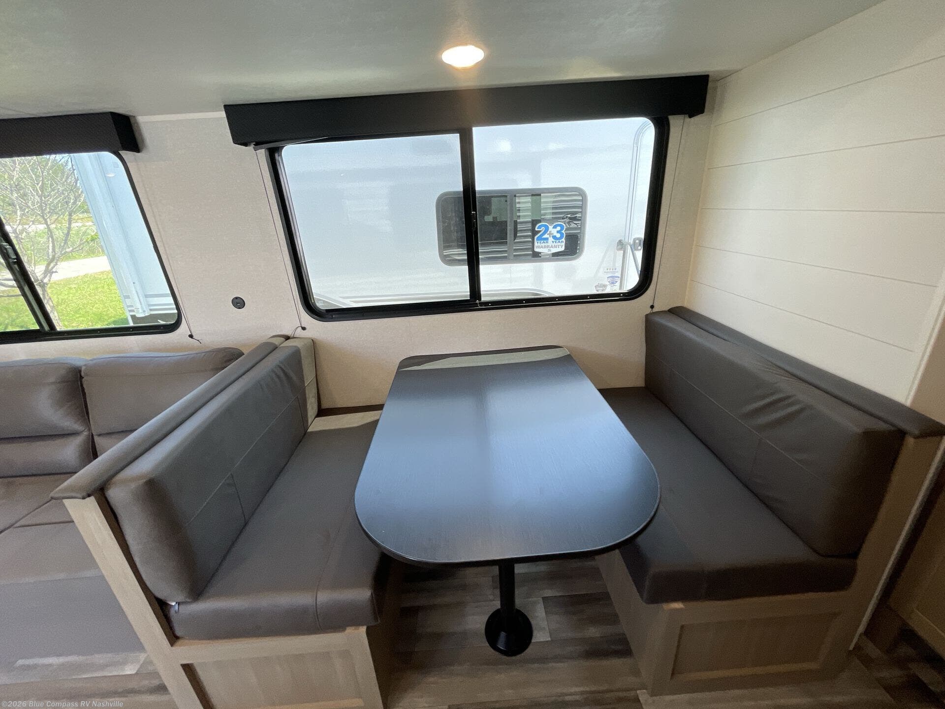 You can comfortably sleep up to six people in this trailer thanks to the RV queen bed in the front bedroom, plus the booth dinette and jack-knife sofa in the main living area! The chef of your crew will have a three burner cooktop and microwave oven to prepare meals, and everyone can store their favorite drinks in the 8 cu. ft. 12V refrigerator. The walk-through bath is spacious and includes a radius shower, toilet, a sink, and linen closet and is the full width of the unit. The outside storage will let you bring along camp chairs and games, fishing poles and more, plus the 18' 3" power awning with LED lights will create a nice place to gather in the evenings!