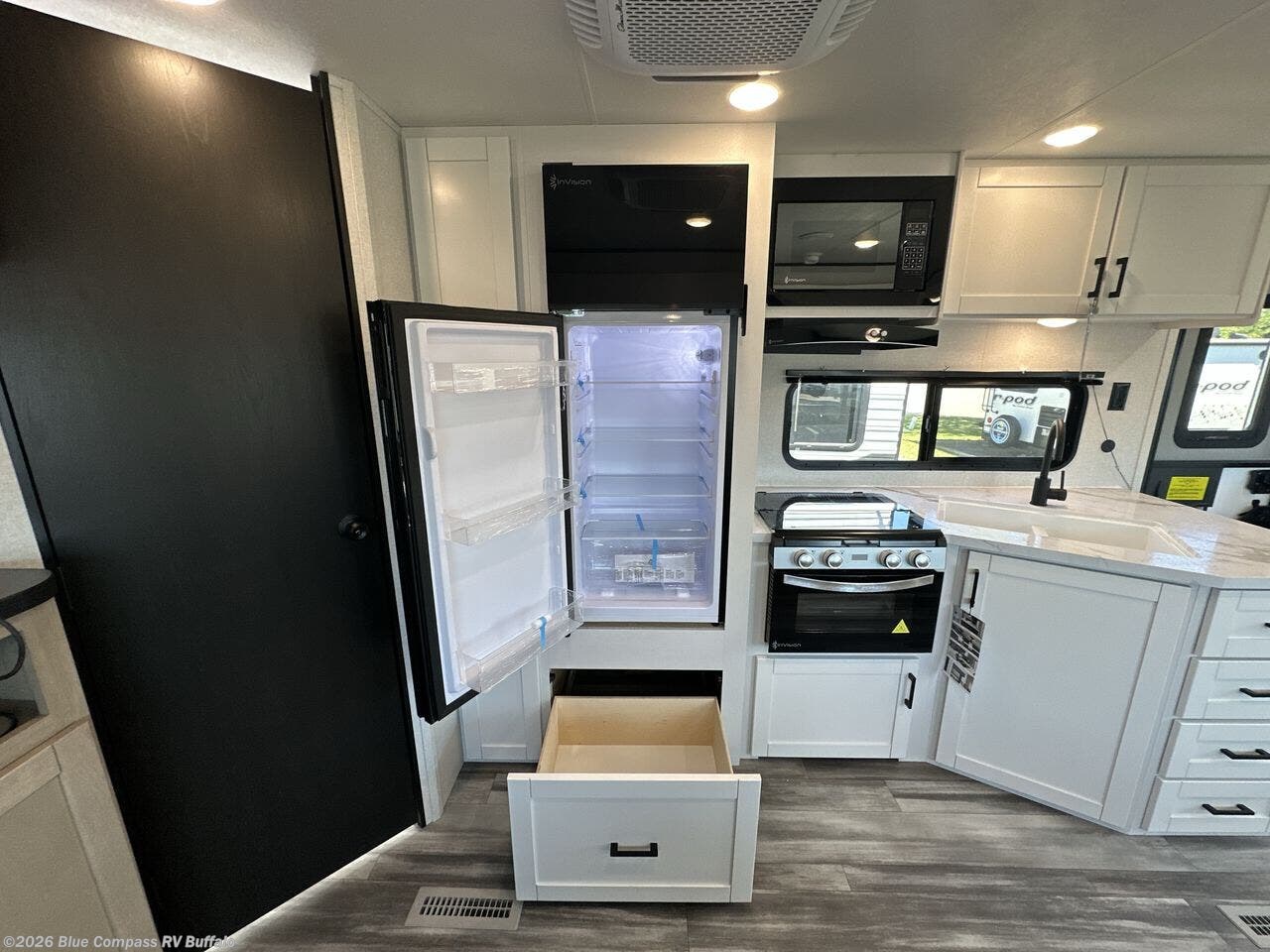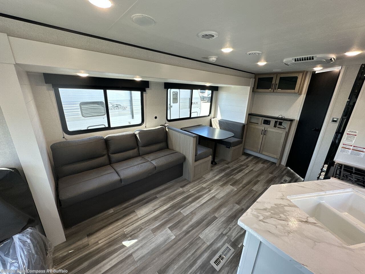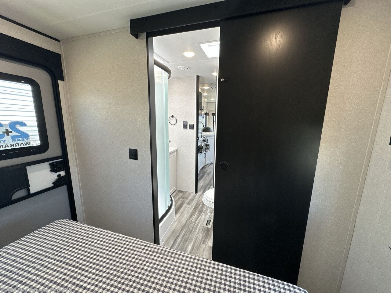 You can comfortably sleep up to six people in this trailer thanks to the RV queen bed in the front bedroom, plus the booth dinette and jack-knife sofa in the main living area! The chef of your crew will have a three burner cooktop and microwave oven to prepare meals, and everyone can store their favorite drinks in the 8 cu. ft. 12V refrigerator. The walk-through bath is spacious and includes a radius shower, toilet, a sink, and linen closet and is the full width of the unit. The outside storage will let you bring along camp chairs and games, fishing poles and more, plus the 18' 3" power awning with LED lights will create a nice place to gather in the evenings!
