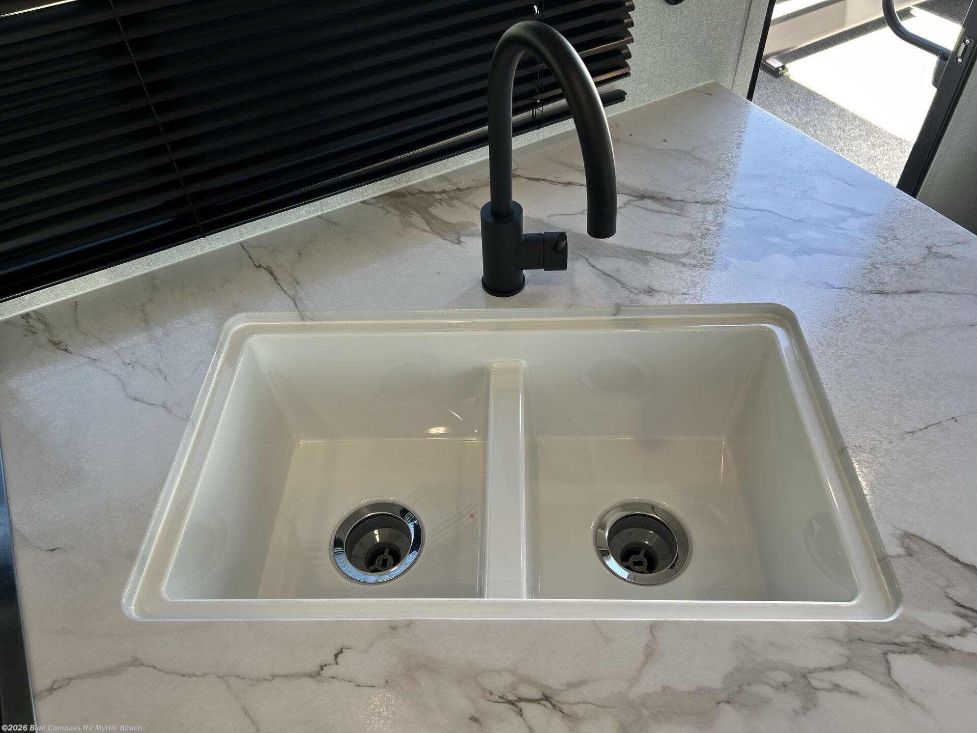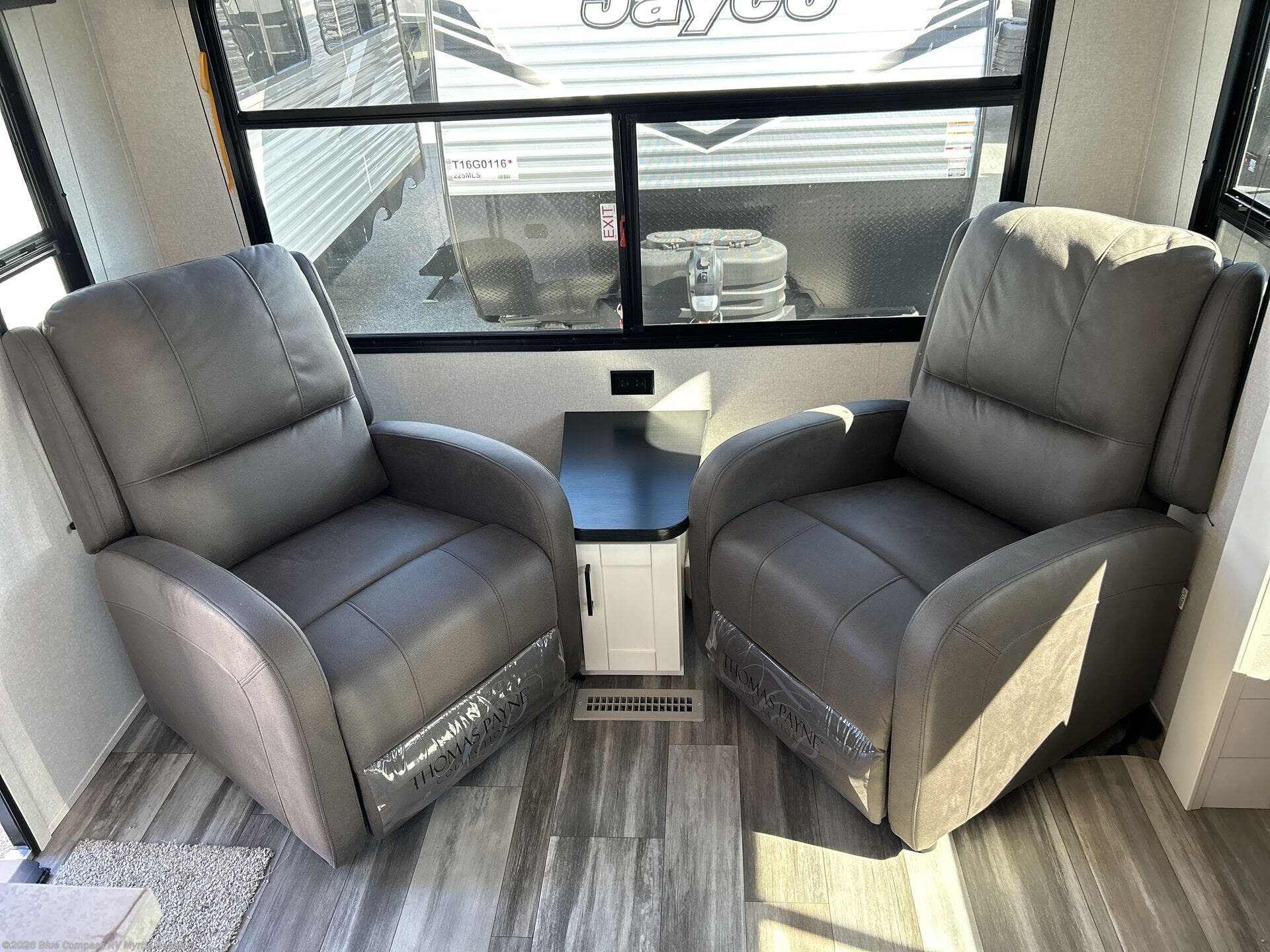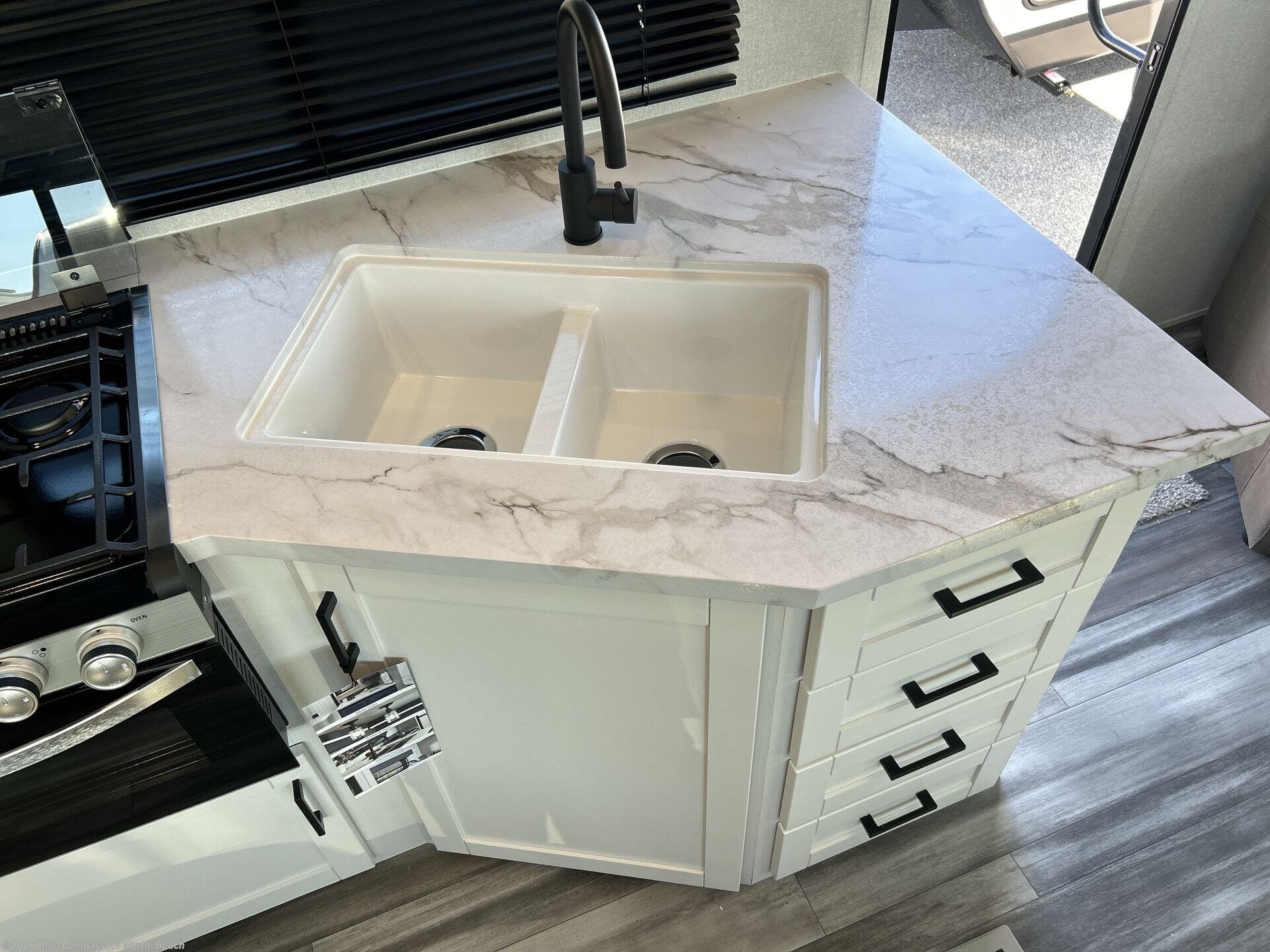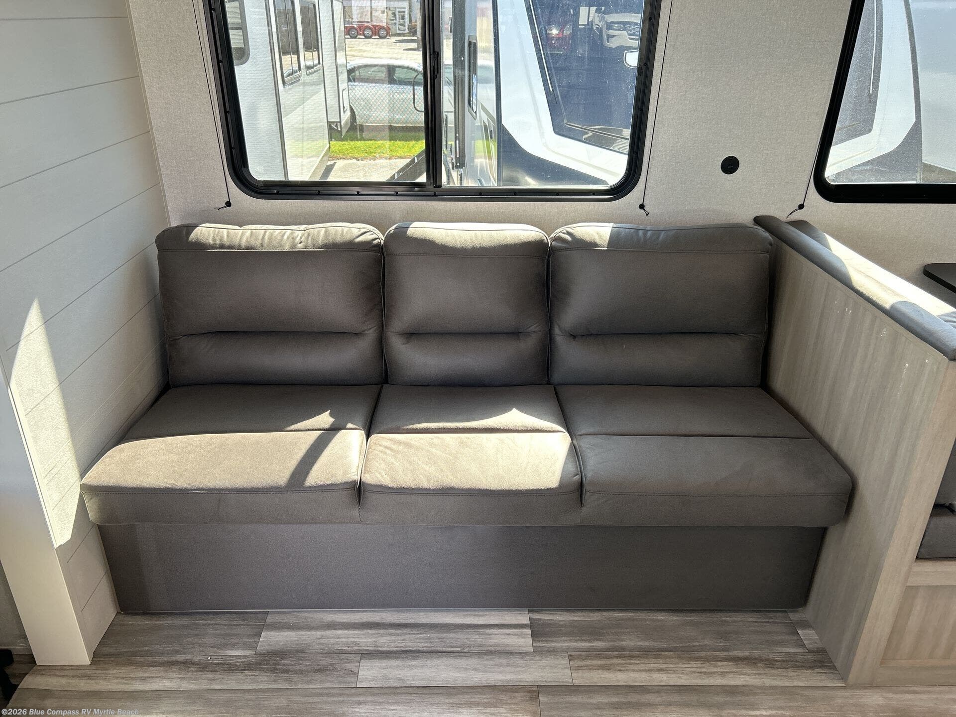 You can comfortably sleep up to six people in this trailer thanks to the RV queen bed in the front bedroom, plus the booth dinette and jack-knife sofa in the main living area! The chef of your crew will have a three burner cooktop and microwave oven to prepare meals, and everyone can store their favorite drinks in the 8 cu. ft. 12V refrigerator. The walk-through bath is spacious and includes a radius shower, toilet, a sink, and linen closet and is the full width of the unit. The outside storage will let you bring along camp chairs and games, fishing poles and more, plus the 18' 3" power awning with LED lights will create a nice place to gather in the evenings!