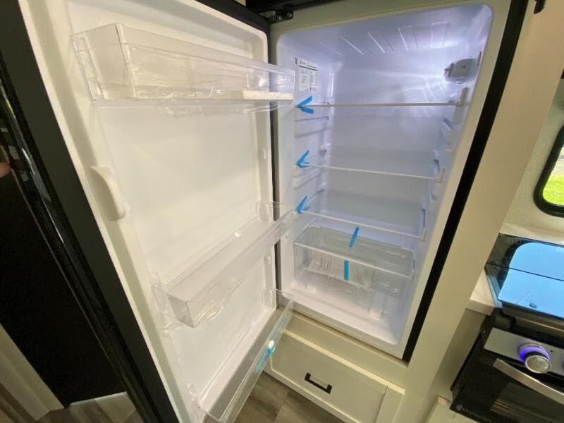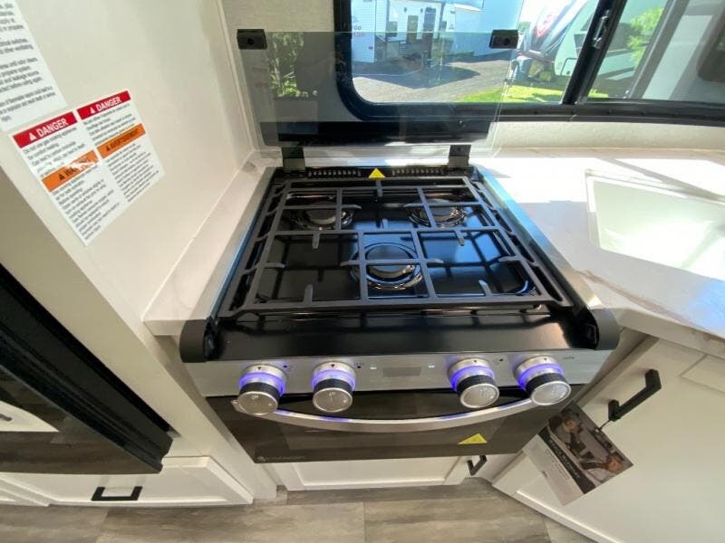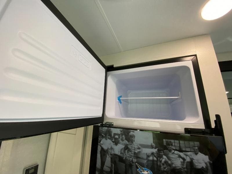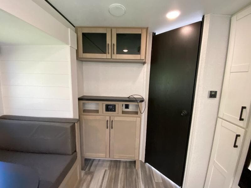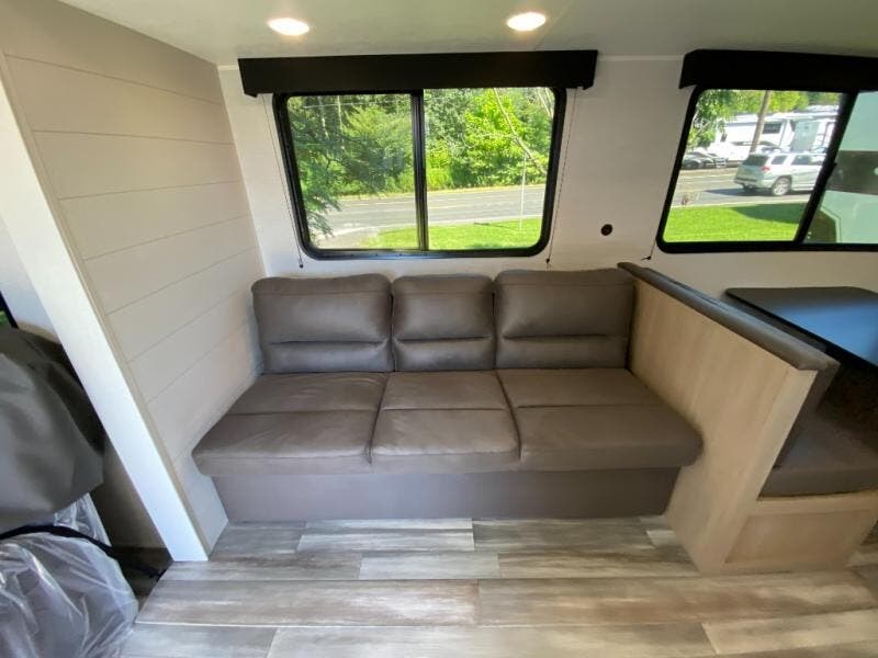 You can comfortably sleep up to six people in this trailer thanks to the RV queen bed in the front bedroom, plus the booth dinette and jack-knife sofa in the main living area! The chef of your crew will have a three burner cooktop and microwave oven to prepare meals, and everyone can store their favorite drinks in the 8 cu. ft. 12V refrigerator. The walk-through bath is spacious and includes a radius shower, toilet, a sink, and linen closet and is the full width of the unit. The outside storage will let you bring along camp chairs and games, fishing poles and more, plus the 18' 3" power awning with LED lights will create a nice place to gather in the evenings!