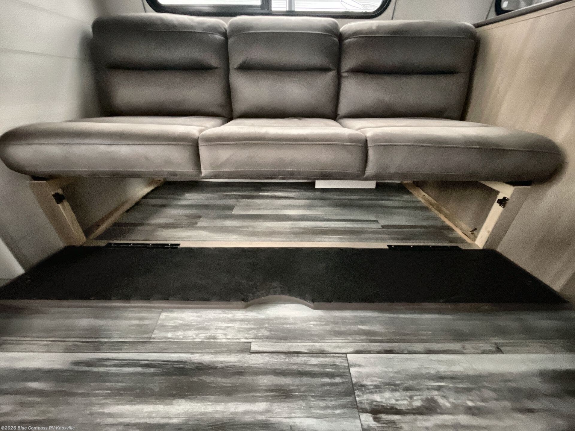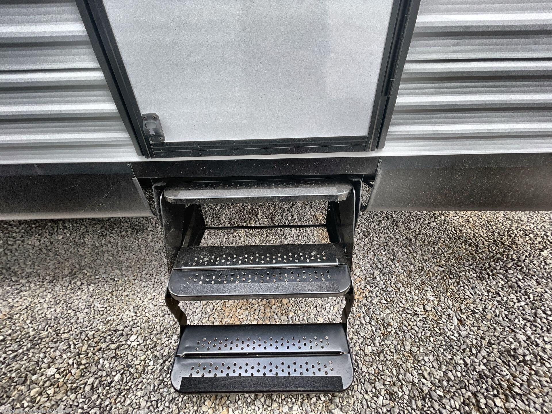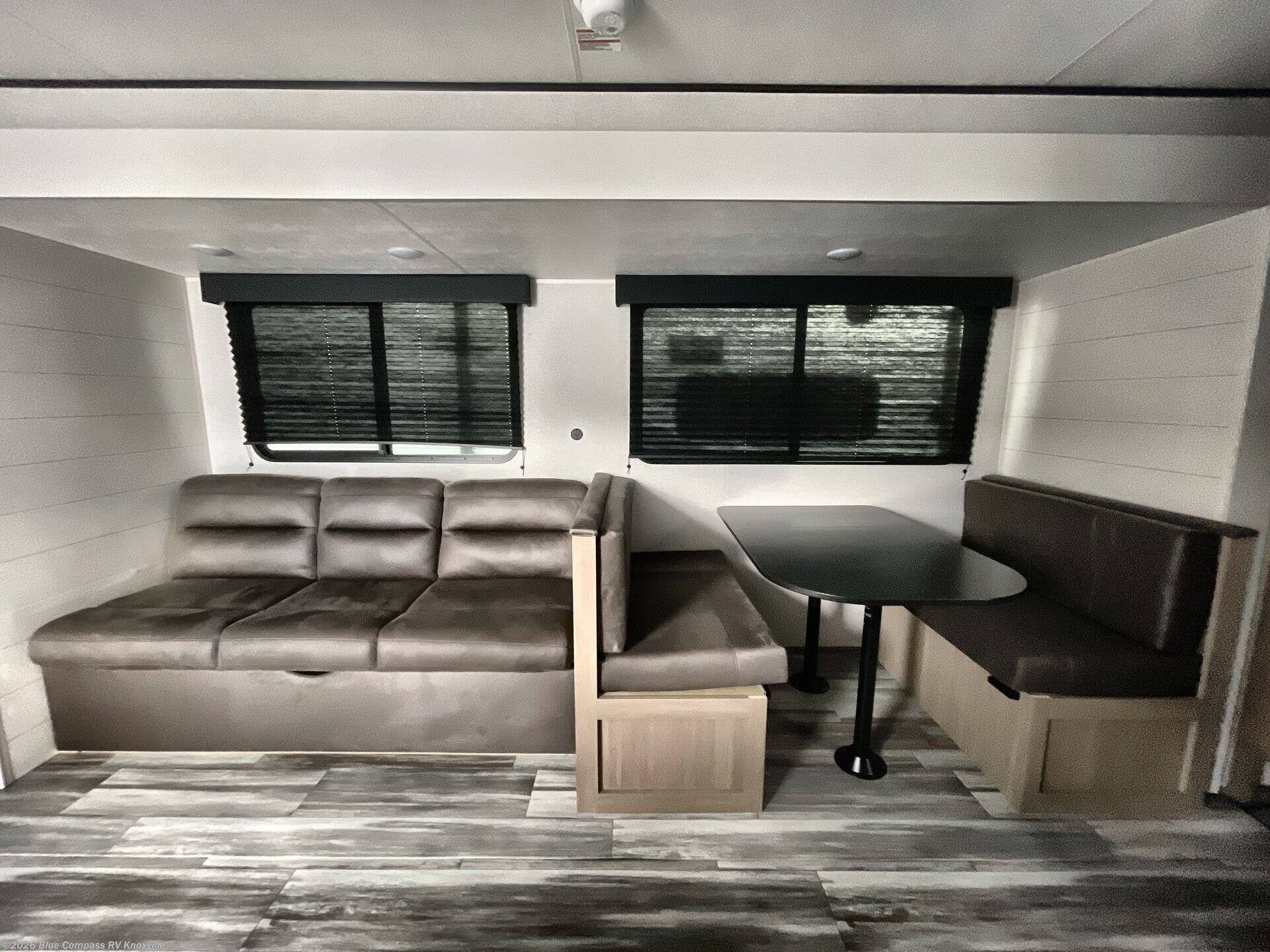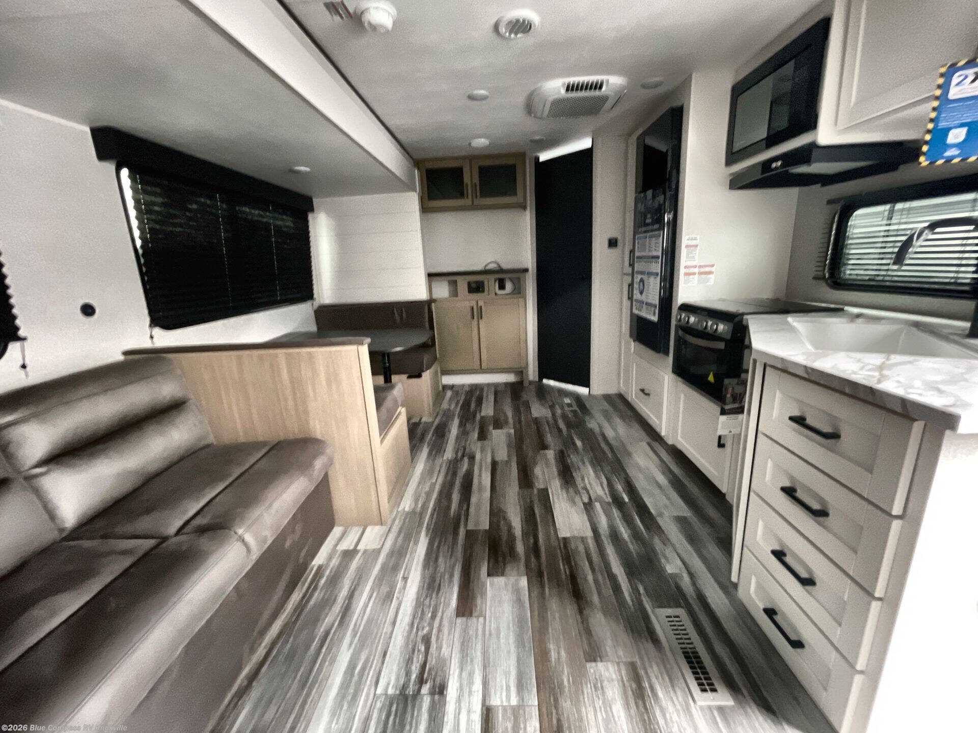 You can comfortably sleep up to six people in this trailer thanks to the RV queen bed in the front bedroom, plus the booth dinette and jack-knife sofa in the main living area! The chef of your crew will have a three burner cooktop and microwave oven to prepare meals, and everyone can store their favorite drinks in the 8 cu. ft. 12V refrigerator. The walk-through bath is spacious and includes a radius shower, toilet, a sink, and linen closet and is the full width of the unit. The outside storage will let you bring along camp chairs and games, fishing poles and more, plus the 18' 3" power awning with LED lights will create a nice place to gather in the evenings!