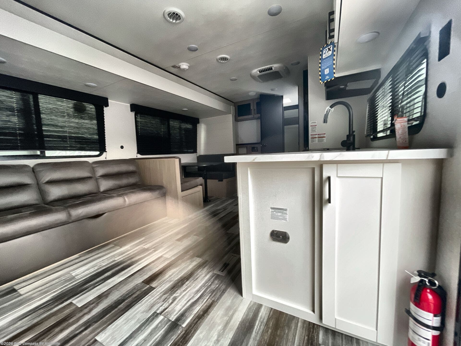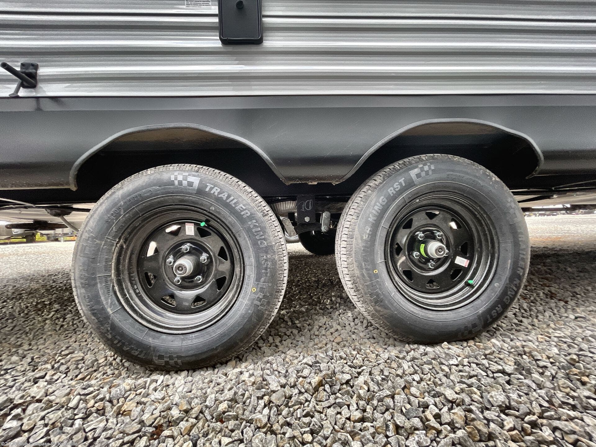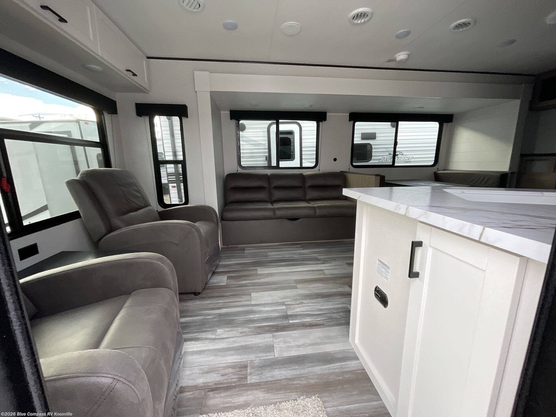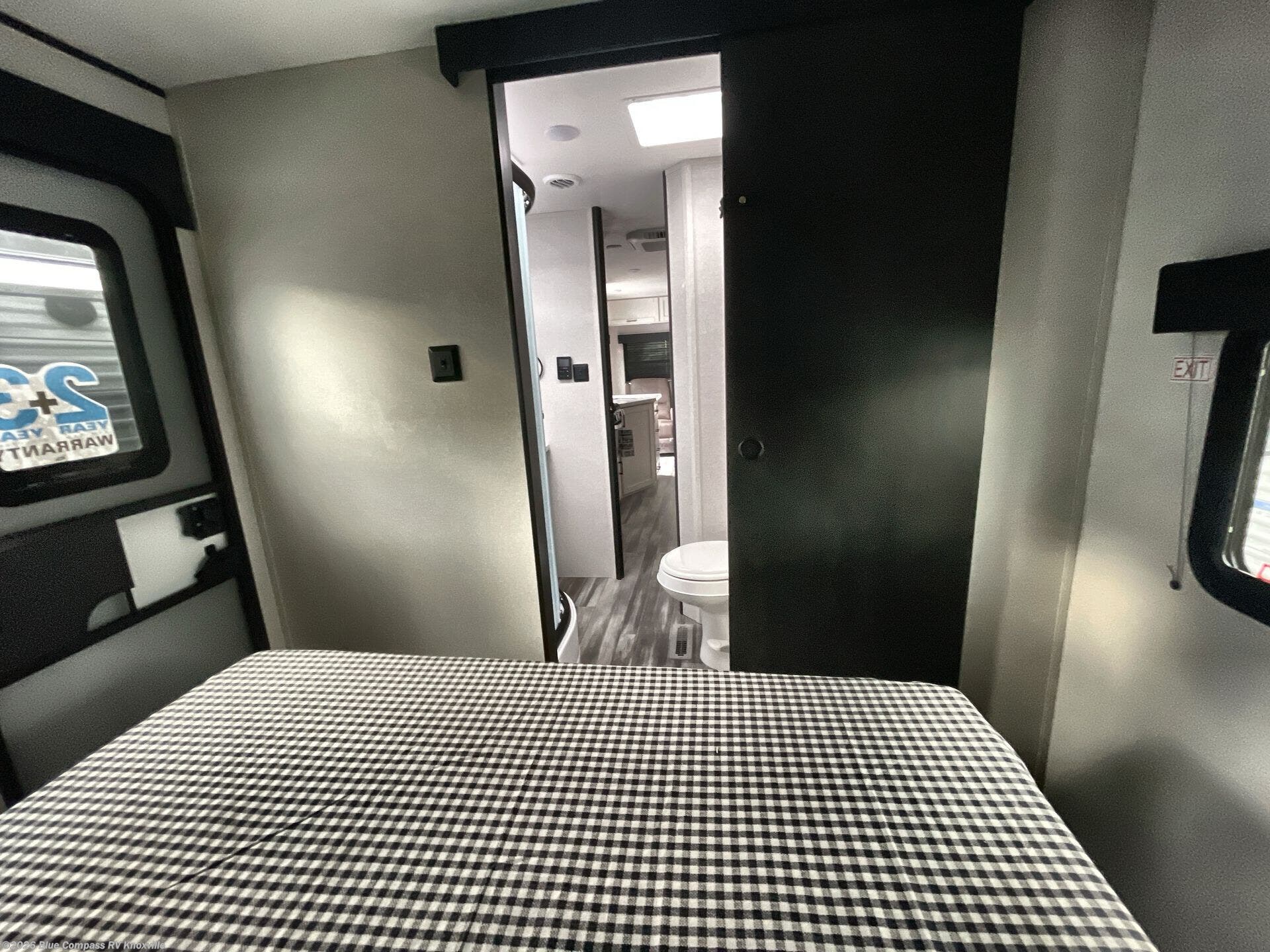 You can comfortably sleep up to six people in this trailer thanks to the RV queen bed in the front bedroom, plus the booth dinette and jack-knife sofa in the main living area! The chef of your crew will have a three burner cooktop and microwave oven to prepare meals, and everyone can store their favorite drinks in the 8 cu. ft. 12V refrigerator. The walk-through bath is spacious and includes a radius shower, toilet, a sink, and linen closet and is the full width of the unit. The outside storage will let you bring along camp chairs and games, fishing poles and more, plus the 18' 3" power awning with LED lights will create a nice place to gather in the evenings!
