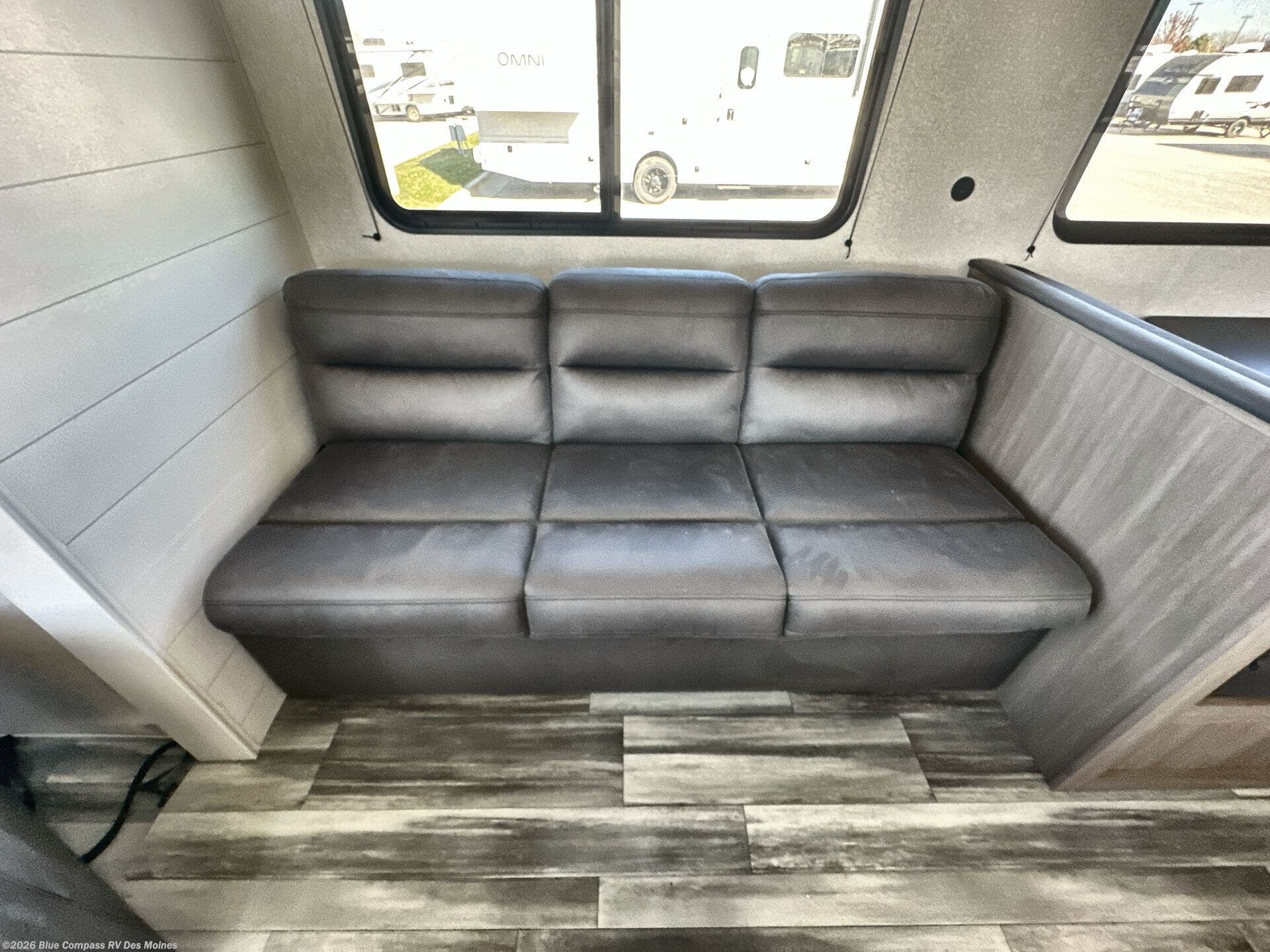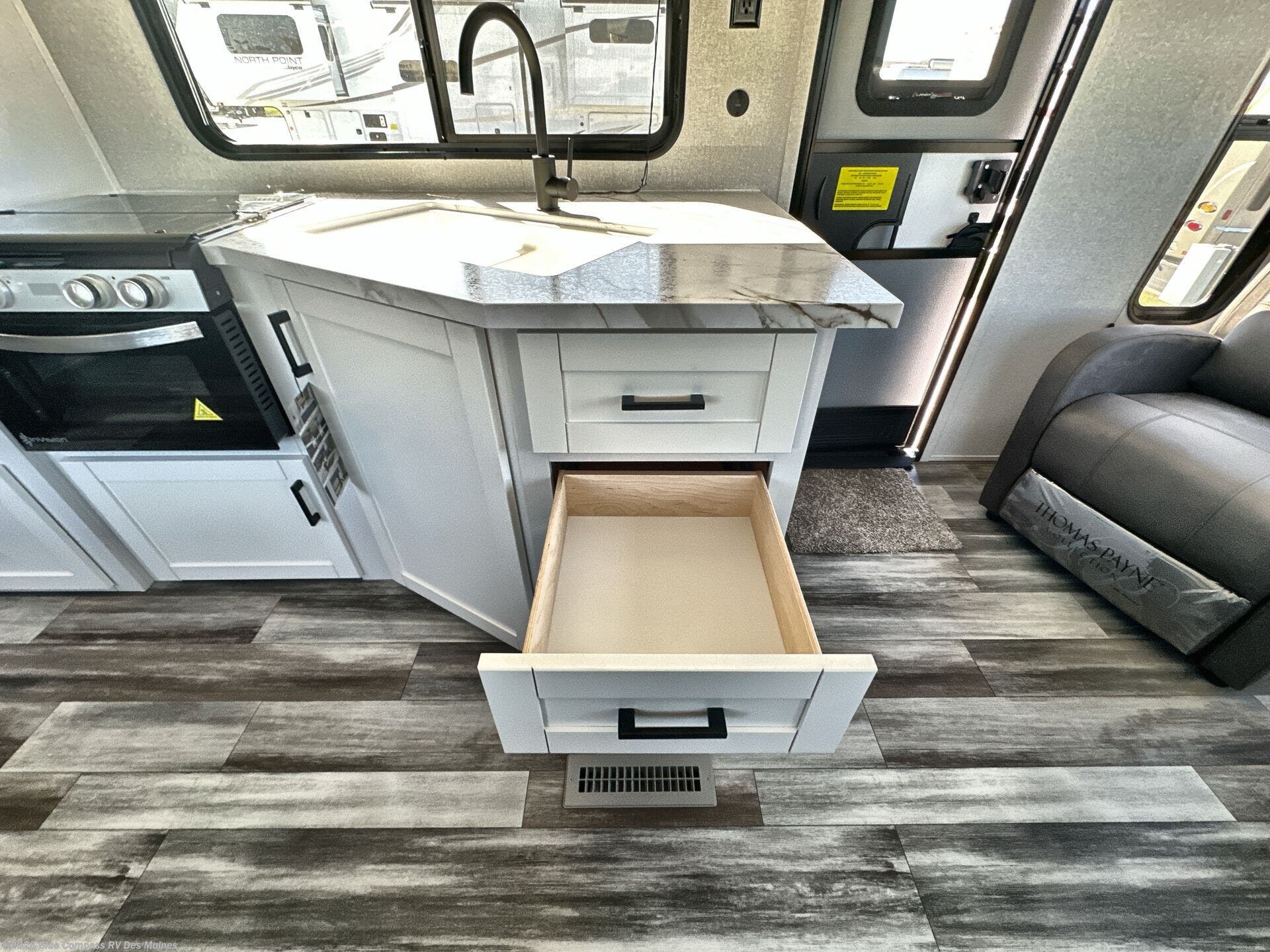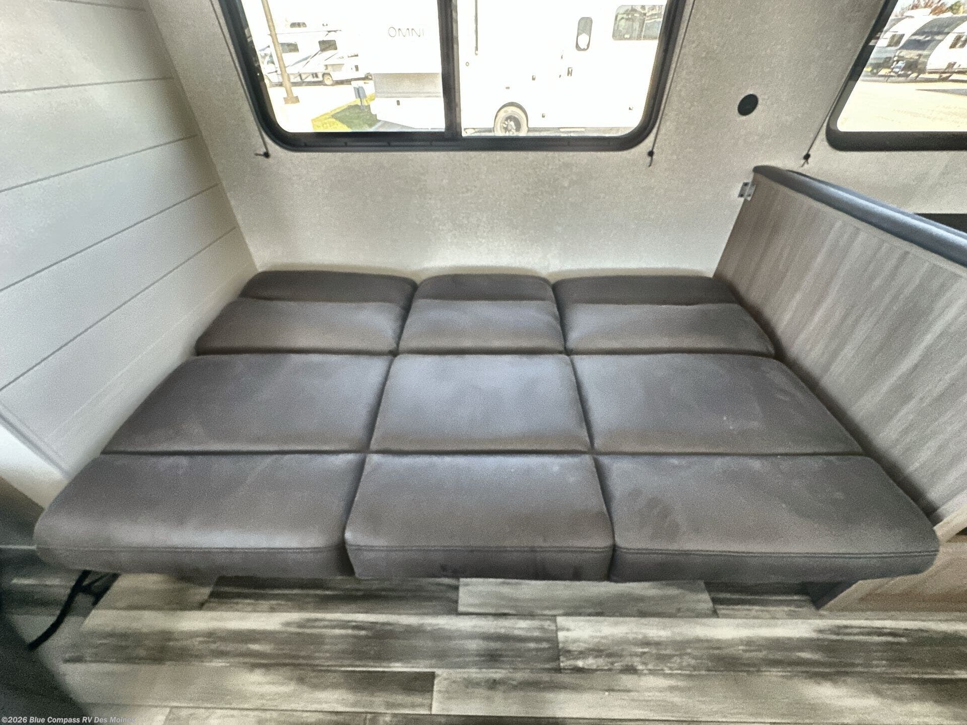 You can comfortably sleep up to six people in this trailer thanks to the RV queen bed in the front bedroom, plus the booth dinette and jack-knife sofa in the main living area! The chef of your crew will have a three burner cooktop and microwave oven to prepare meals, and everyone can store their favorite drinks in the 8 cu. ft. 12V refrigerator. The walk-through bath is spacious and includes a radius shower, toilet, a sink, and linen closet and is the full width of the unit. The outside storage will let you bring along camp chairs and games, fishing poles and more, plus the 18' 3" power awning with LED lights will create a nice place to gather in the evenings!