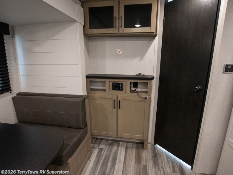 You can comfortably sleep up to six people in this trailer thanks to the RV queen bed in the front bedroom, plus the booth dinette and jack-knife sofa in the main living area! The chef of your crew will have a three burner cooktop and microwave oven to prepare meals, and everyone can store their favorite drinks in the 8 cu. ft. 12V refrigerator. The walk-through bath is spacious and includes a radius shower, toilet, a sink, and linen closet and is the full width of the unit. The outside storage will let you bring along camp chairs and games, fishing poles and more, plus the 18' 3" power awning with LED lights will create a nice place to gather in the evenings!