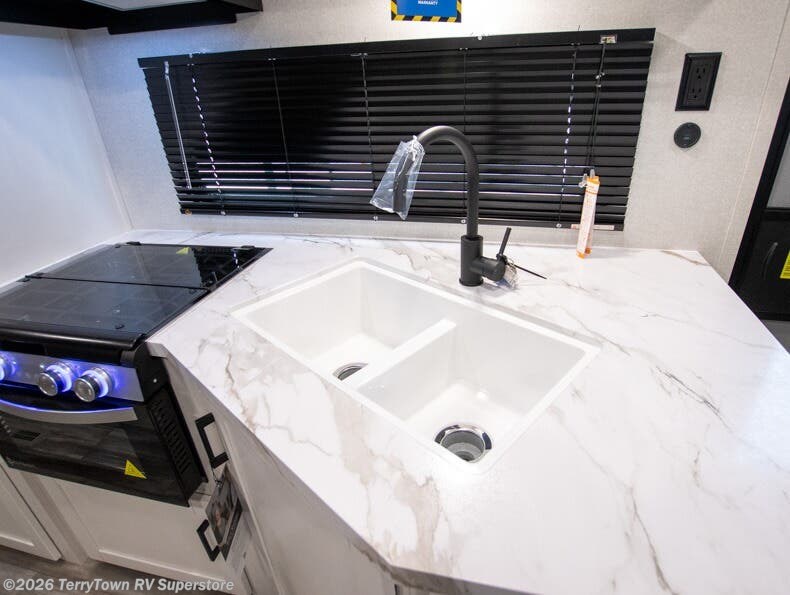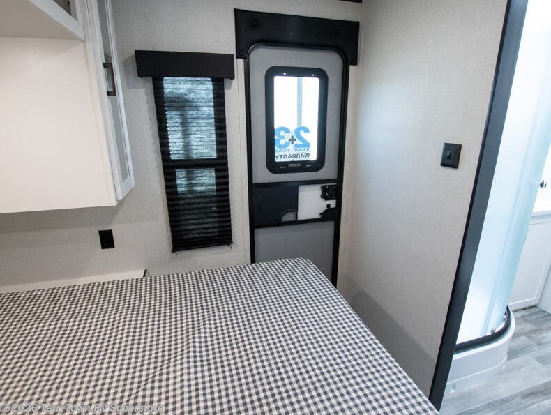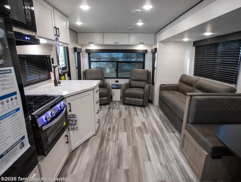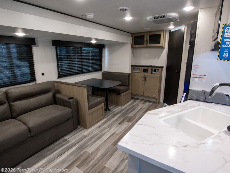 You can comfortably sleep up to six people in this trailer thanks to the RV queen bed in the front bedroom, plus the booth dinette and jack-knife sofa in the main living area! The chef of your crew will have a three burner cooktop and microwave oven to prepare meals, and everyone can store their favorite drinks in the 8 cu. ft. 12V refrigerator. The walk-through bath is spacious and includes a radius shower, toilet, a sink, and linen closet and is the full width of the unit. The outside storage will let you bring along camp chairs and games, fishing poles and more, plus the 18' 3" power awning with LED lights will create a nice place to gather in the evenings!