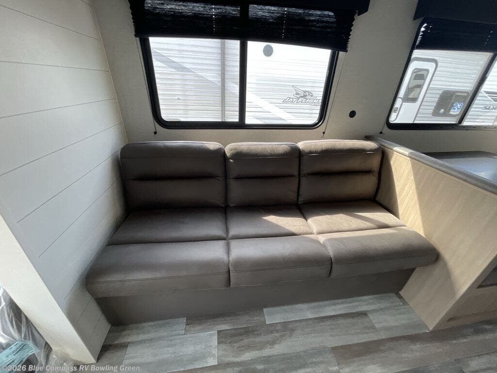 You can comfortably sleep up to six people in this trailer thanks to the RV queen bed in the front bedroom, plus the booth dinette and jack-knife sofa in the main living area! The chef of your crew will have a three burner cooktop and microwave oven to prepare meals, and everyone can store their favorite drinks in the 8 cu. ft. 12V refrigerator. The walk-through bath is spacious and includes a radius shower, toilet, a sink, and linen closet and is the full width of the unit. The outside storage will let you bring along camp chairs and games, fishing poles and more, plus the 18' 3" power awning with LED lights will create a nice place to gather in the evenings!