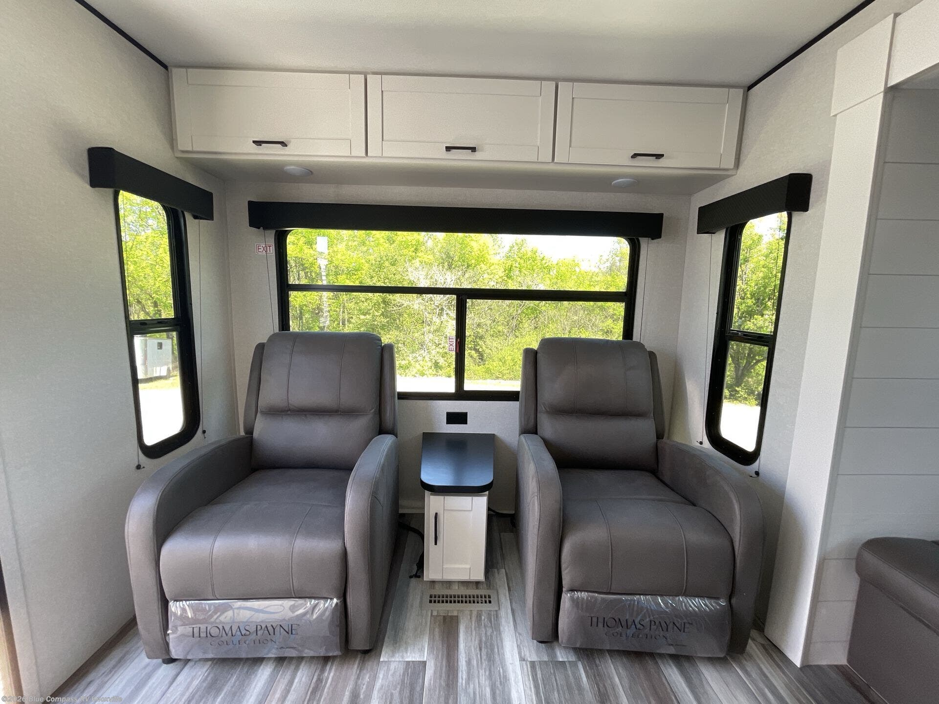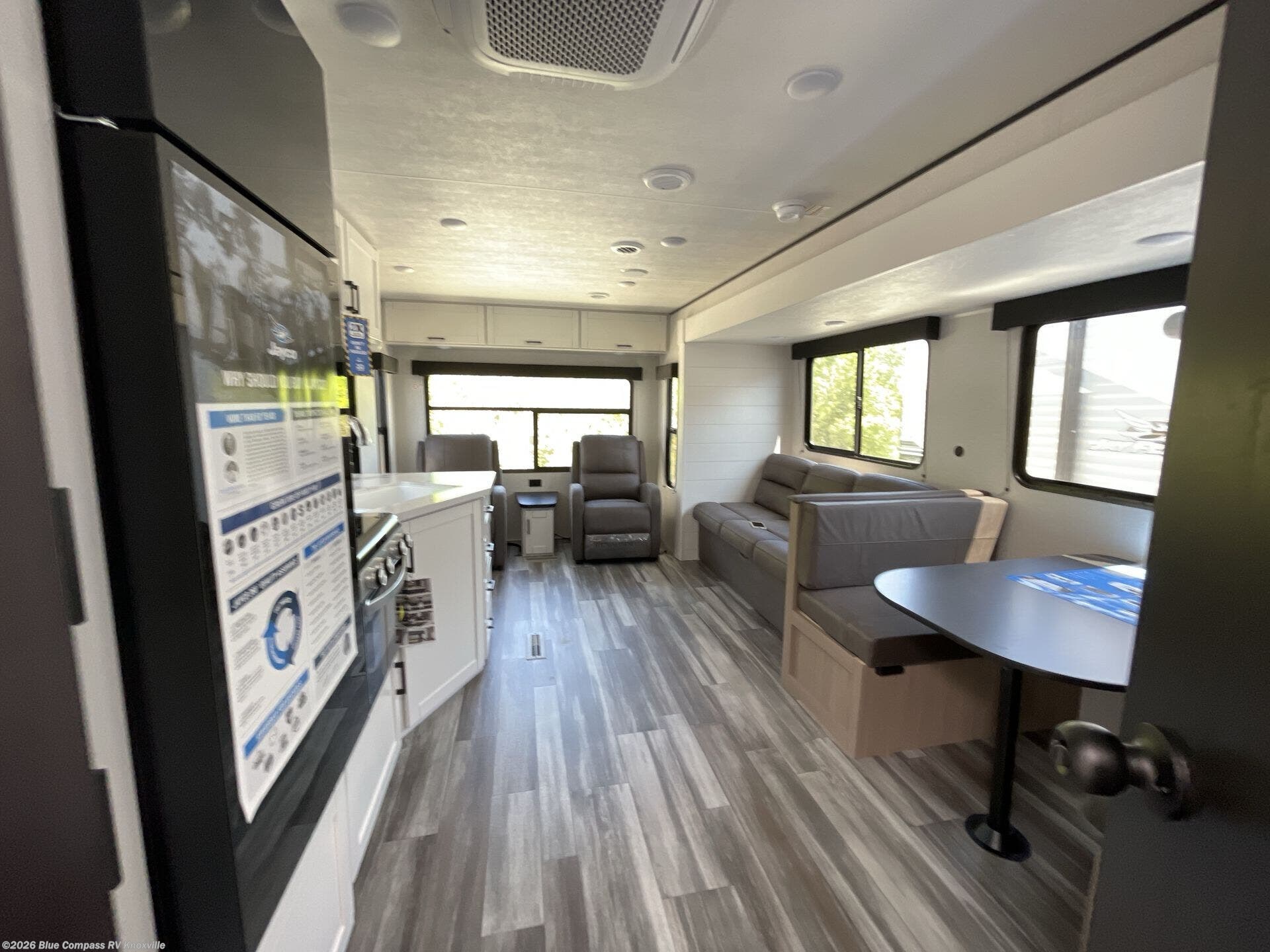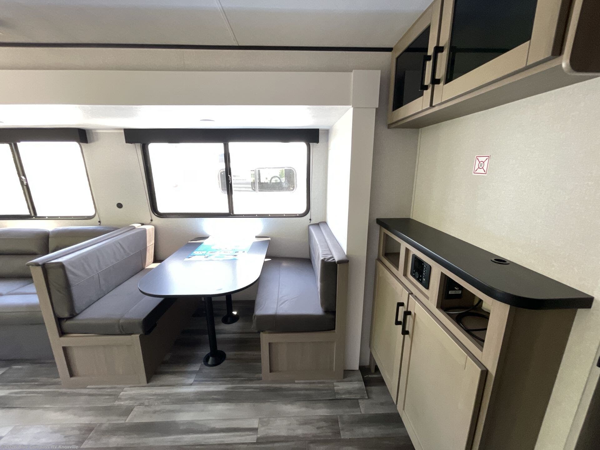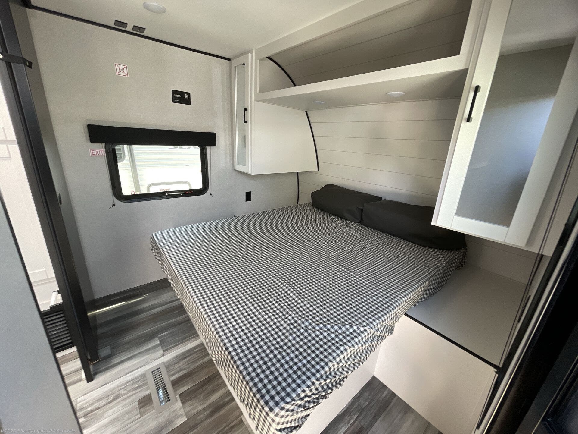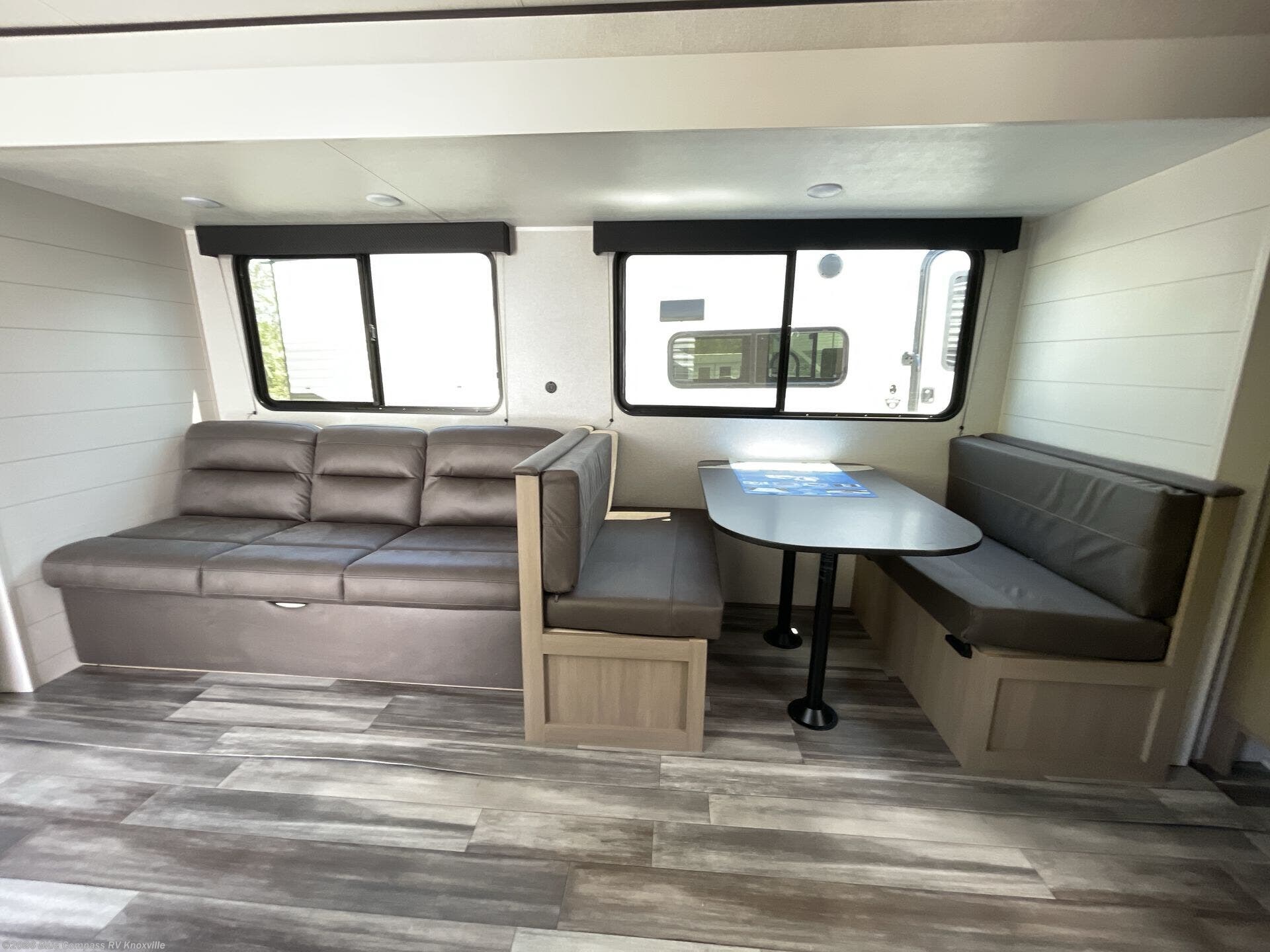 You can comfortably sleep up to six people in this trailer thanks to the RV queen bed in the front bedroom, plus the booth dinette and jack-knife sofa in the main living area! The chef of your crew will have a three burner cooktop and microwave oven to prepare meals, and everyone can store their favorite drinks in the 8 cu. ft. 12V refrigerator. The walk-through bath is spacious and includes a radius shower, toilet, a sink, and linen closet and is the full width of the unit. The outside storage will let you bring along camp chairs and games, fishing poles and more, plus the 18' 3" power awning with LED lights will create a nice place to gather in the evenings!