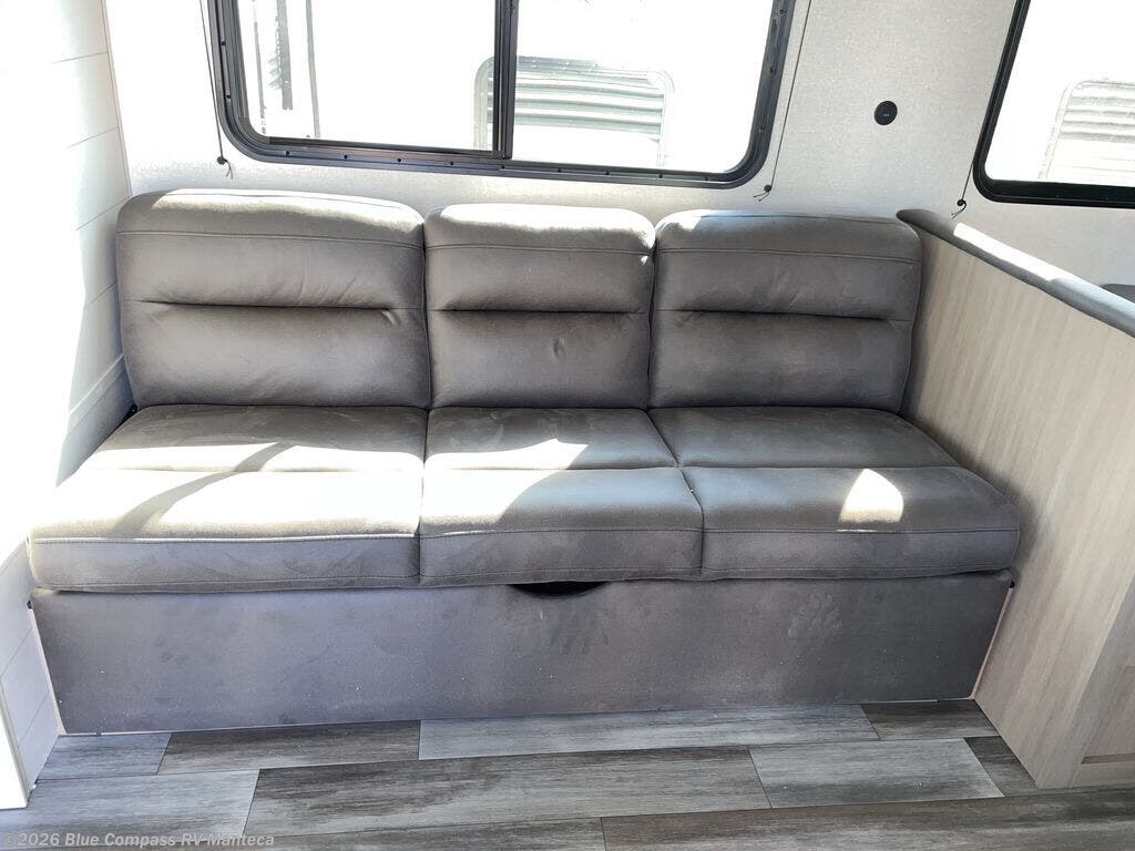 You can comfortably sleep up to six people in this trailer thanks to the RV queen bed in the front bedroom, plus the booth dinette and jack-knife sofa in the main living area! The chef of your crew will have a three burner cooktop and microwave oven to prepare meals, and everyone can store their favorite drinks in the 8 cu. ft. 12V refrigerator. The walk-through bath is spacious and includes a radius shower, toilet, a sink, and linen closet and is the full width of the unit. The outside storage will let you bring along camp chairs and games, fishing poles and more, plus the 18' power awning with LED lights will create a nice place to gather in the evenings!