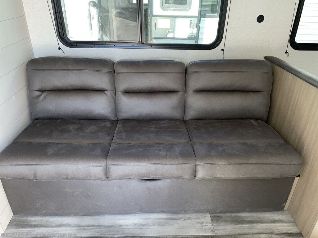 You can comfortably sleep up to six people in this trailer thanks to the RV queen bed in the front bedroom, plus the booth dinette and jack-knife sofa in the main living area! The chef of your crew will have a three burner cooktop and microwave oven to prepare meals, and everyone can store their favorite drinks in the 8 cu. ft. 12V refrigerator. The walk-through bath is spacious and includes a radius shower, toilet, a sink, and linen closet and is the full width of the unit. The outside storage will let you bring along camp chairs and games, fishing poles and more, plus the 18' power awning with LED lights will create a nice place to gather in the evenings!
