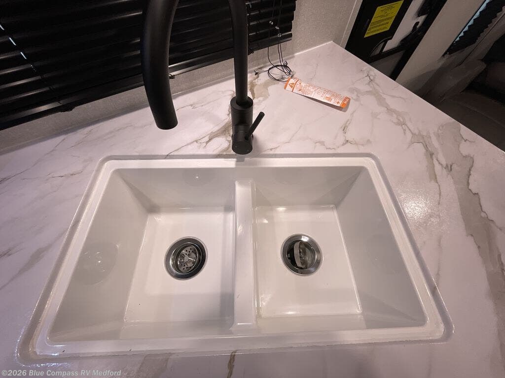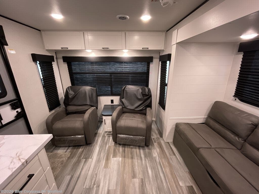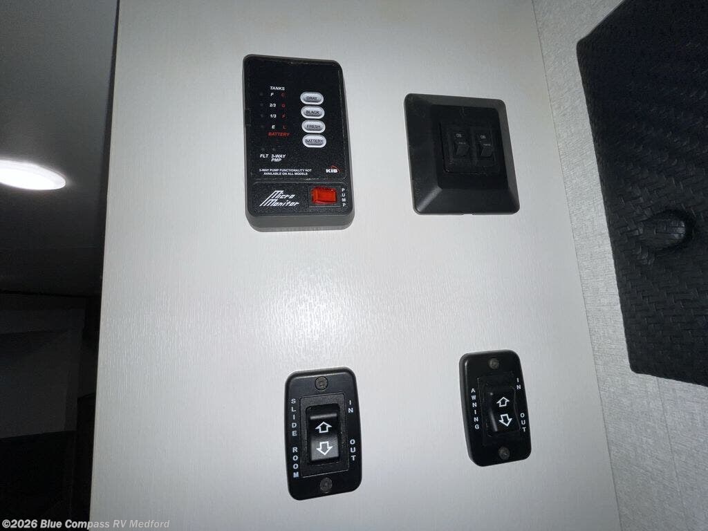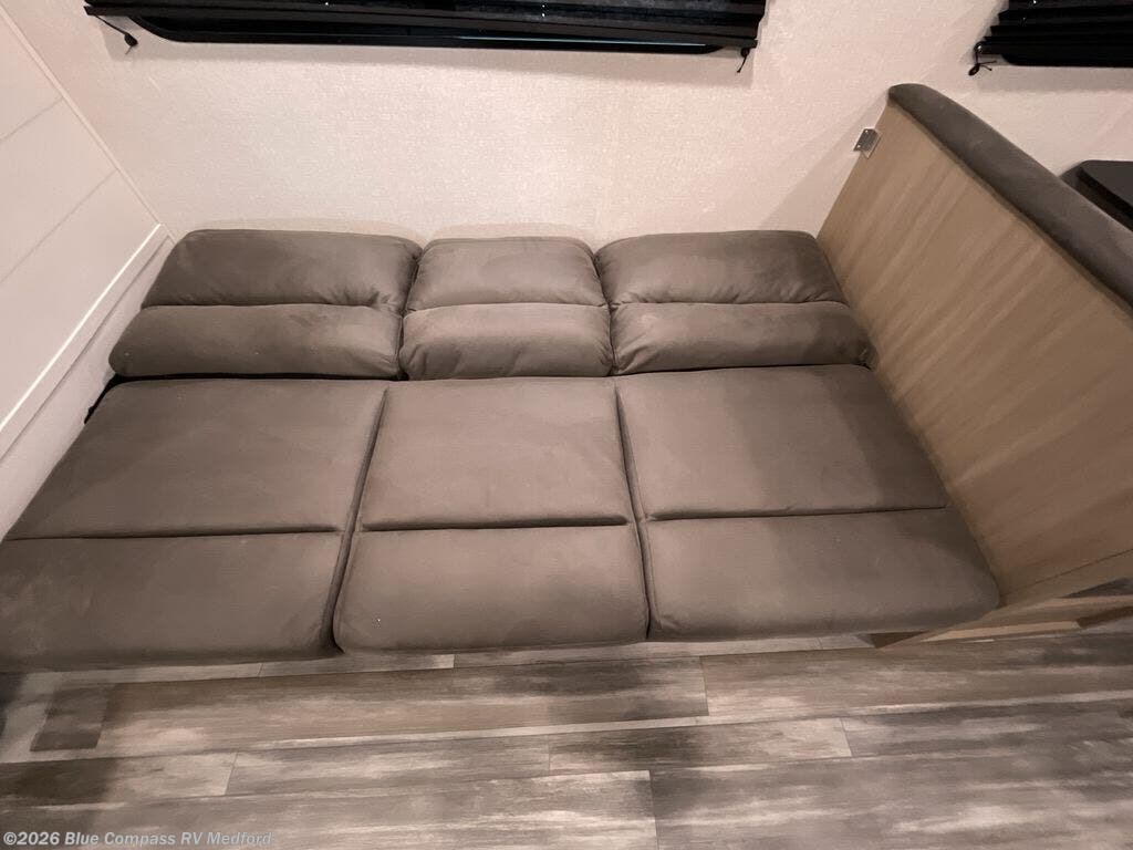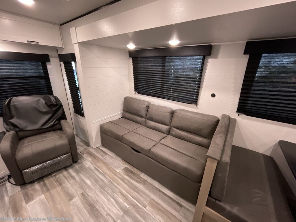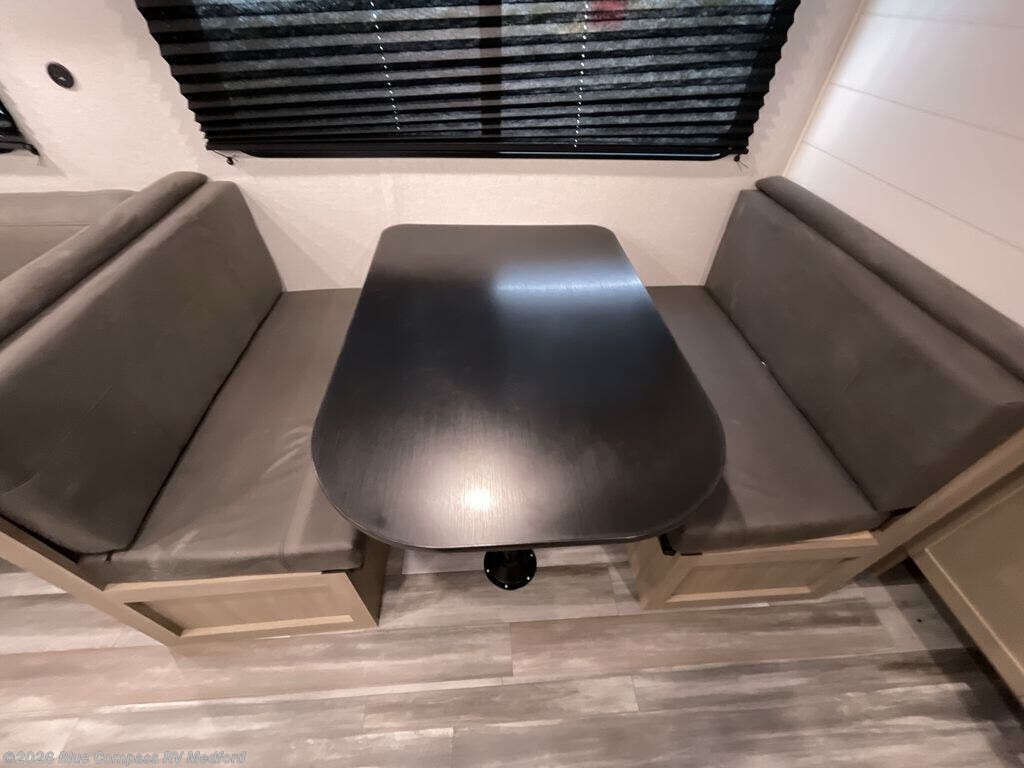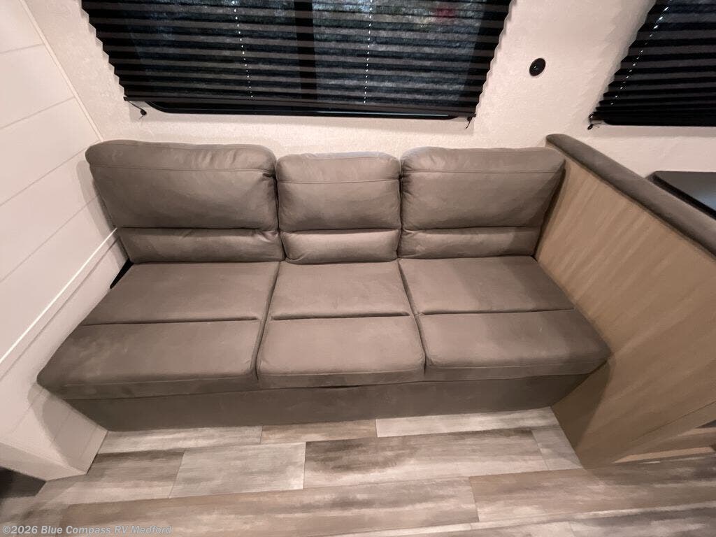 You can comfortably sleep up to six people in this trailer thanks to the RV queen bed in the front bedroom, plus the booth dinette and jack-knife sofa in the main living area! The chef of your crew will have a three burner cooktop and microwave oven to prepare meals, and everyone can store their favorite drinks in the 8 cu. ft. 12V refrigerator. The walk-through bath is spacious and includes a radius shower, toilet, a sink, and linen closet and is the full width of the unit. The outside storage will let you bring along camp chairs and games, fishing poles and more, plus the 18' power awning with LED lights will create a nice place to gather in the evenings!