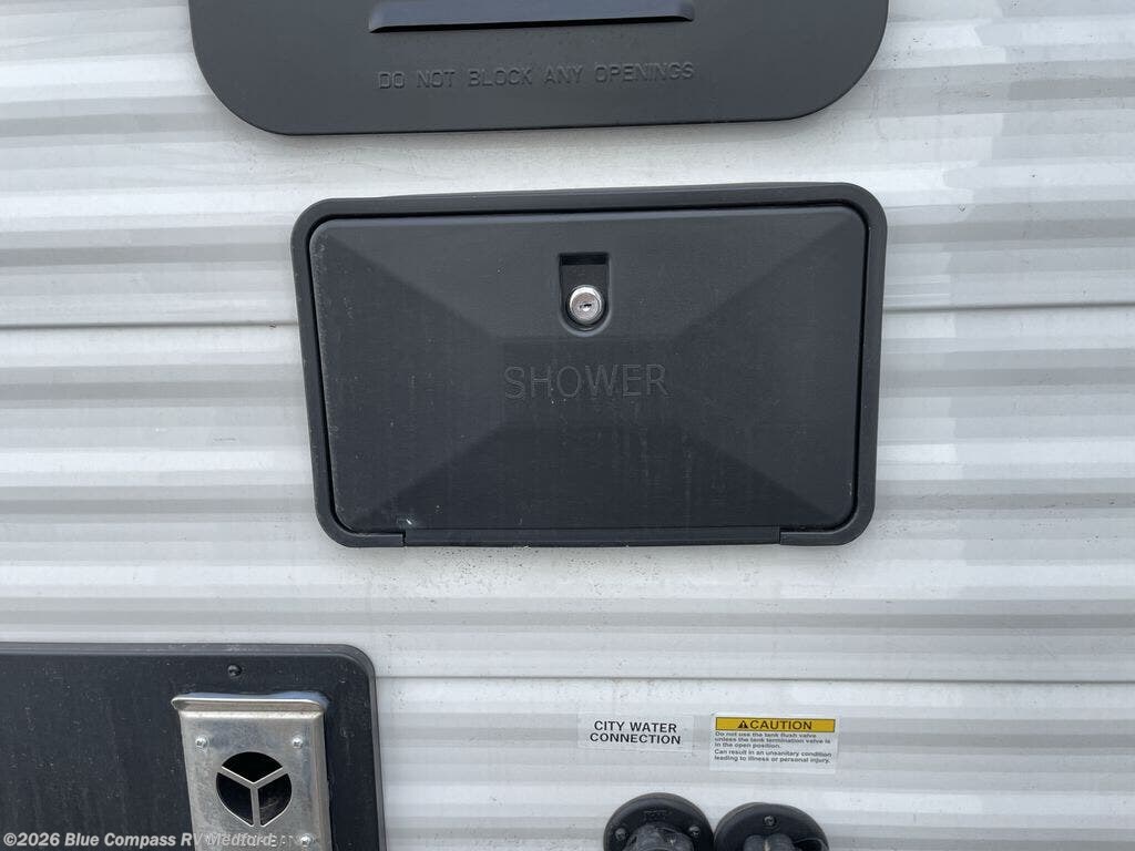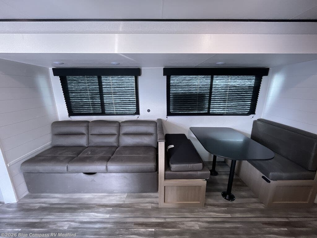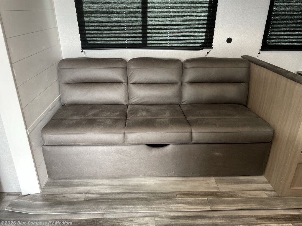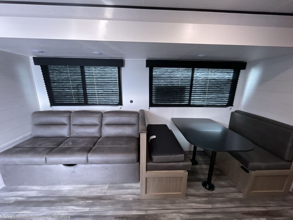 You can comfortably sleep up to six people in this trailer thanks to the RV queen bed in the front bedroom, plus the booth dinette and jack-knife sofa in the main living area! The chef of your crew will have a three burner cooktop and microwave oven to prepare meals, and everyone can store their favorite drinks in the 8 cu. ft. 12V refrigerator. The walk-through bath is spacious and includes a radius shower, toilet, a sink, and linen closet and is the full width of the unit. The outside storage will let you bring along camp chairs and games, fishing poles and more, plus the 18' power awning with LED lights will create a nice place to gather in the evenings!