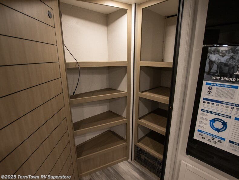 If space is what you're looking for in your next trailer, space is what you'll get this this Jay Flight SLX! The large slide houses the jack-knife sofa and booth dinette, and the added space here will provide everyone room to move about. The chef of your group will love cooking inside, or they can head outside to cook on the outdoor kitchen. Double-size bunks are sure to be a big hit with the little ones, and you'll love having your own space up front in the private bedroom. This unit includes ample storage space, including a hidden pantry with shelves, a bedroom closet plus dual bedside wardrobes, plus exterior storage for hiking or fishing gear!