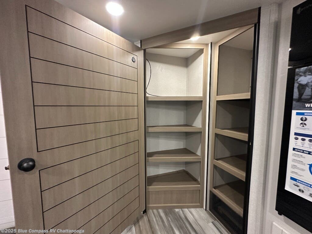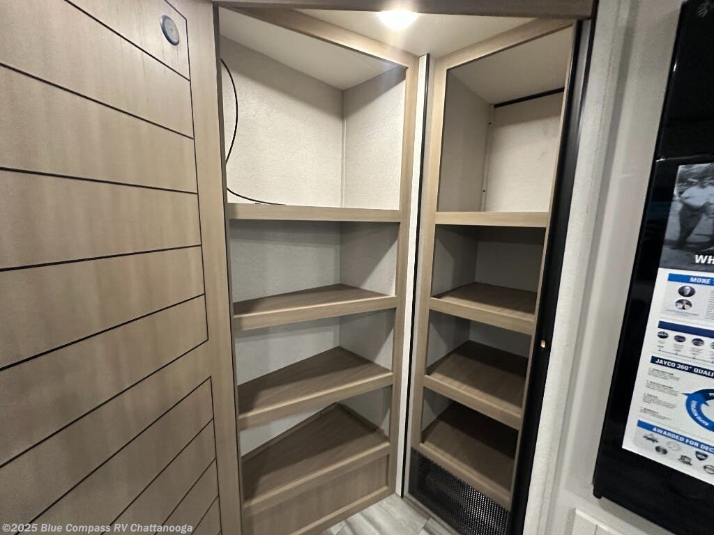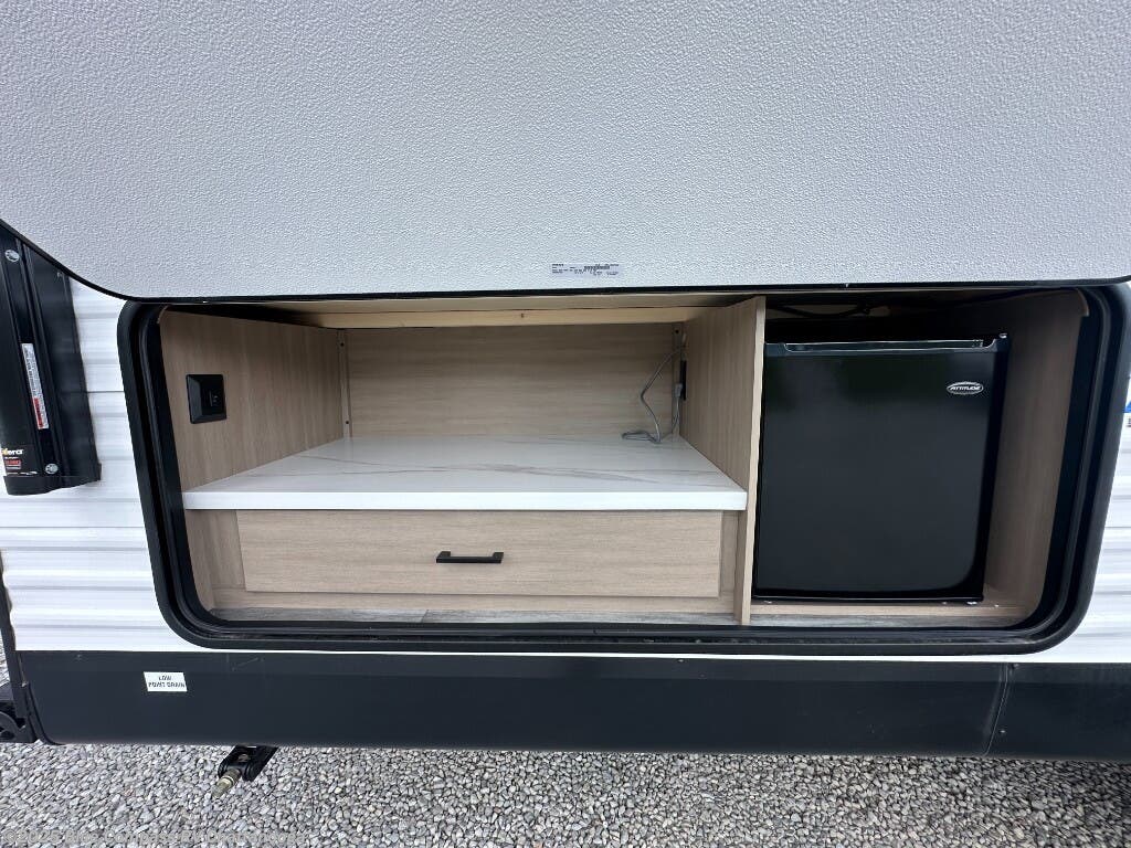 If space is what you're looking for in your next trailer, space is what you'll get this this Jay Flight SLX! The large slide houses the jack-knife sofa and booth dinette, and the added space here will provide everyone room to move about. The chef of your group will love cooking inside, or they can head outside to cook on the outdoor kitchen. Double-size bunks are sure to be a big hit with the little ones, and you'll love having your own space up front in the private bedroom. This unit includes ample storage space, including a hidden pantry with shelves, a bedroom closet plus dual bedside wardrobes, plus exterior storage for hiking or fishing gear!