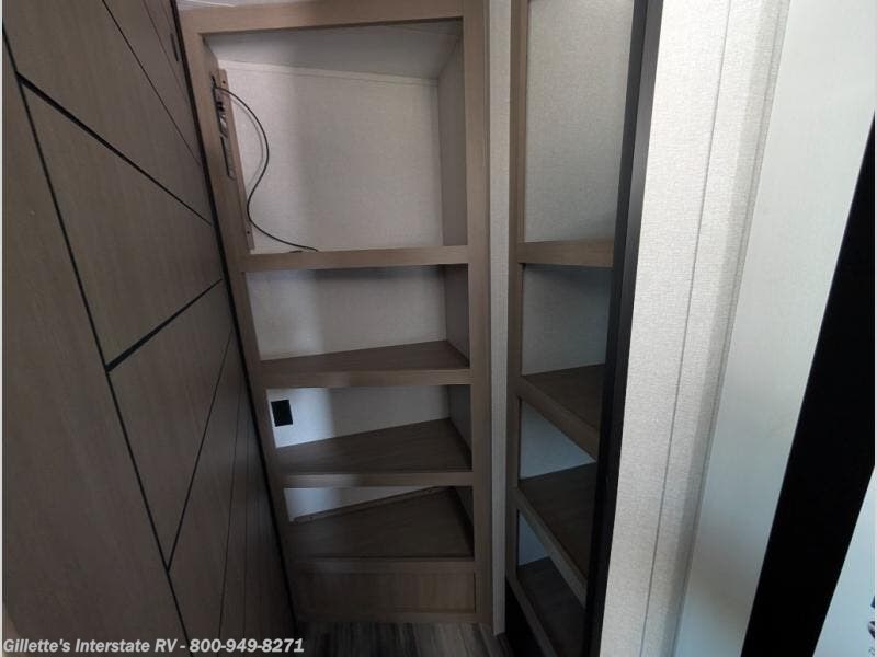 If space is what you're looking for in your next trailer, space is what you'll get this this Jay Flight SLX! The large slide houses the jack-knife sofa and booth dinette, and the added space here will provide everyone room to move about. The chef of your group will love cooking inside, or they can head outside to cook on the outdoor kitchen. Double-size bunks are sure to be a big hit with the little ones, and you'll love having your own space up front in the private bedroom. This unit includes ample storage space, including a hidden pantry with shelves, a bedroom closet plus dual bedside wardrobes, plus exterior storage for hiking or fishing gear!