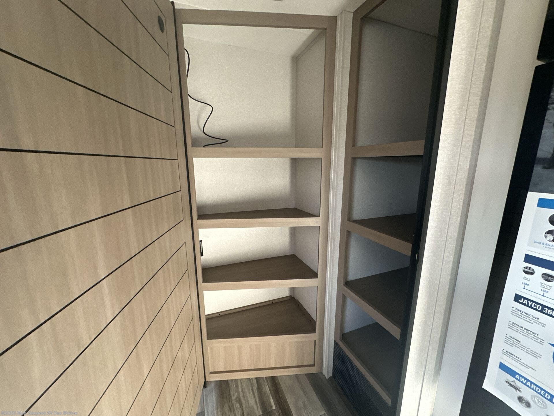 If space is what you're looking for in your next trailer, space is what you'll get this this Jay Flight SLX! The large slide houses the jack-knife sofa and booth dinette, and the added space here will provide everyone room to move about. The chef of your group will love cooking inside, or they can head outside to cook on the outdoor kitchen. Double-size bunks are sure to be a big hit with the little ones, and you'll love having your own space up front in the private bedroom. This unit includes ample storage space, including a hidden pantry with shelves, a bedroom closet plus dual bedside wardrobes, plus exterior storage for hiking or fishing gear!