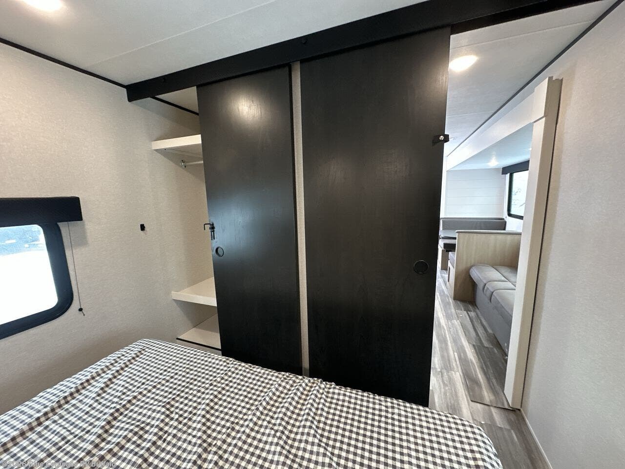 If space is what you're looking for in your next trailer, space is what you'll get this this Jay Flight SLX! The large slide houses the jack-knife sofa and booth dinette, and the added space here will provide everyone room to move about. The chef of your group will love cooking inside, or they can head outside to cook on the outdoor kitchen. Double-size bunks are sure to be a big hit with the little ones, and you'll love having your own space up front in the private bedroom. This unit includes ample storage space, including a hidden pantry with shelves, a bedroom closet plus dual bedside wardrobes, plus exterior storage for hiking or fishing gear!