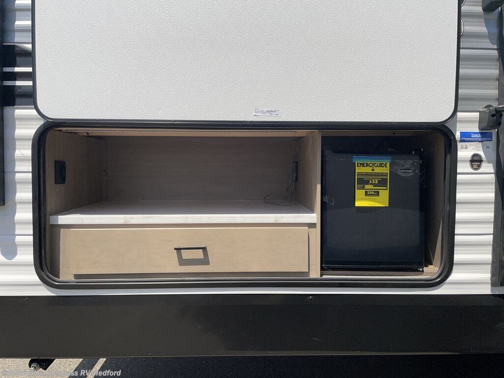 If space is what you're looking for in your next trailer, space is what you'll get this this Jay Flight SLX! The large slide houses the jack-knife sofa and booth dinette, and the added space here will provide everyone room to move about. The chef of your group will love cooking inside, or they can head outside to cook on the outdoor kitchen. Double-size bunks are sure to be a big hit with the little ones, and you'll love having your own space up front in the private bedroom. This unit includes ample storage space, including a hidden pantry with shelves, a bedroom closet plus dual bedside wardrobes, plus exterior storage for hiking or fishing gear!