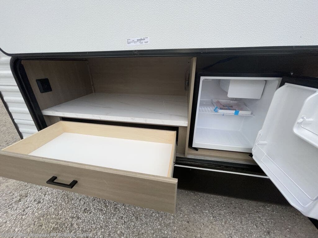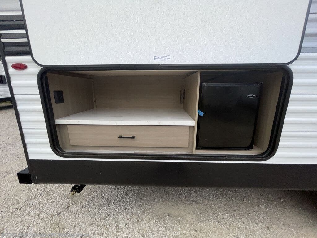 Wherever you decide to camp, you'll be met with comforts each day with this spacious travel trailer. There is a large slide out that will give the dog more space to nap on the floor. Your crew can relax on the jack-knife sofa, play a game at the booth dinette, or visit outdoors under the 16' power awning with LED lights. The outside kitchen is complete with an outdoor refrigerator for cold drinks, and there is an LP Quick Connect if you want to add your own grill. Head inside to clean up in the full bath, then head to bed in the front private bedroom. Here, you'll find a queen bed, dual wardrobes, plus a shelf for books. And your guests can sleep on the double-size bunks and living room furniture!
