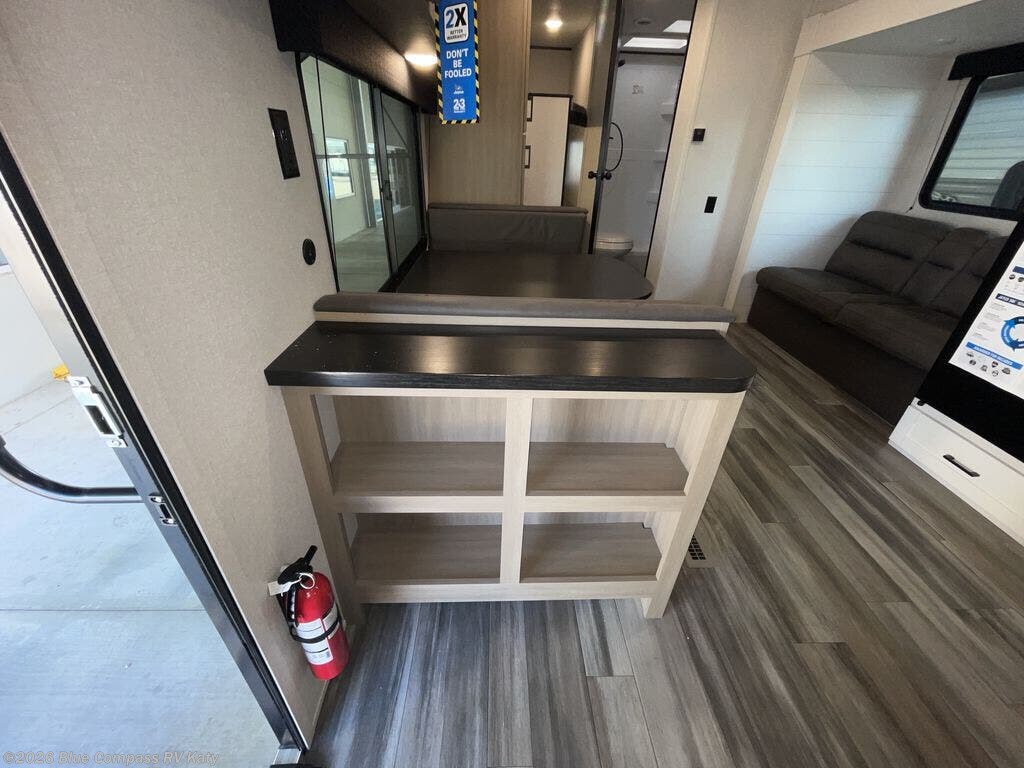 Wherever you decide to camp, you'll be met with comforts each day with this spacious travel trailer. There is a large slide out that will give the dog more space to nap on the floor. Your crew can relax on the jack-knife sofa, play a game at the booth dinette, or visit outdoors under the 16' power awning with LED lights. The outside kitchen is complete with an outdoor refrigerator for cold drinks, and there is an LP Quick Connect if you want to add your own grill. Head inside to clean up in the full bath, then head to bed in the front private bedroom. Here, you'll find a queen bed, dual wardrobes, plus a shelf for books. And your guests can sleep on the double-size bunks and living room furniture!
