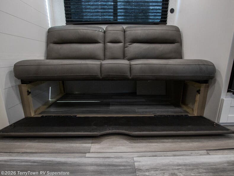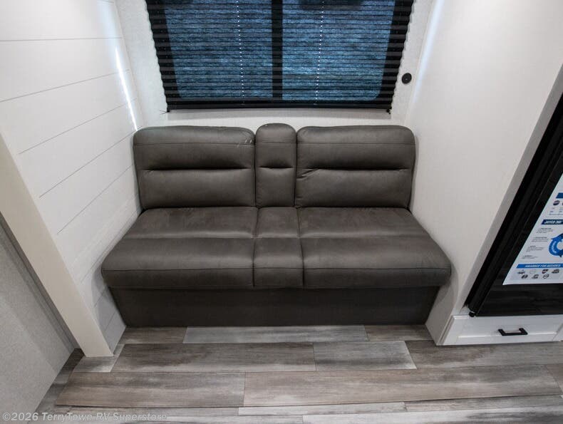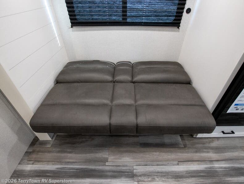 Wherever you decide to camp, you'll be met with comforts each day with this spacious travel trailer. There is a large slide out that will give the dog more space to nap on the floor. Your crew can relax on the jack-knife sofa, play a game at the booth dinette, or visit outdoors under the 16' power awning with LED lights. The outside kitchen is complete with an outdoor refrigerator for cold drinks, and there is an LP Quick Connect if you want to add your own grill. Head inside to clean up in the full bath, then head to bed in the front private bedroom. Here, you'll find a queen bed, dual wardrobes, plus a shelf for books. And your guests can sleep on the double-size bunks and living room furniture!
