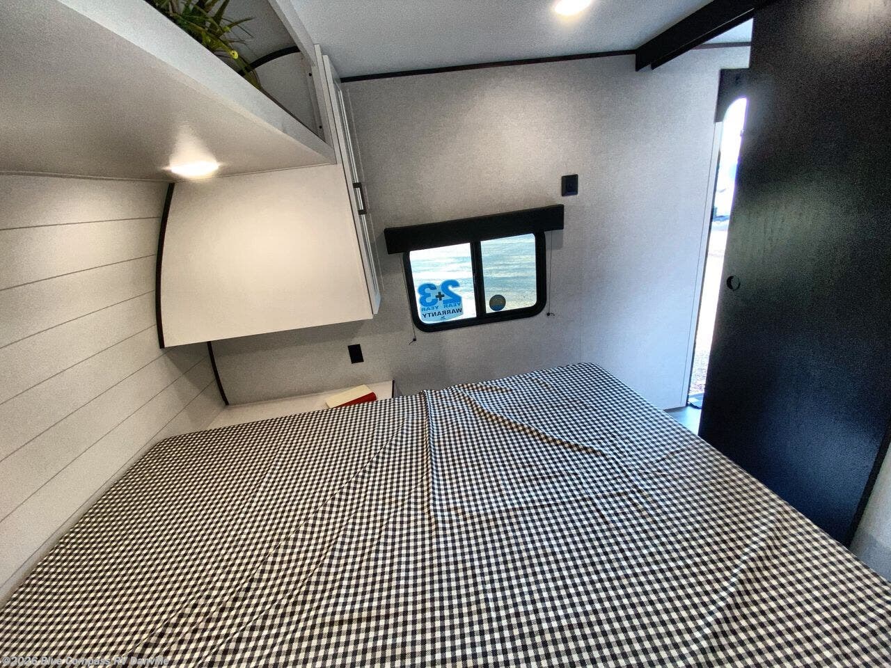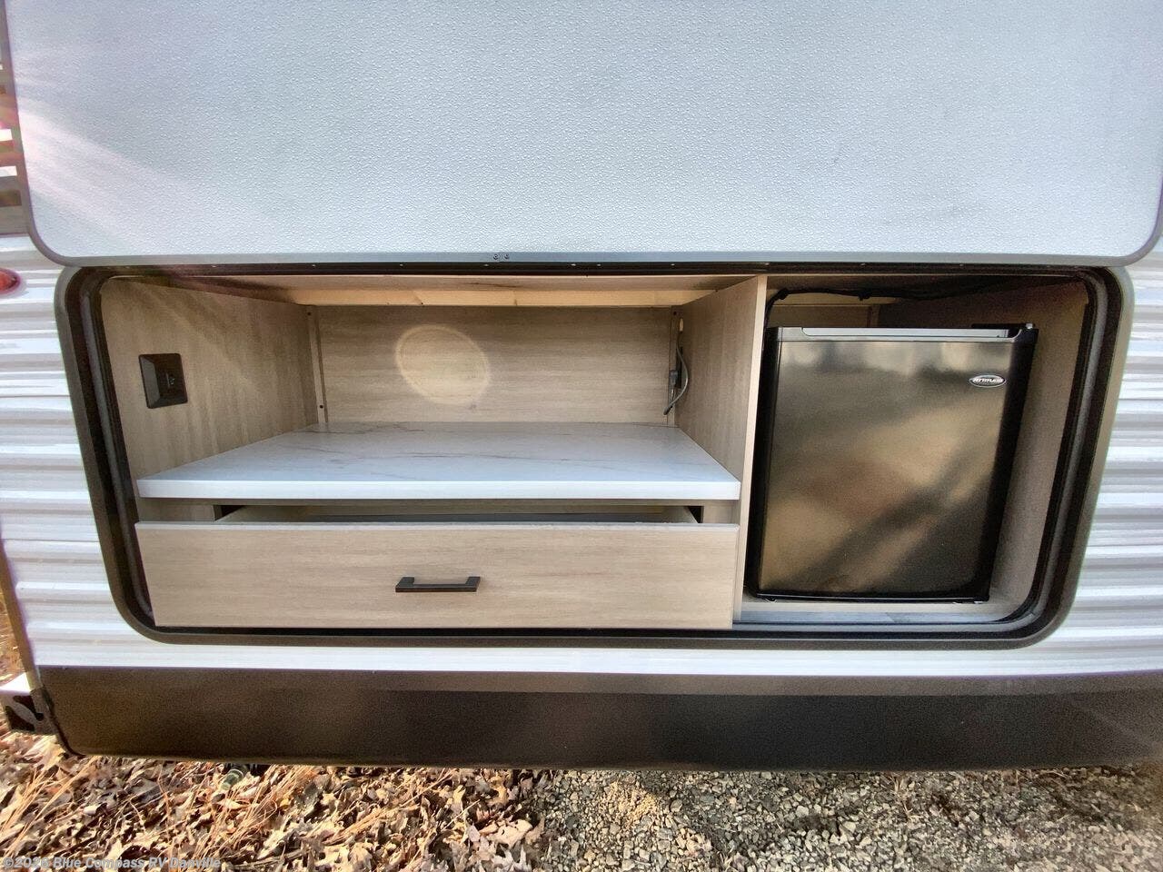 Wherever you decide to camp, you'll be met with comforts each day with this spacious travel trailer. There is a large slide out that will give the dog more space to nap on the floor. Your crew can relax on the jack-knife sofa, play a game at the booth dinette, or visit outdoors under the 16' power awning with LED lights. The outside kitchen is complete with an outdoor refrigerator for cold drinks, and there is an LP Quick Connect if you want to add your own grill. Head inside to clean up in the full bath, then head to bed in the front private bedroom. Here, you'll find a queen bed, dual wardrobes, plus a shelf for books. And your guests can sleep on the double-size bunks and living room furniture!