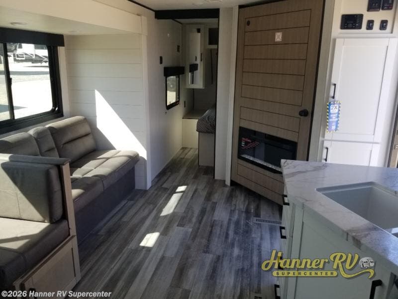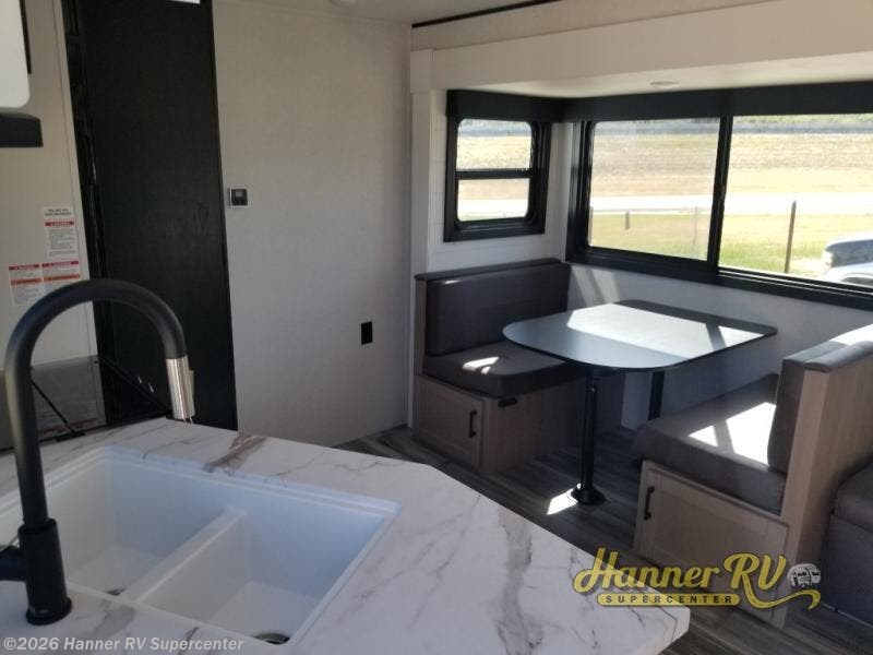 Camping trips just got a whole lot better in this spacious travel trailer for four! You'll love having a private bedroom up front with a queen bed and dual bedside wardrobes, while your guests sleep on the jack-knife sofa and booth dinette within the large slide out. There is a fully-equipped kitchen to make meals each day, plus a hidden pantry with shelves for games and a second pantry to keep snacks stocked. The full rear bath is both spacious and convenient since it's tuck away in the back. Start camping today!