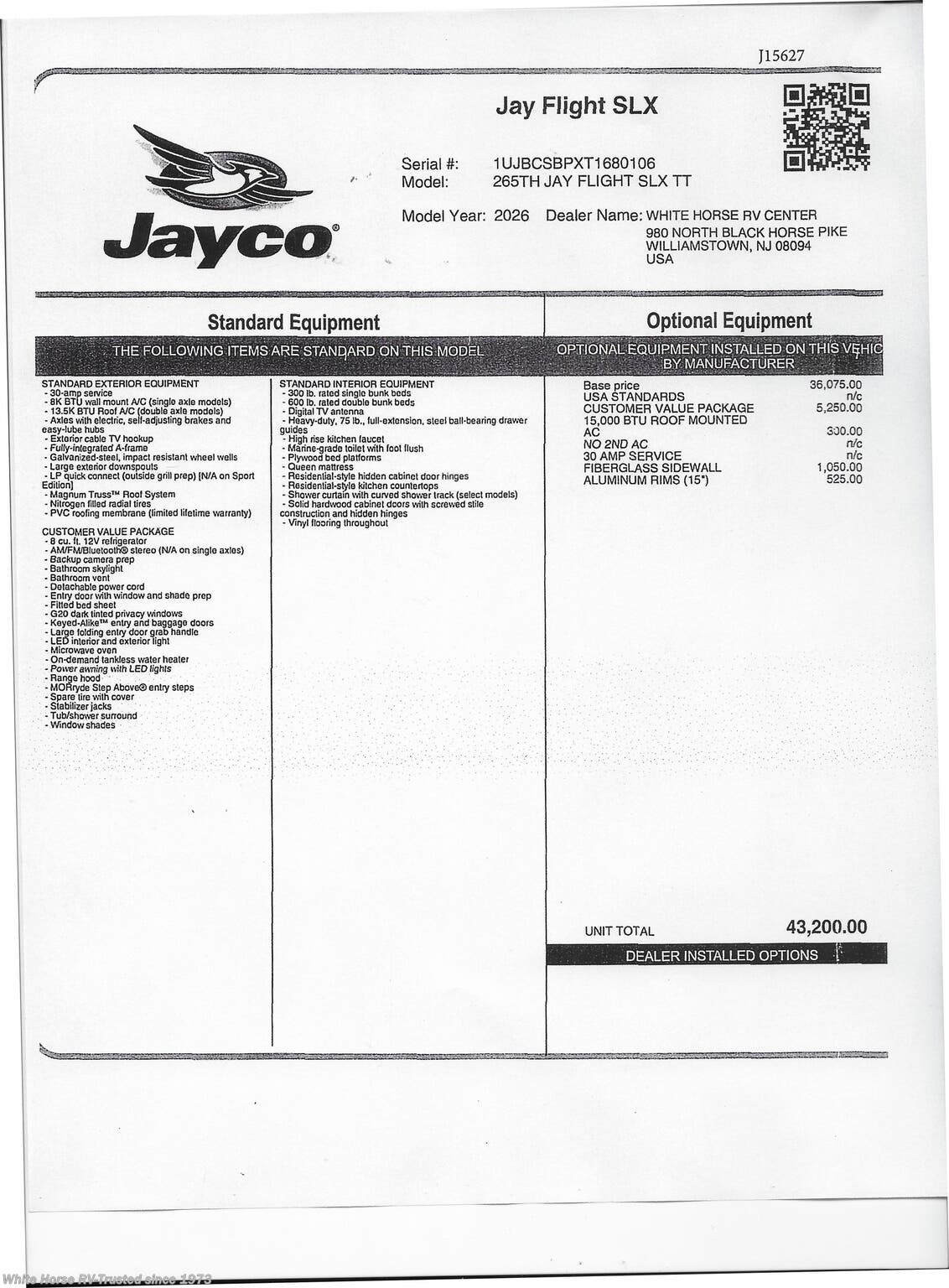 This Stock #J15627 also has the following factory options included: ... Interior Decor Country, 15,000 BTU Roof AC, Fiberglass Sidewalls, & Aluminum Rims , all backed by Jayco’s 2+3-year warranty! MSRP $43,200.