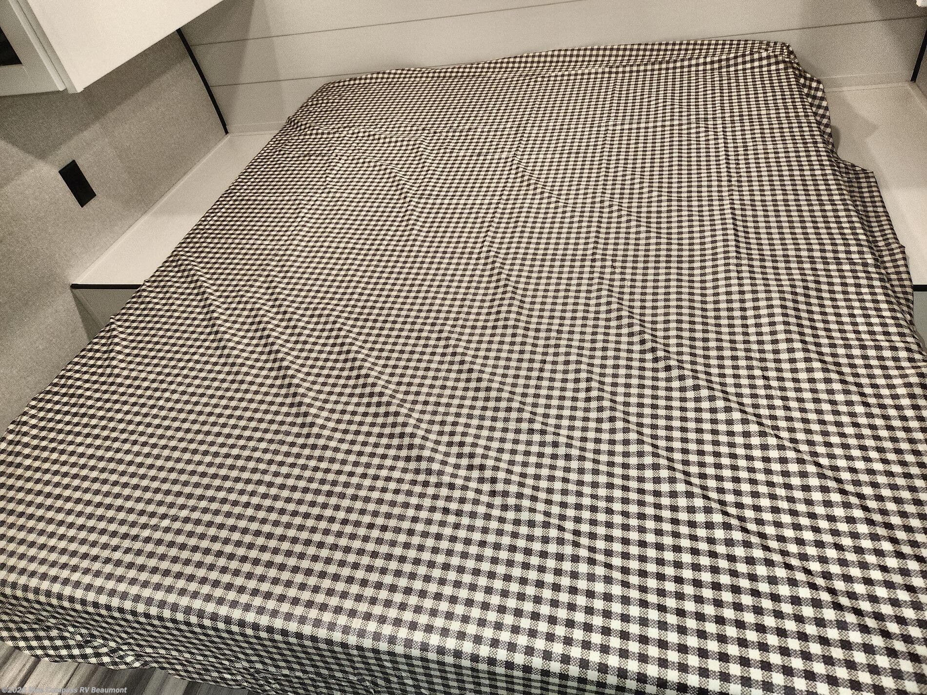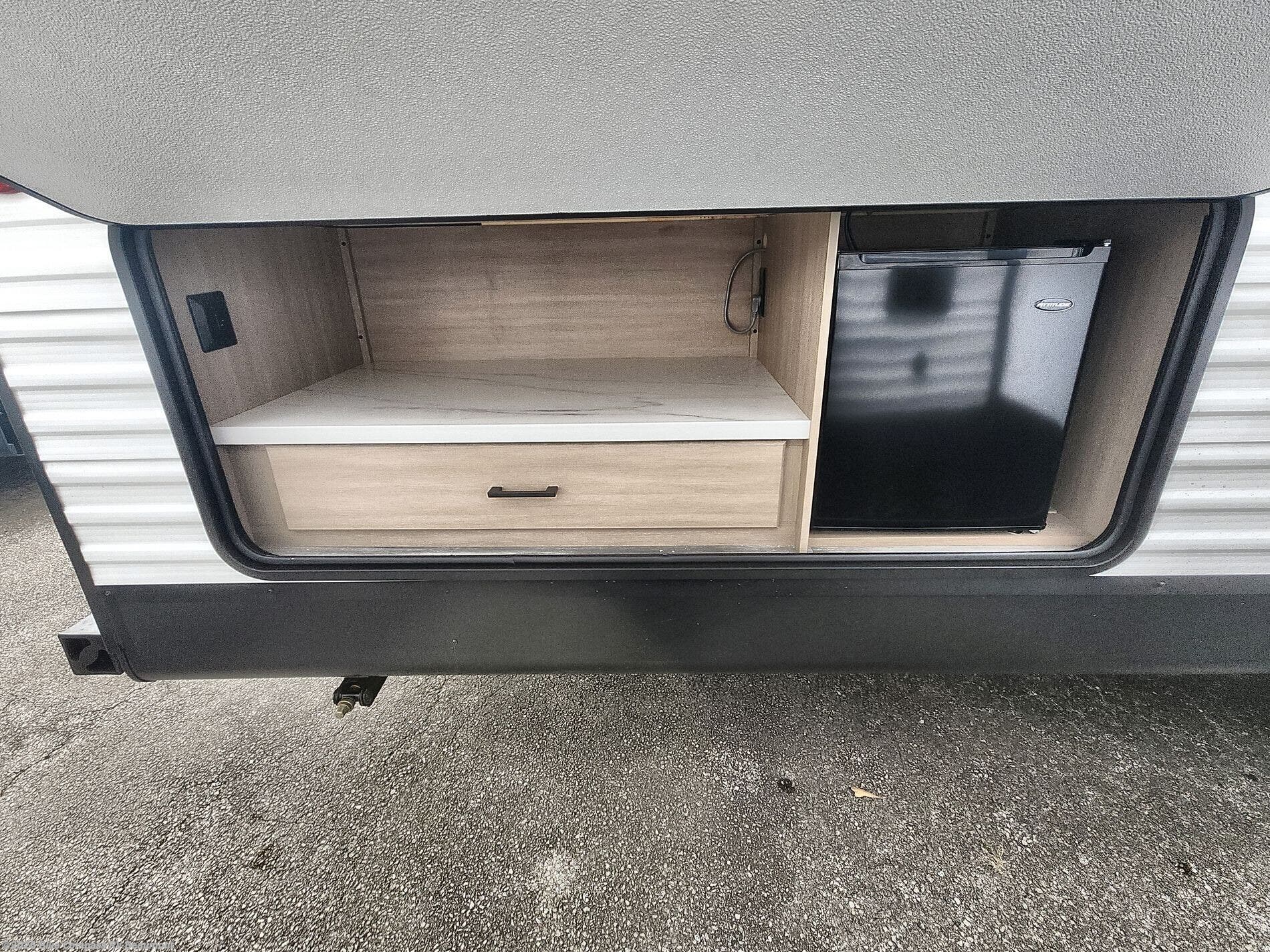 Comfort and fun is waiting for you! This trailer allows the owners to sleep in privacy behind the space saving sliding door on a 60" x 75" queen bed. And the kids or grandkids can sleep on the double-size bunks in the rear next to the full bathroom including a shower. They even have a wardrobe nearby for their things. The slide out jackknife sofa and U-shaped dinette offers more floor space, a place to relax and dine, plus you can play games at the dinette. This model also includes an exterior refrigerator so you can grab a cold drink while under the 16' power awning!