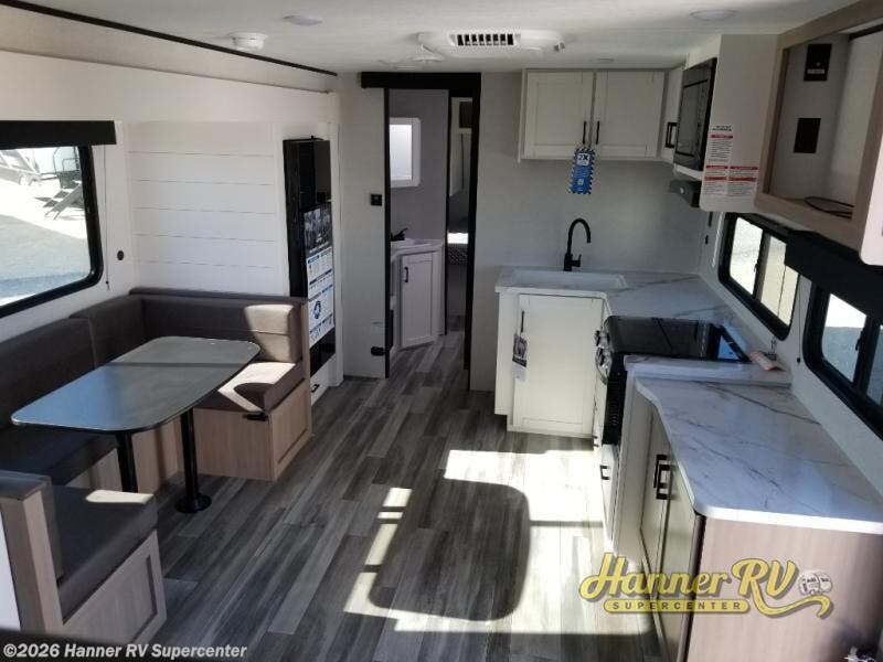 It's time to ditch that old tent and upgrade to this spacious travel trailer! The littles ones or your guests will love the double-size bunks with steps in the back, while you take the front master bedroom. One of the dual entry doors is also found here for convenience, and the walk-through bath is easily accessible for everyone. A U-shaped dinette slide and jack-knife sofa in the main living area provide your crew with space to relax and dine together, and the fully equipped kitchen lets you cook up your best meals. This unit includes ample storage space, including additional kitchen storage, wardrobes, overhead cabinets, and exterior storage!