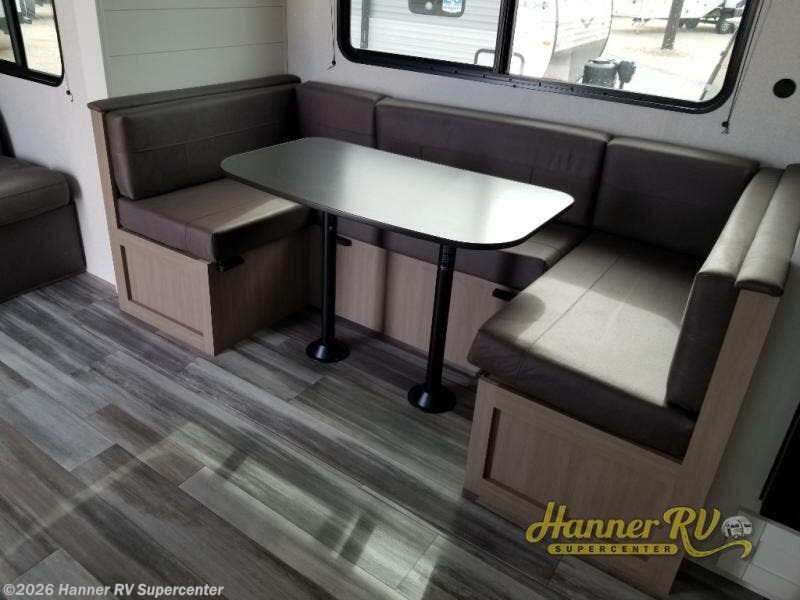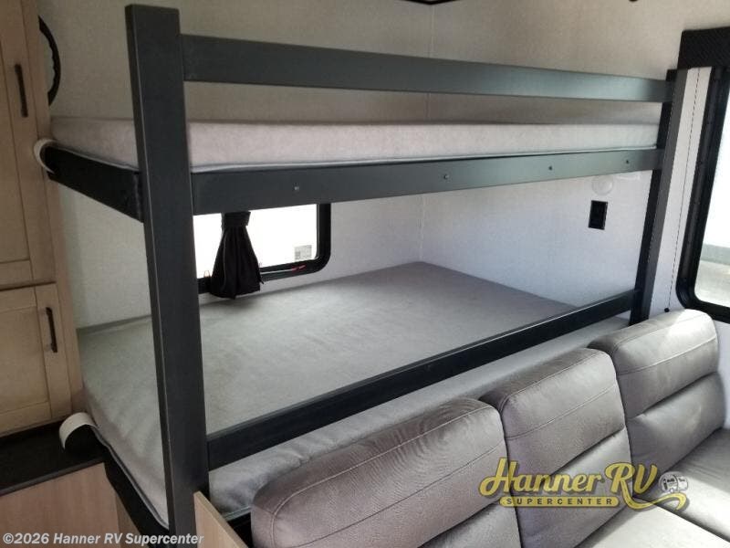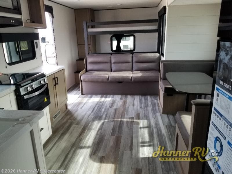 It's time to ditch that old tent and upgrade to this spacious travel trailer! The littles ones or your guests will love the double-size bunks with steps in the back, while you take the front master bedroom. One of the dual entry doors is also found here for convenience, and the walk-through bath is easily accessible for everyone. A U-shaped dinette slide and jack-knife sofa in the main living area provide your crew with space to relax and dine together, and the fully equipped kitchen lets you cook up your best meals. This unit includes ample storage space, including additional kitchen storage, wardrobes, overhead cabinets, and exterior storage!