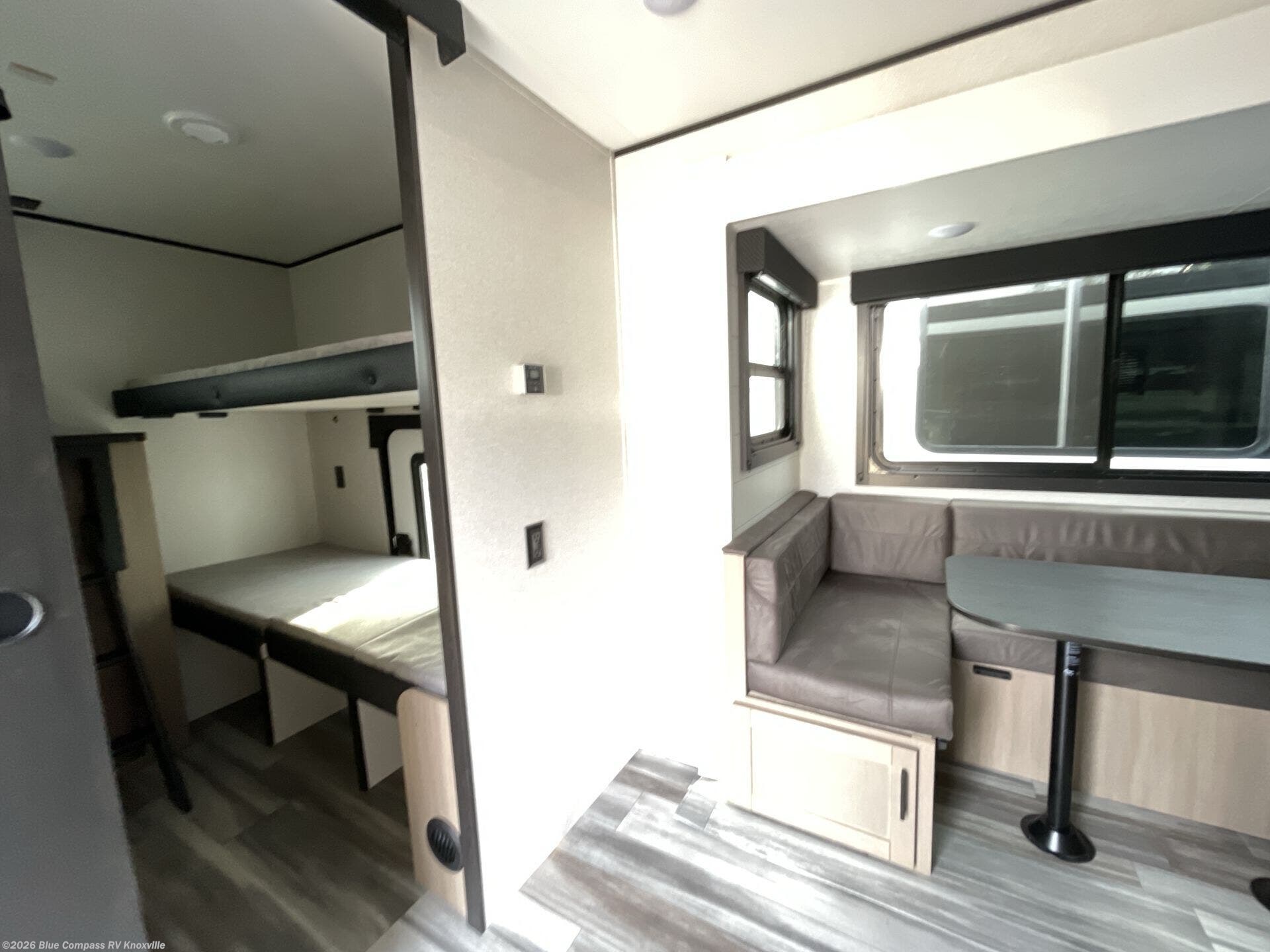 It's time to ditch that old tent and upgrade to this spacious travel trailer! There is a rear private bunkhouse includes a flip-up bunk over a 28" x 76" bunk, plus a bunk across the room and a wardrobe. You'll enjoy the front private bedroom all to yourselves with a queen bed and dual wardrobes, and the full bath is close by for easy nighttime use. A U-shaped dinette slide and sofa in the main living area provide your crew with space to relax and dine together, and the fully equipped kitchen lets you cook up your best meals. Outside, you'll find exterior storage, an 18' power awning, plus an outdoor refrigerator, shelf, and TV prep!