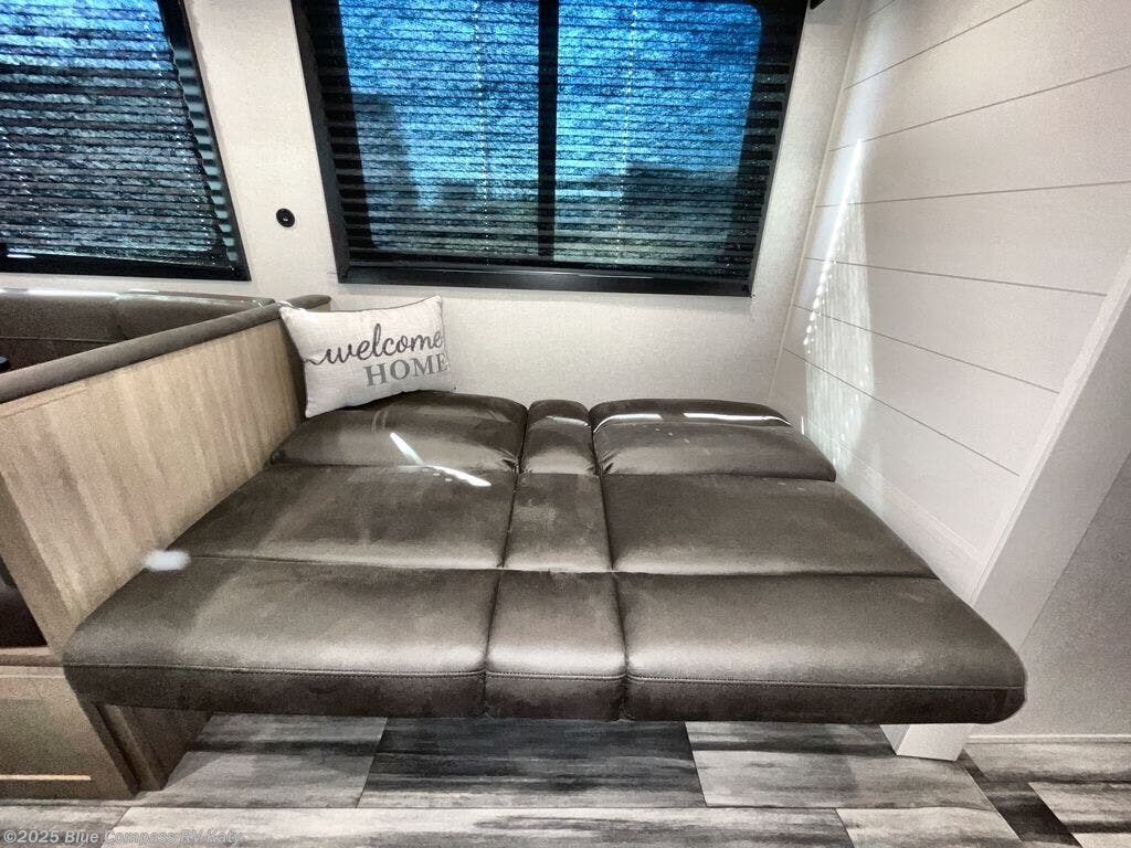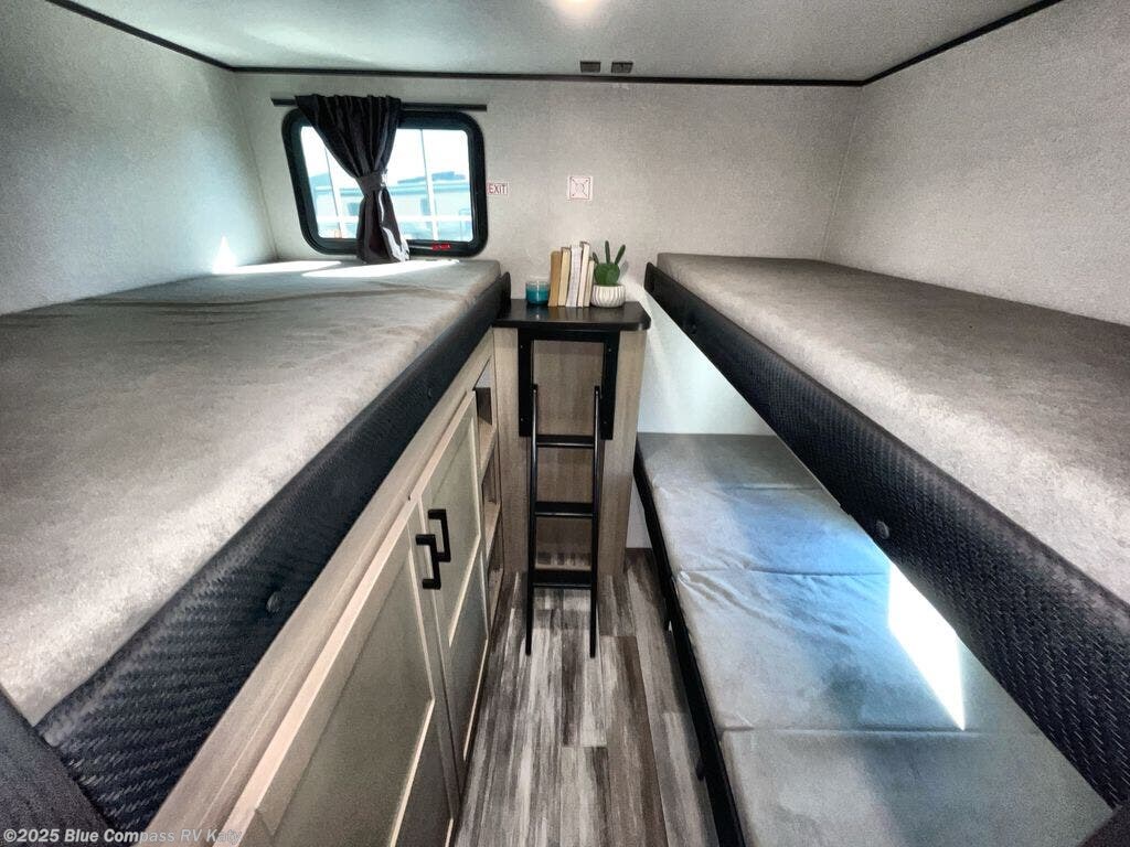 It's time to ditch that old tent and upgrade to this spacious travel trailer! There is a rear private bunkhouse includes a flip-up bunk over a 28" x 76" bunk, plus a bunk across the room and a wardrobe. You'll enjoy the front private bedroom all to yourselves with a queen bed and dual wardrobes, and the full bath is close by for easy nighttime use. A U-shaped dinette slide and sofa in the main living area provide your crew with space to relax and dine together, and the fully equipped kitchen lets you cook up your best meals. Outside, you'll find exterior storage, an 18' power awning, plus an outdoor refrigerator, shelf, and TV prep!