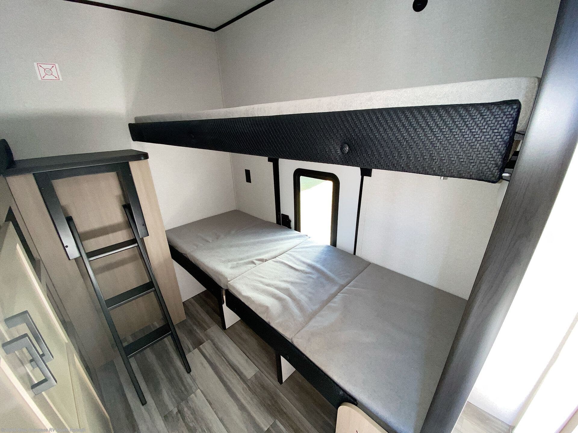 It's time to ditch that old tent and upgrade to this spacious travel trailer! There is a rear private bunkhouse includes a flip-up bunk over a 28" x 76" bunk, plus a bunk across the room and a wardrobe. You'll enjoy the front private bedroom all to yourselves with a queen bed and dual wardrobes, and the full bath is close by for easy nighttime use. A U-shaped dinette slide and sofa in the main living area provide your crew with space to relax and dine together, and the fully equipped kitchen lets you cook up your best meals. Outside, you'll find exterior storage, an 18' power awning, plus an outdoor refrigerator, shelf, and TV prep!