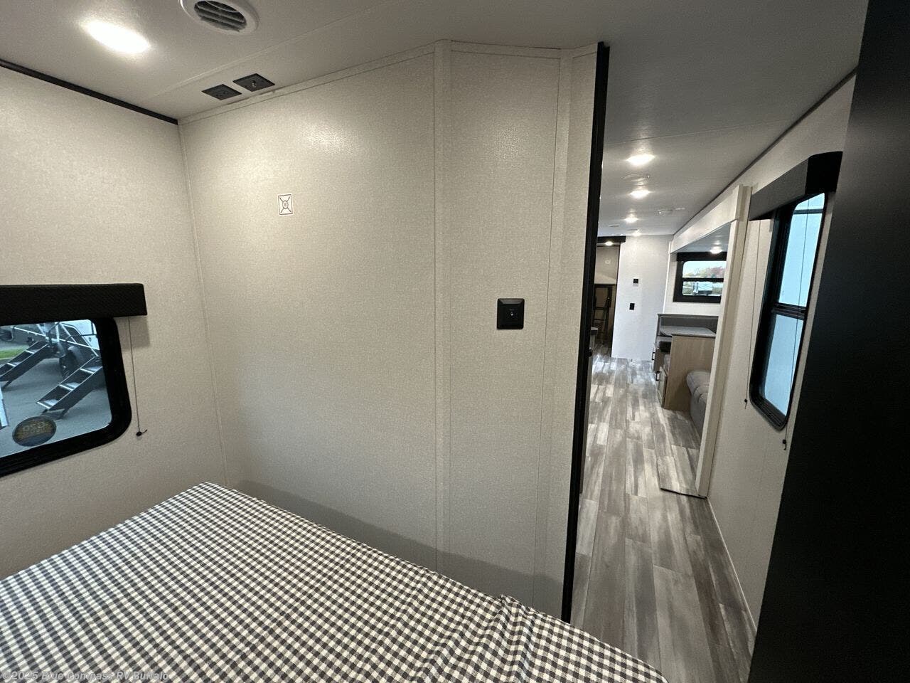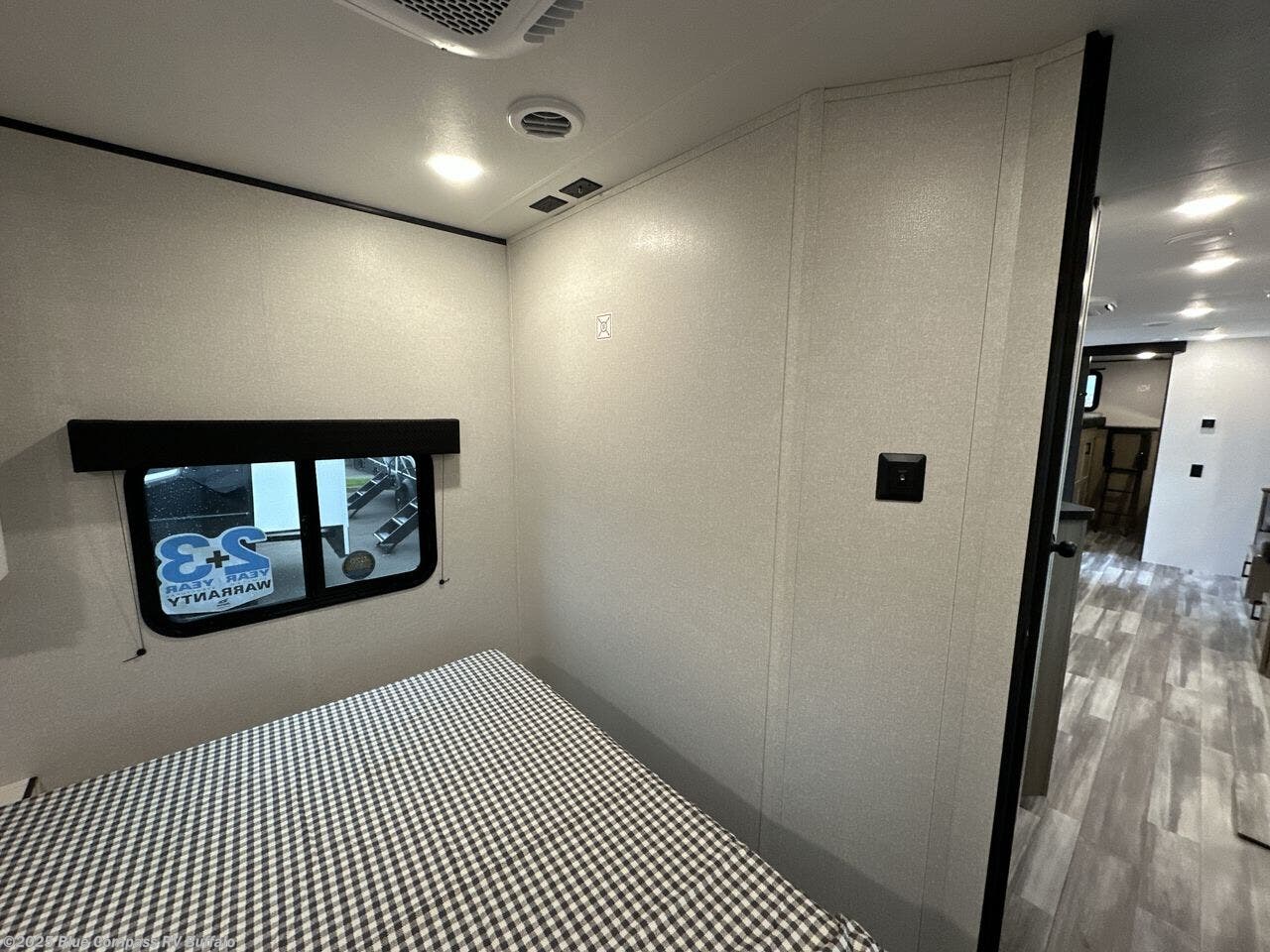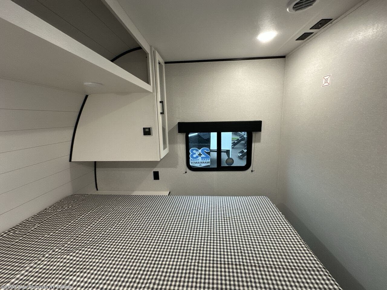 It's time to ditch that old tent and upgrade to this spacious travel trailer! There is a rear private bunkhouse includes a flip-up bunk over a 28" x 76" bunk, plus a bunk across the room and a wardrobe. You'll enjoy the front private bedroom all to yourselves with a queen bed and dual wardrobes, and the full bath is close by for easy nighttime use. A U-shaped dinette slide and sofa in the main living area provide your crew with space to relax and dine together, and the fully equipped kitchen lets you cook up your best meals. Outside, you'll find exterior storage, an 18' power awning, plus an outdoor refrigerator, shelf, and TV prep!